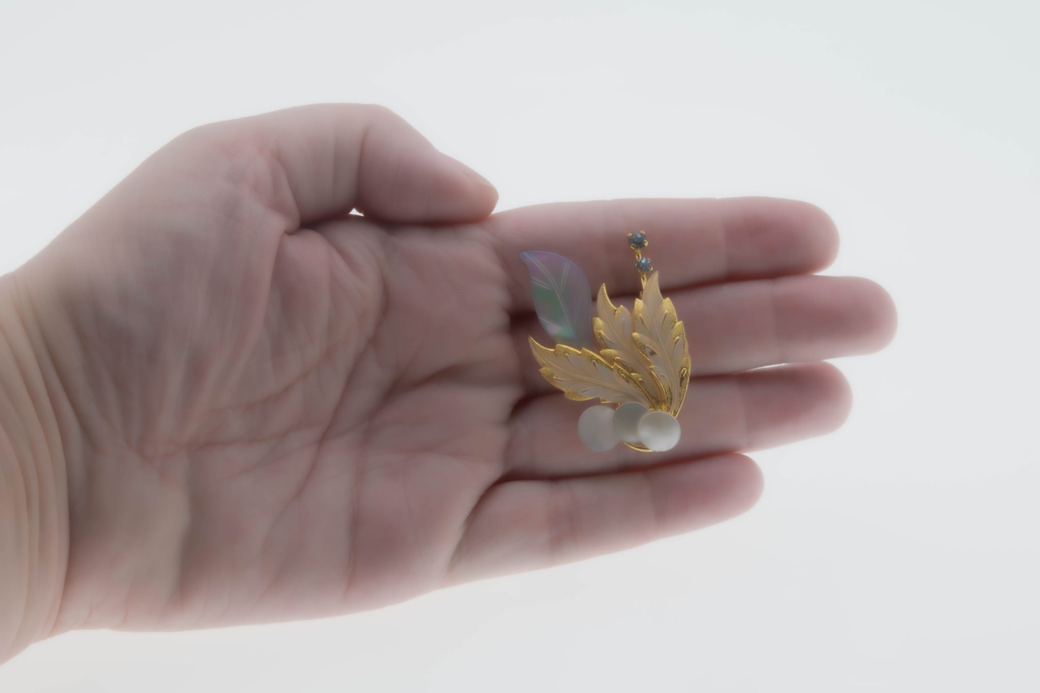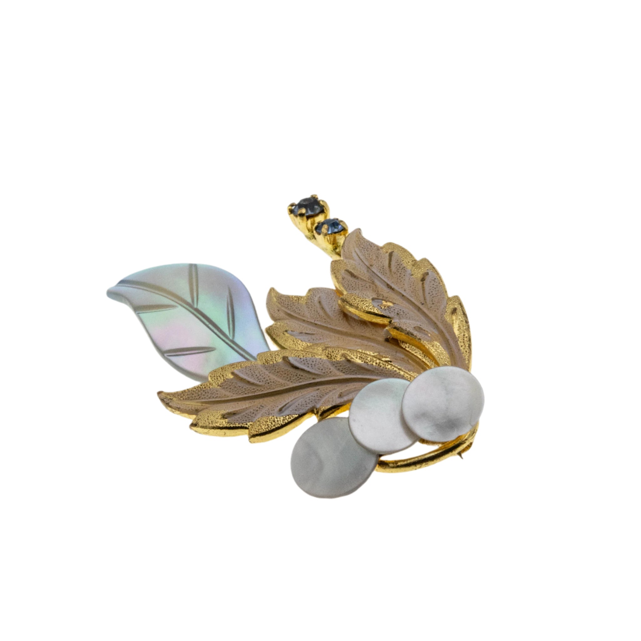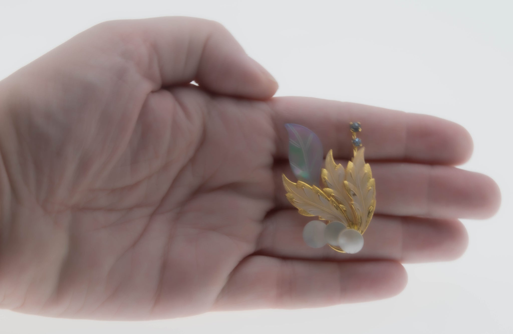 Sea & Earth - Vintage Gold Plated Mother Of Pearl Crystal Rhinestone Leaf Brooch. This pretty brooch is crafted from gold plated over metal. The brooch features 3 genuine mother of pearl discs, one genuine carved mother of pearl leaf, two round cut crystal rhinestones, vintage styling, and quality craftsmanship. This lovely brooch is comprised of gold plated leaves, with a white wash finish. Which is adorned my beautiful iridescent mother of pearl gems, and sky blue sparkling crystal rhinestones. The brooch has a pin on the back with a secure rotary lock mechanism, in perfect working order. This vintage brooch would make a wonderful gift or addition to any costume jewelry collection.