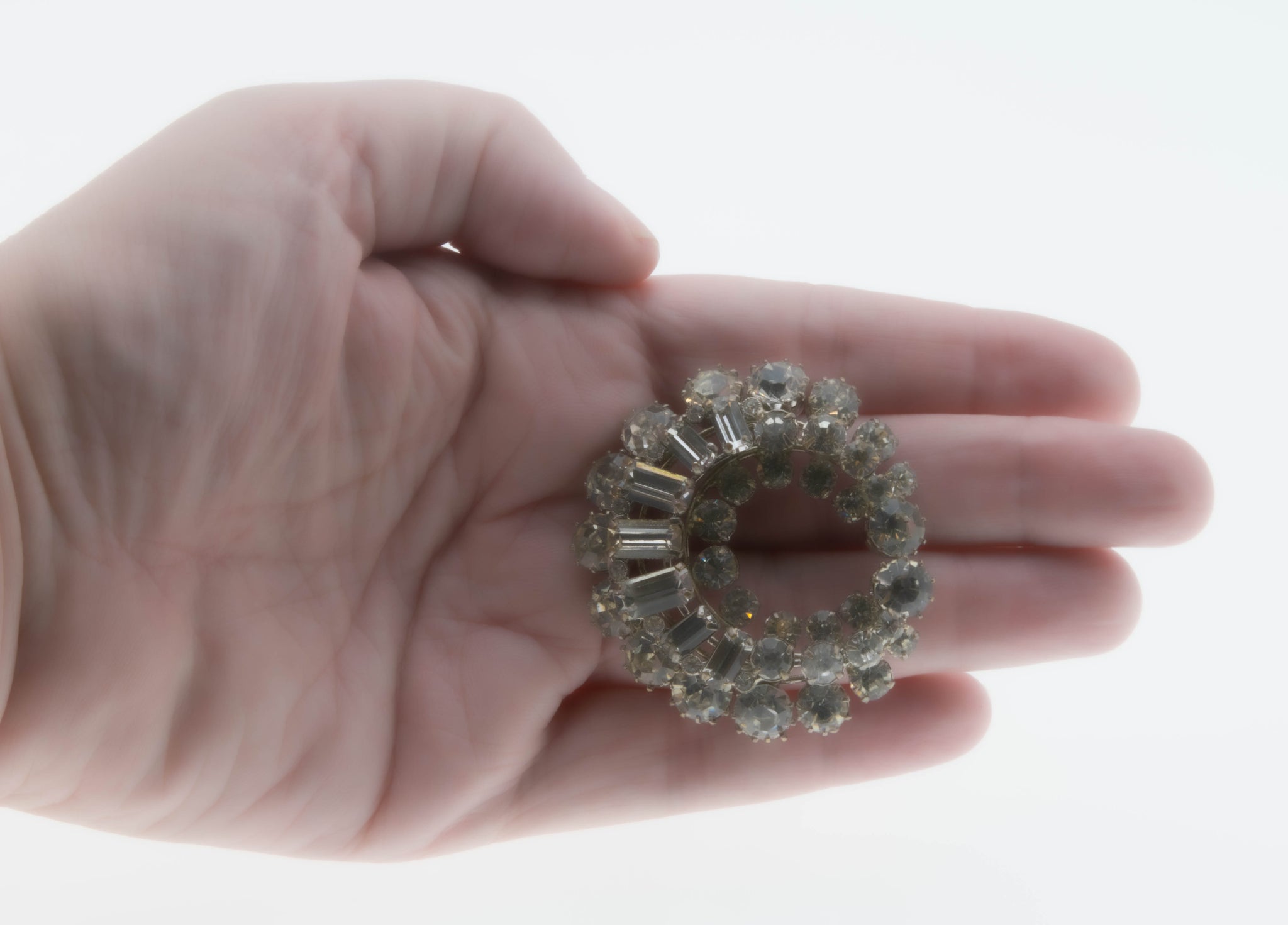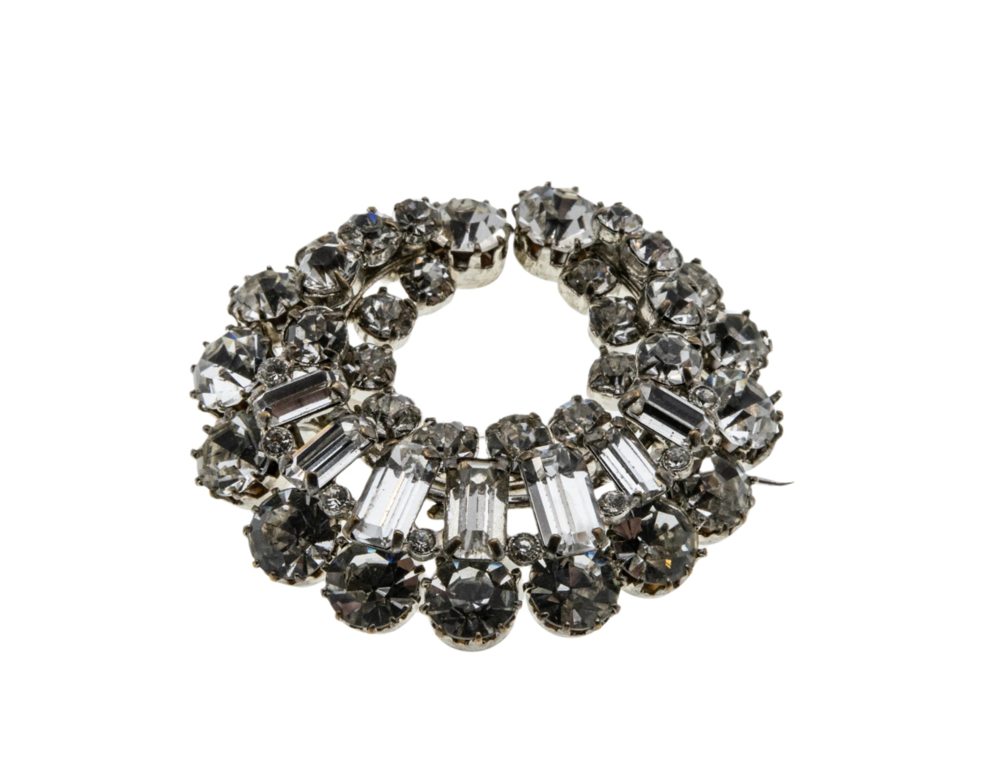 Sparkling Crescent Moon - Vintage Silver Tone Metal Crystal Rhinestone Brooch. This gorgeous brooch is crafted from a silver tone metal. The brooch features numerous emerald cut and round cut crystal rhinestones, vintage styling, and quality craftsmanship. This lovely brooch is designed as a stylized crescent moon, which is adorned with beautiful sparkling crystal rhinestones. The brooch is dimensional, which adda beauty and definition to the piece. The brooch has its original pin and rotary locking mechanism, which is in perfect working order. This vintage brooch would look stunning on your favourite coat, jacket, dress or shawl. So elegant and glamorous.