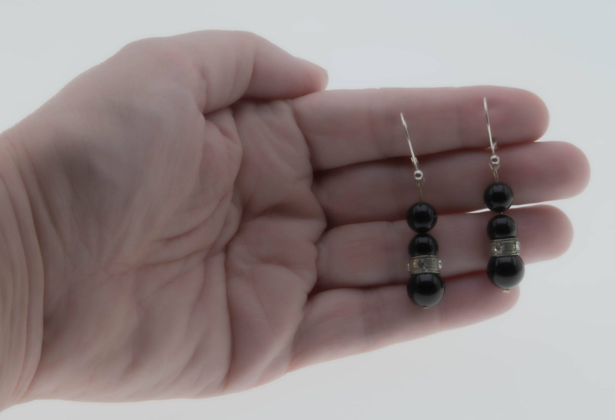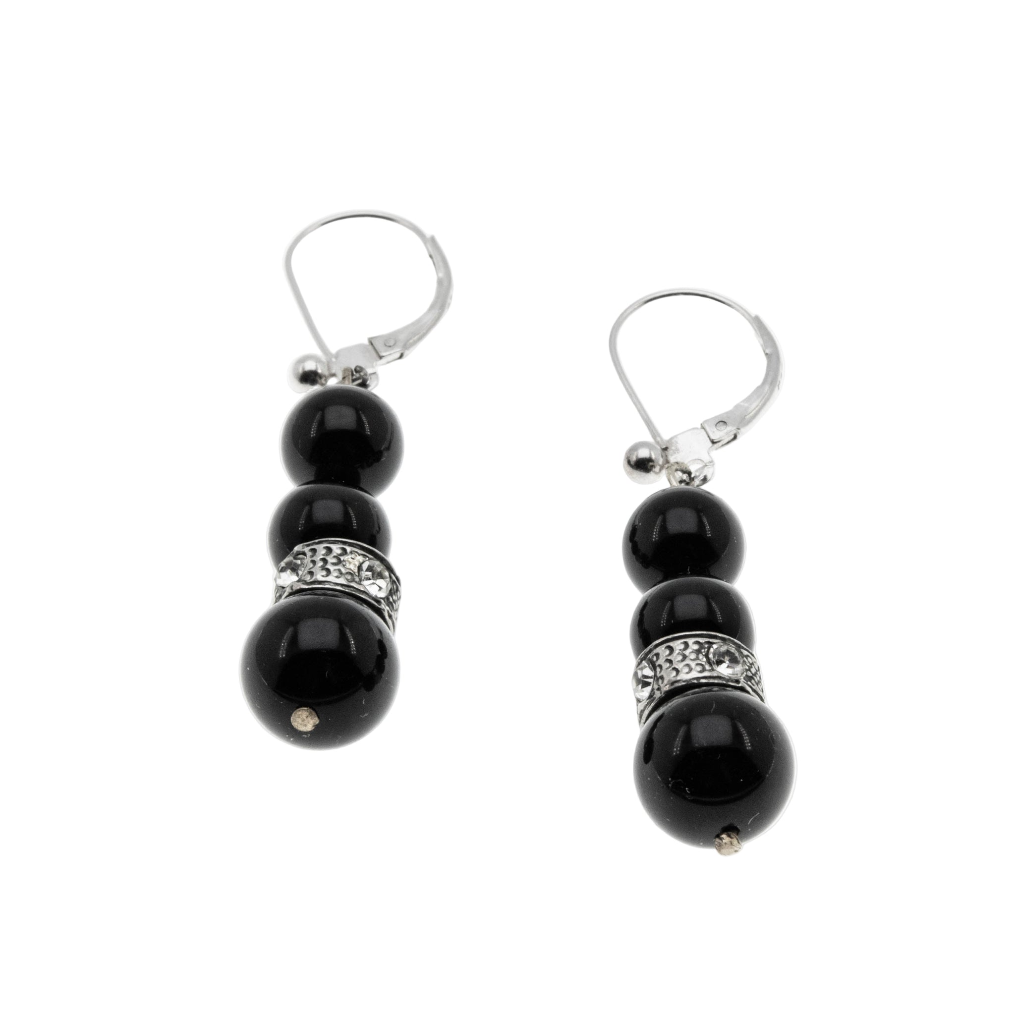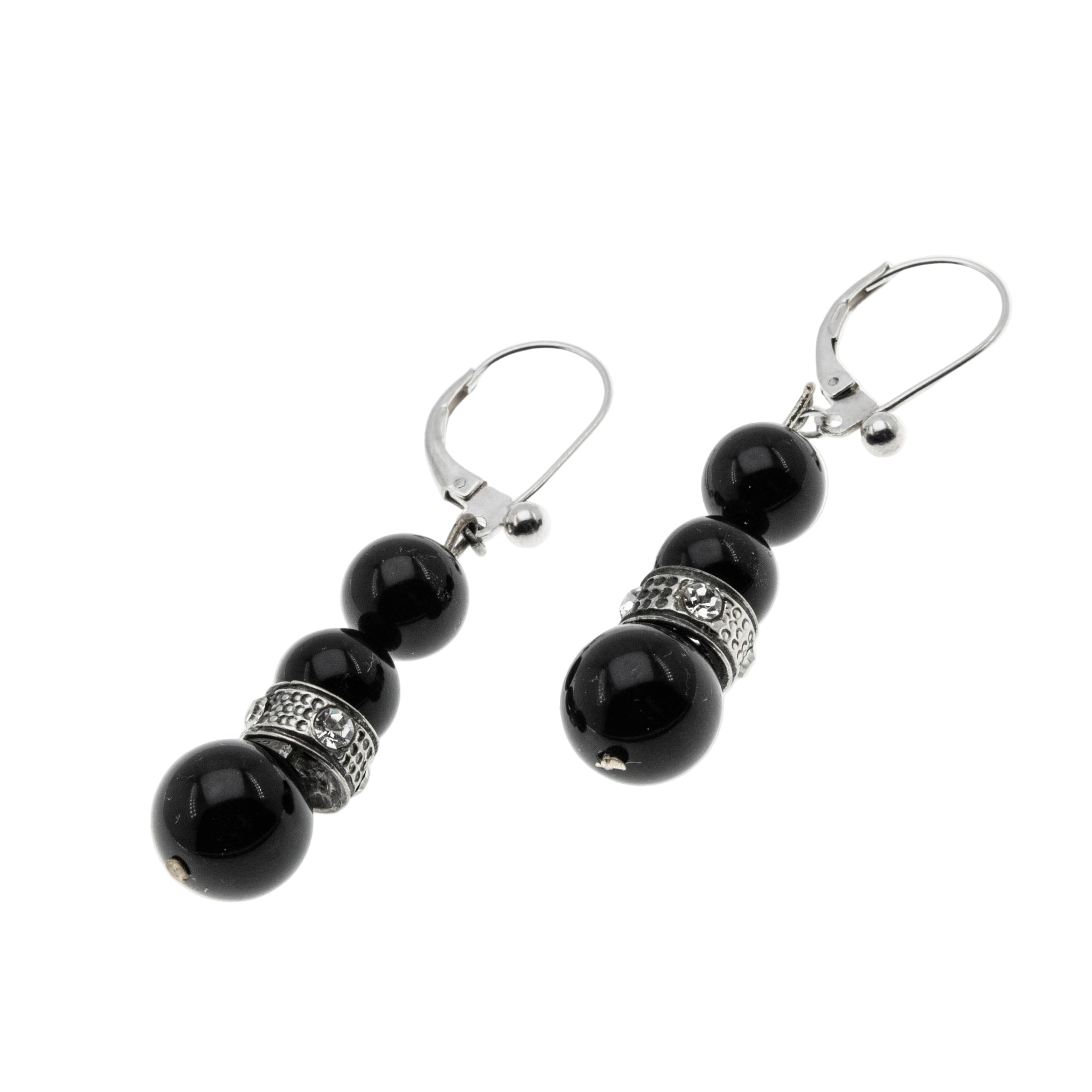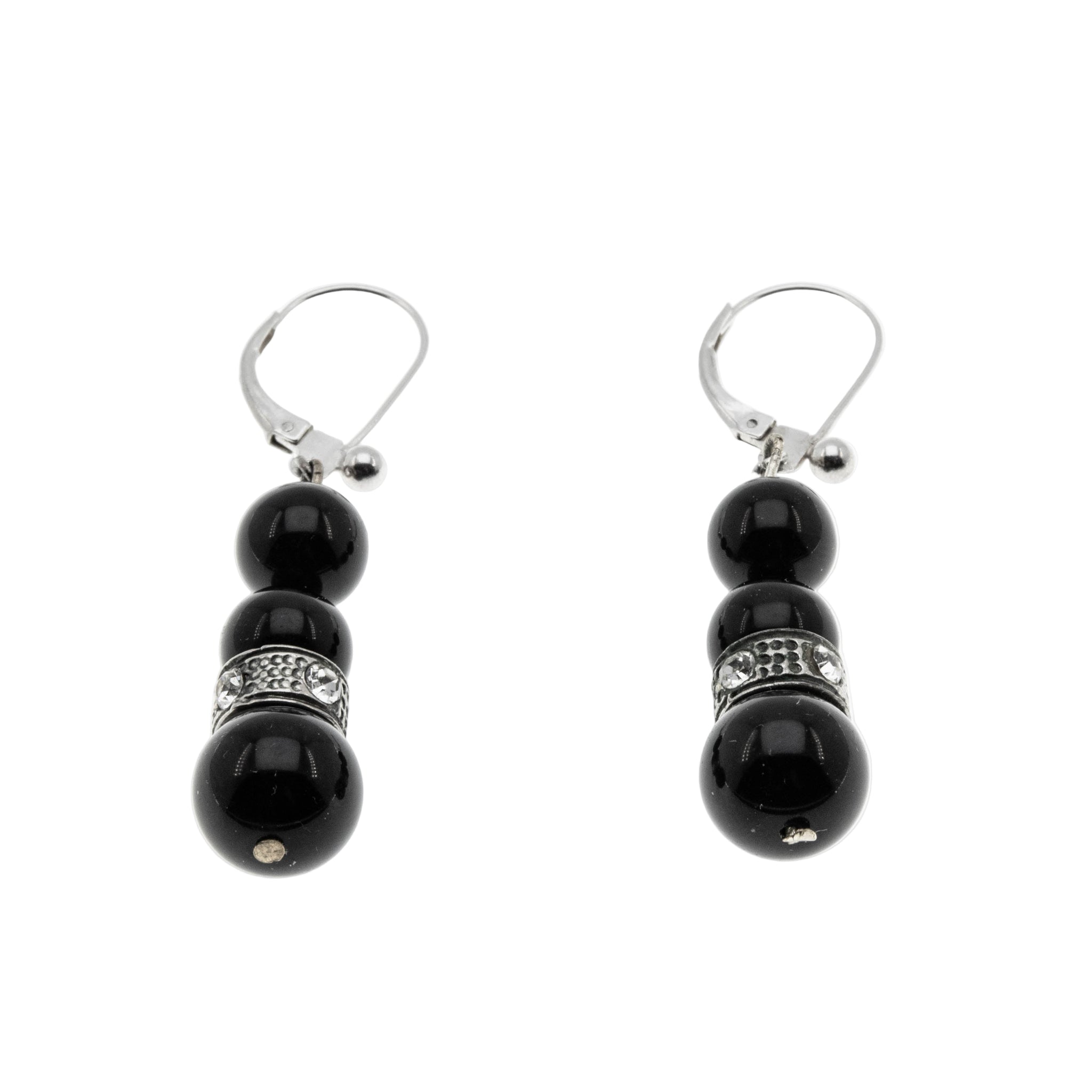 Black & White - Art Deco French Sterling Silver Black Glass & Crystal Rhinestone Dangly Earrings. These elegant earrings are crafted from sterling silver, and brass, hallmarked 925 for sterling silver. The earrings feature 6 glass beads, 8 round cut faceted crystal rhinestones, Art Deco era styling, and quality craftsmanship. These earrings are comprised of a brass wire, which is threaded with onyx black beads, and a silver decorative ring, which is adorned by sparkling crystal rhinestones. The earrings are designed for pierced ears, featuring sterling silver French leaver-backs, which were changed over at one point from brass screw backs. The French lever-backs allow for easy wearing and a comfortable fit. These Art Deco era beauties are perfect for day or night wear.