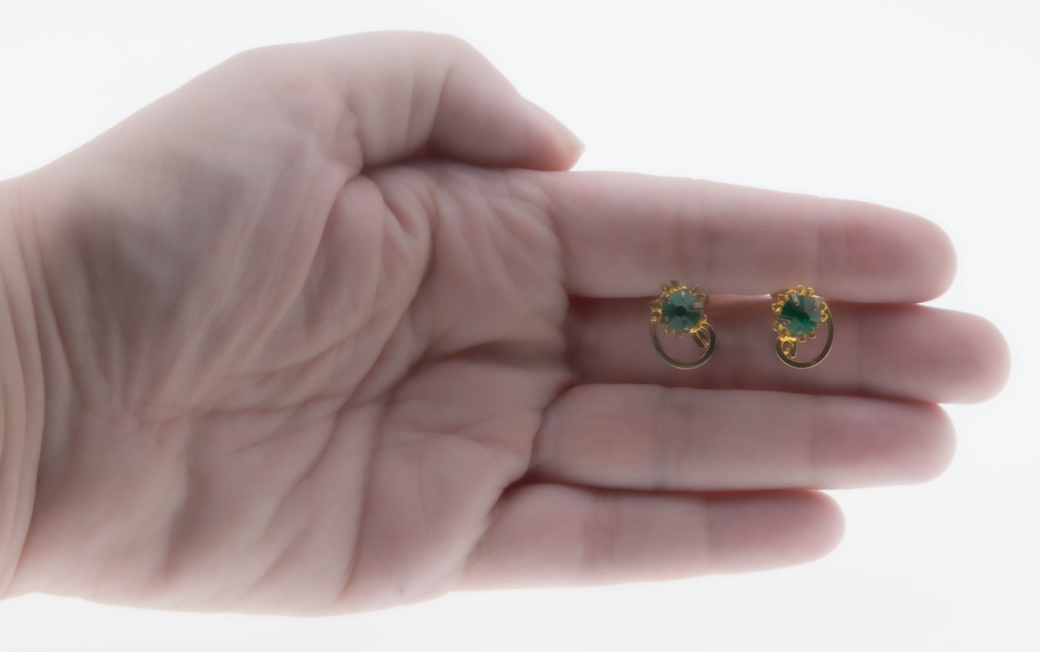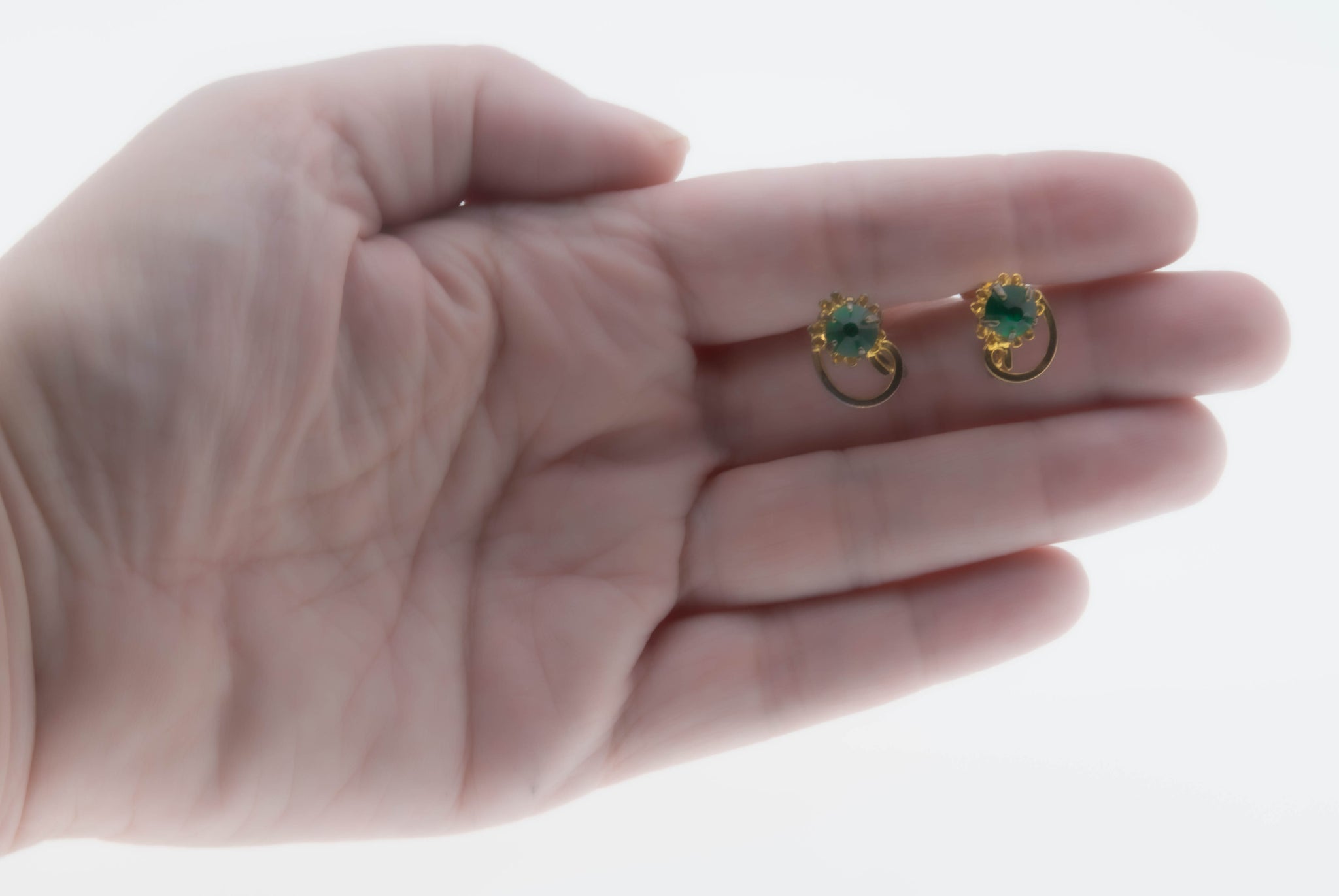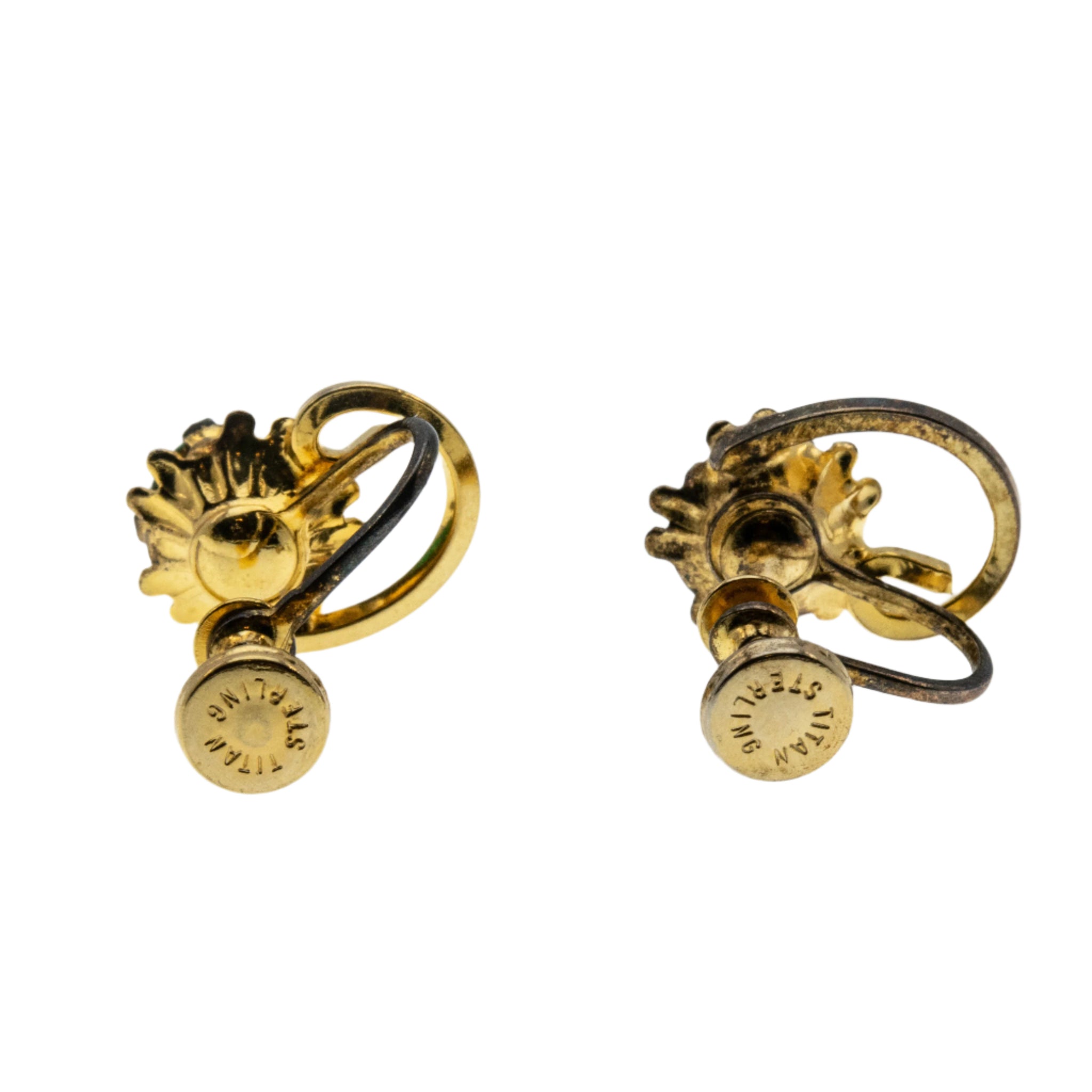 Greener Than Green - Vintage Signed 'Titan Sterling' Gold Plate Over Sterling Silver Emerald Green Crystal Rhinestone Screw Back Earrings. These pretty earrings are crafted from gold Plate over sterling silver, hallmarked TITAN STERLING. Featuring two round shaped faceted crystal rhinestones, and vintage classic styling. These lovely earrings are claw-set with a sparkling emerald green crystal rhinestones, and a pretty swirl surround. The earrings are for pierced and non pierced ears, featuring the original screw back earring backs. The vintage earrings would make a perfect gift or addition to any costume jewelry collection.