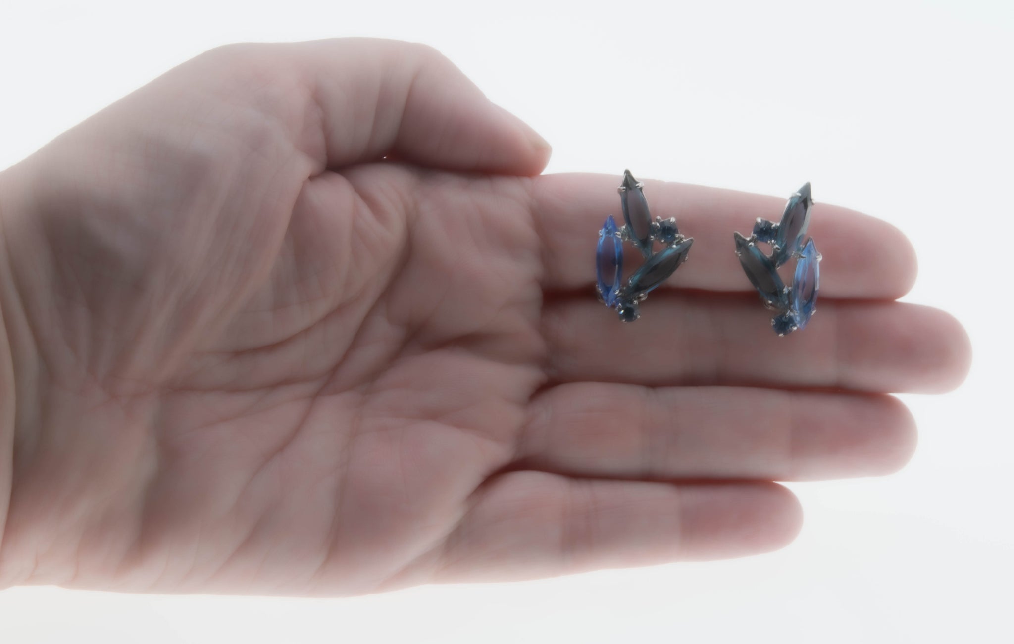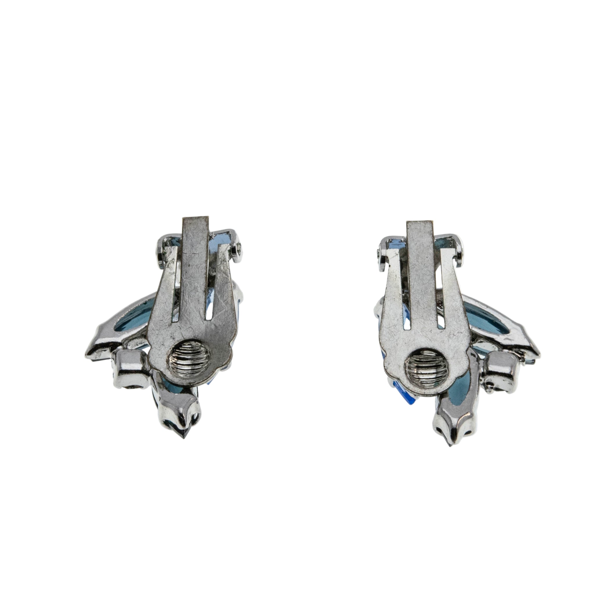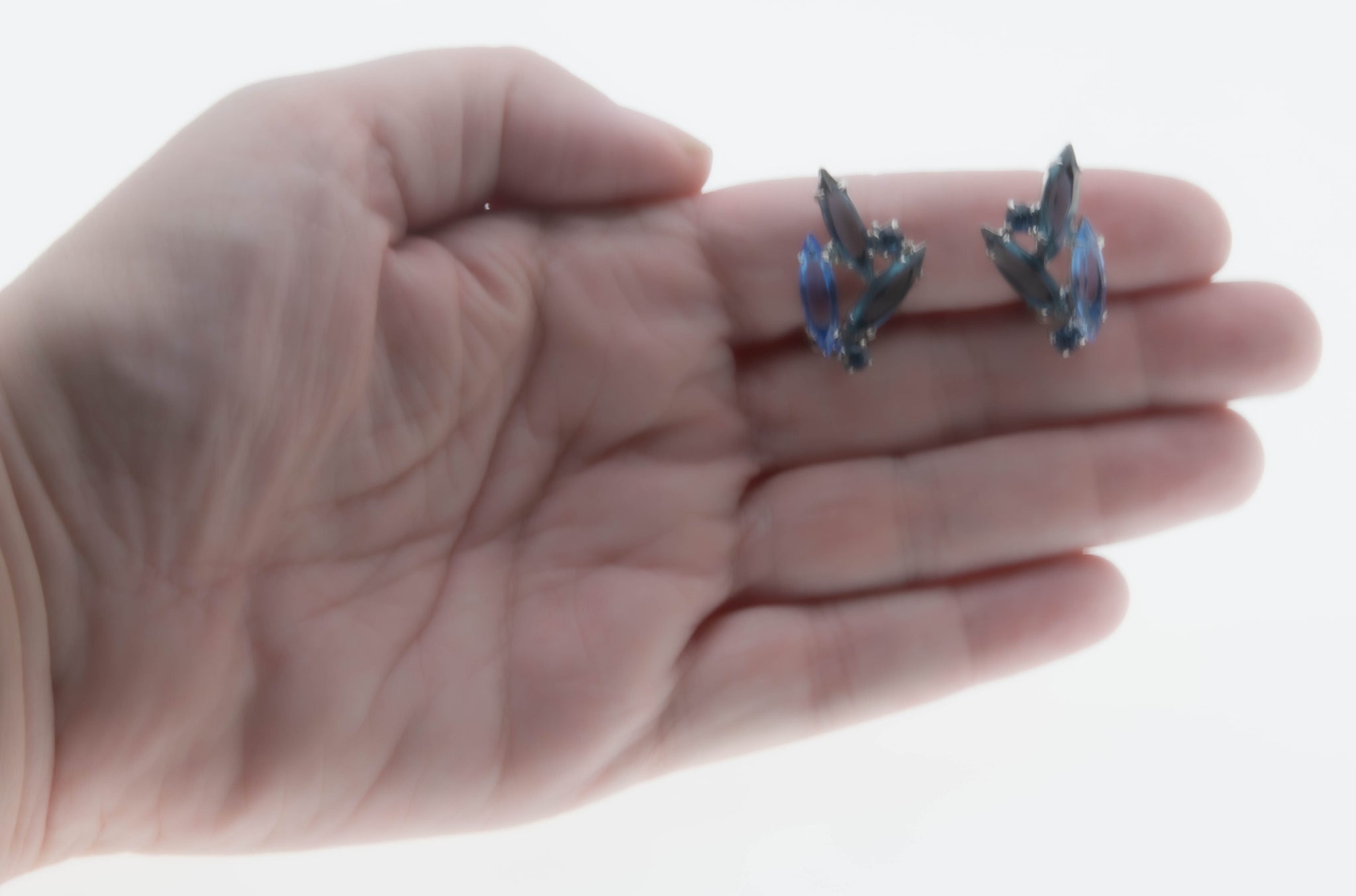 Shades Of Blue - Vintage Rhodium Plated Crystal Rhinestone Clip-On Earrings. These gorgeous earrings are crafted from rhodium plate over metal. Featuring marquise cut, and round cut crystal rhinestones, vintage styling, and quality craftsmanship. These gorgeous earrings are expertly claw-set with beautiful French blue (smoky grey blue) and teal blue sparkling crystals. They are for pierced and non pierced ears, and feature secure clip on backings. These vintage earrings are high quality, and in very fine condition, truly a beautiful special occasion piece to be cherished and enjoyed for many years to come.