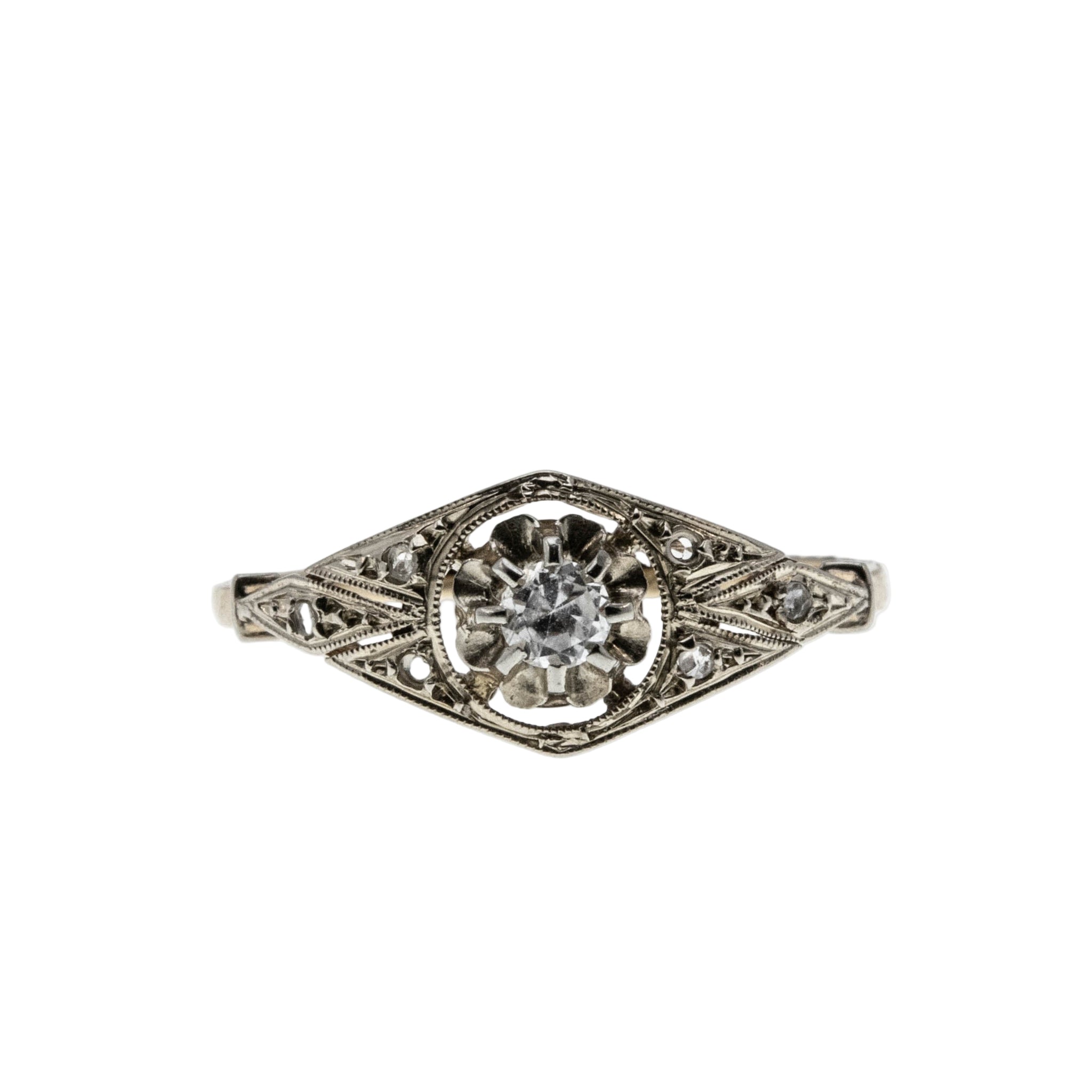 Stone Size: Diamond (Old European Cut) .10 carats Rose Cut Diamonds .06 Total Diamond Weight: .16 carats