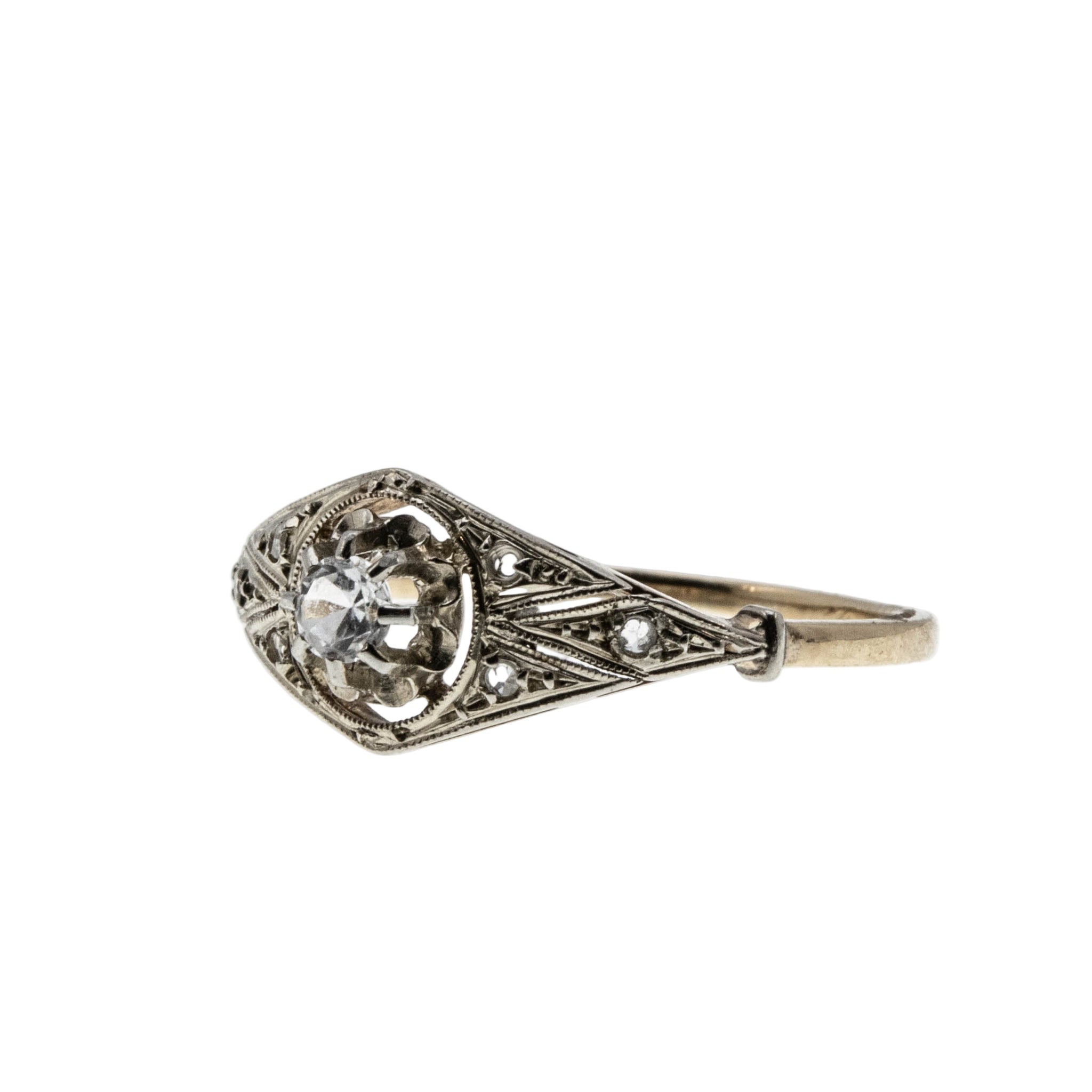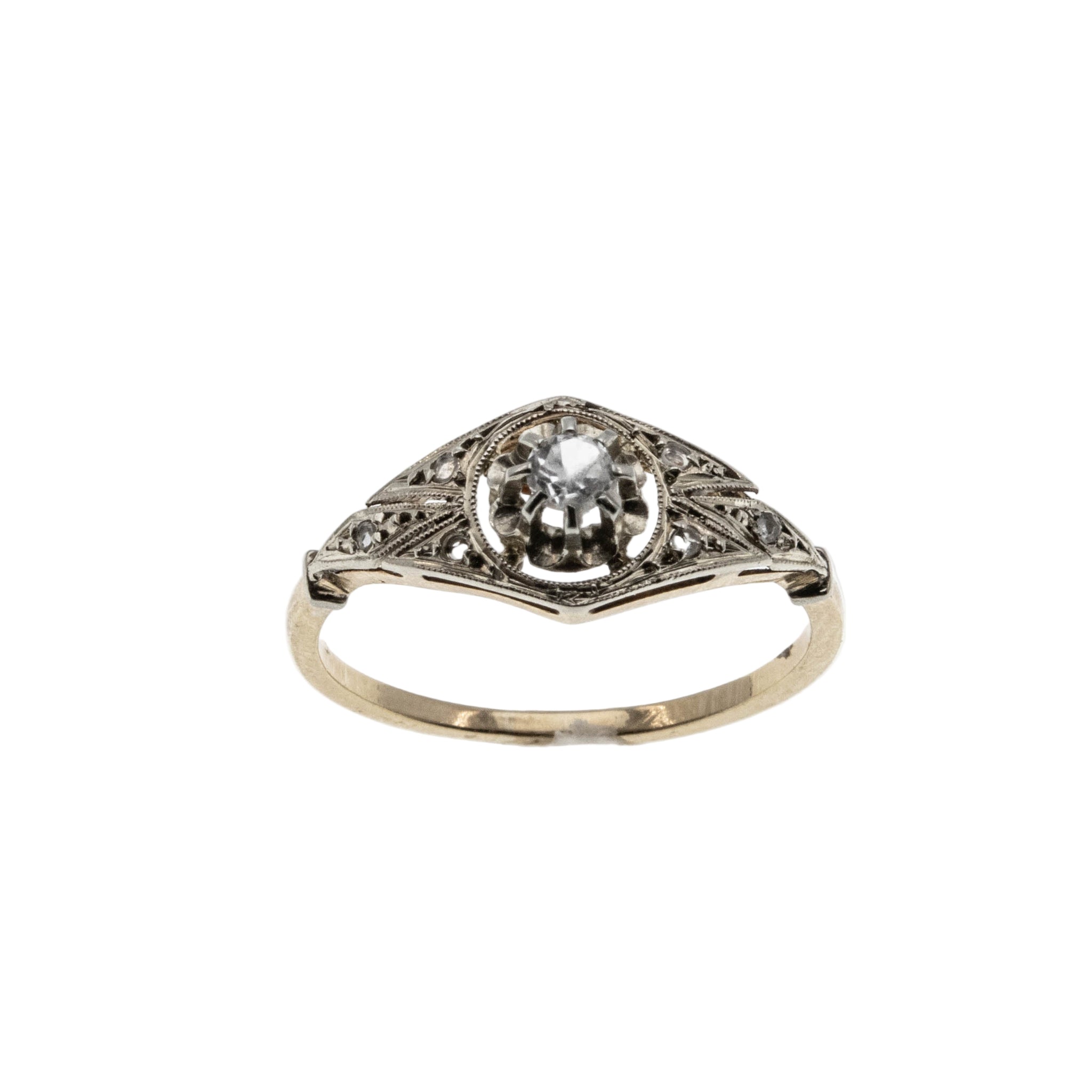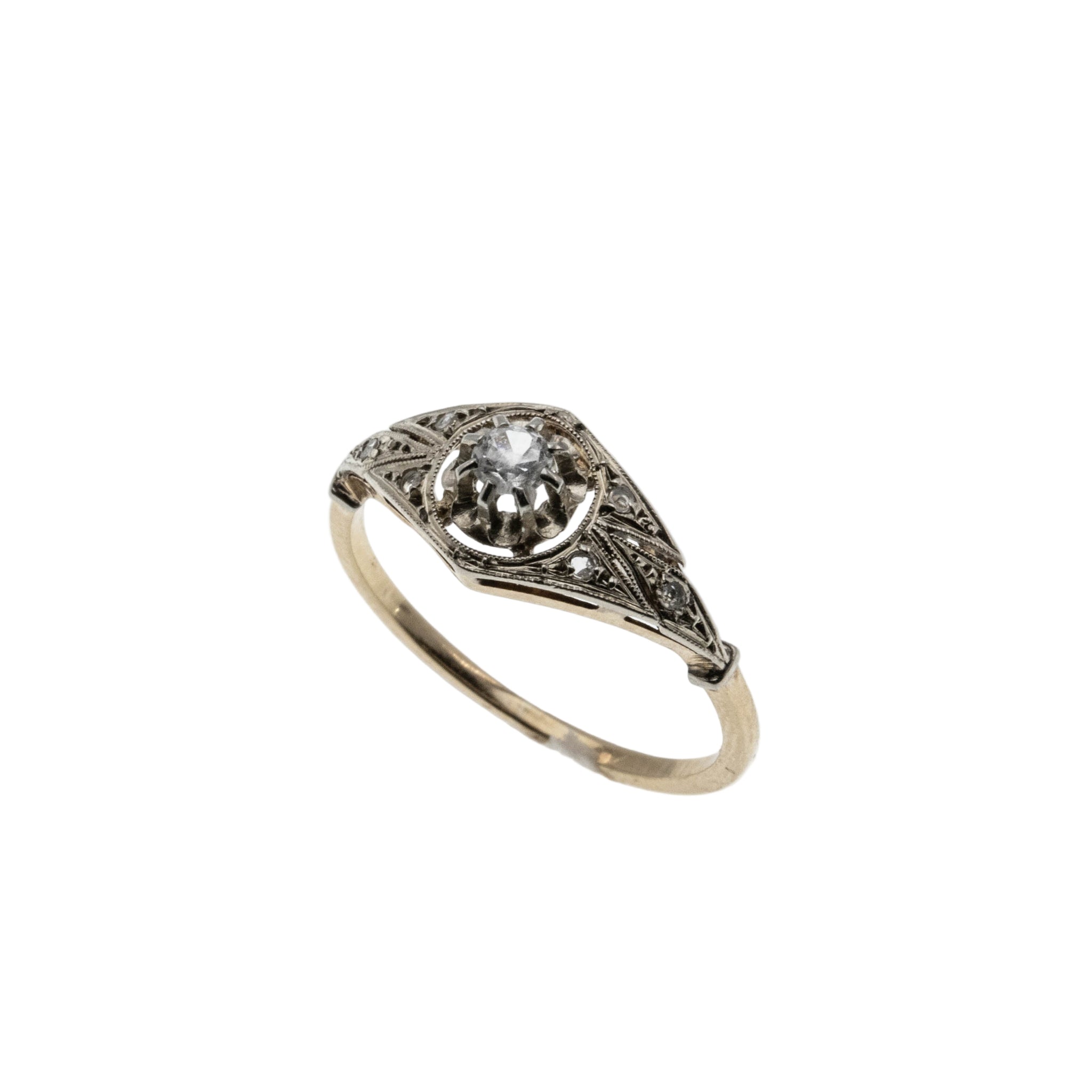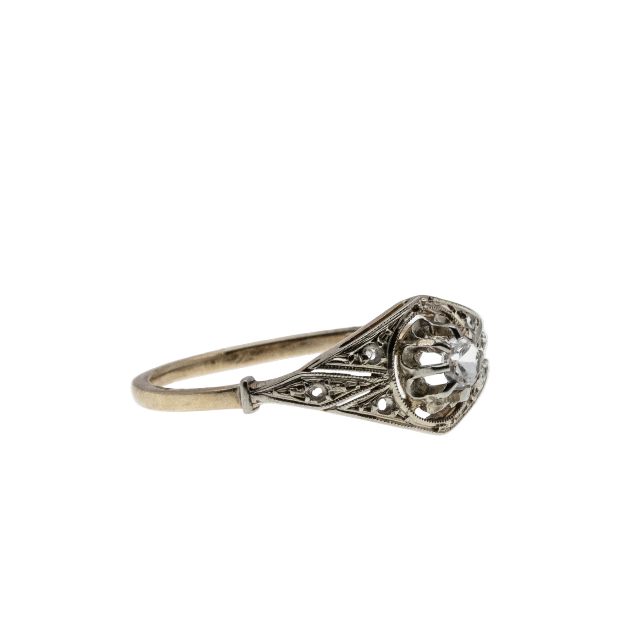 Bijou Français- Edwardian French Eagle Head Hallmark 18K Gold Natural Old European Cut & Rose Cut Diamond Ring. This exquisite ring is crafted in 18K yellow gold and white gold, tested and confirmed, hallmarked with the original French eagle head hallmark. The ring features one natural Old European Cut diamond, 6 natural Rose Cut diamonds, Edwardian era styling, and quality craftsmanship. This wonderful ring is comprised of an expertly claw-set sparkling diamond centre in a buttercup setting, which is flanked by pierce-worked and milgrain decorated shoulders in white gold. The shoulders are adorned by beautiful glowing rose cuts, which add even more sparkle to the piece. The lower portion of the ring, and the band are crafted in a rich buttery yellow gold colour. The shank is smooth, and polished, which allows for a comfortable fit, and easy sizing. This Edwardian era French ring would make a wonderful addition to any antique jewelry collection.