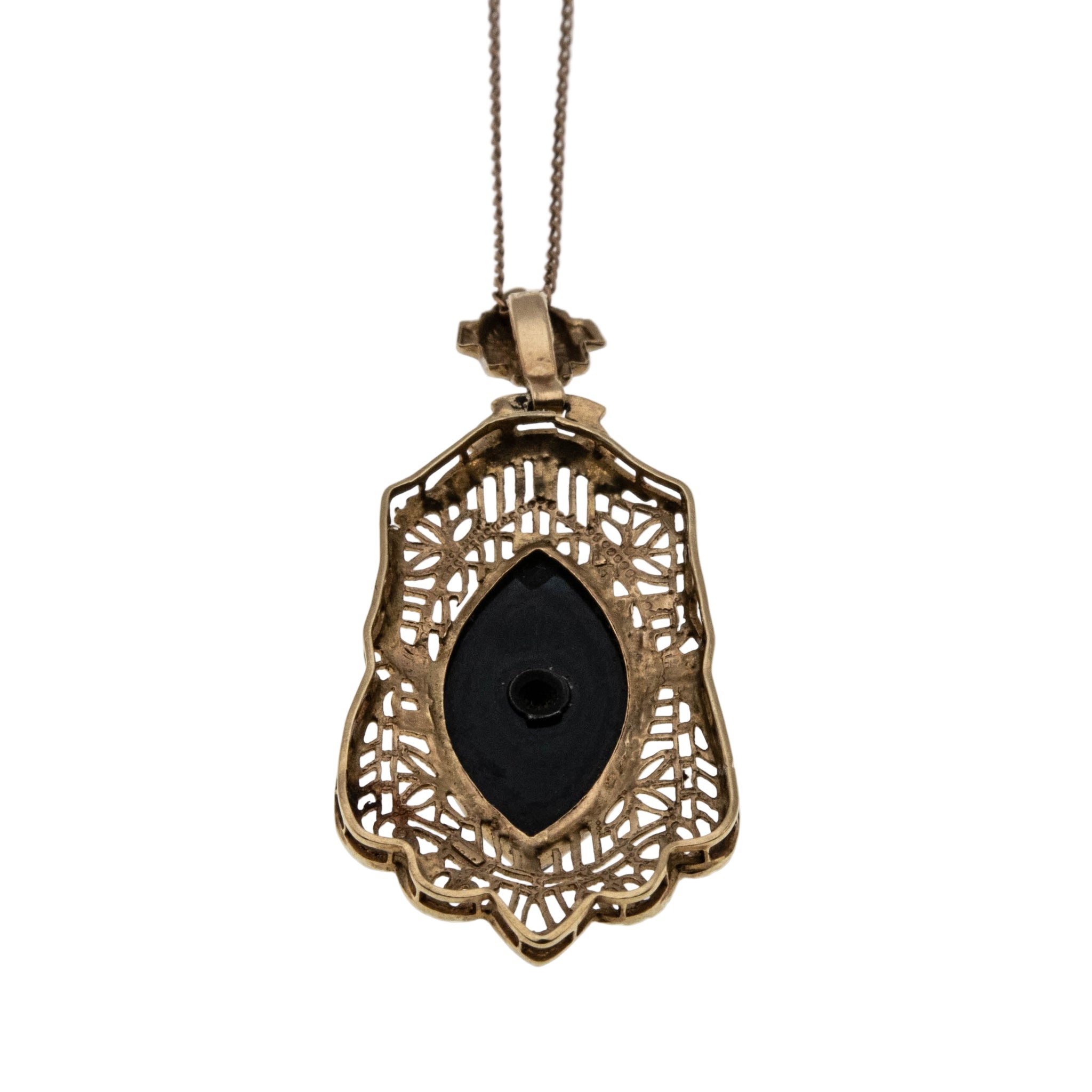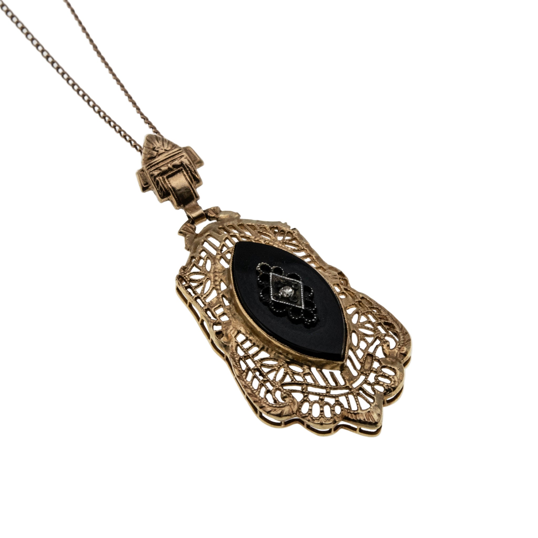 Night Of Intrigue - Edwardian 14K Gold Natural Marquise Black Onyx & Diamond Filigree Pendant & Chain (EDP031)