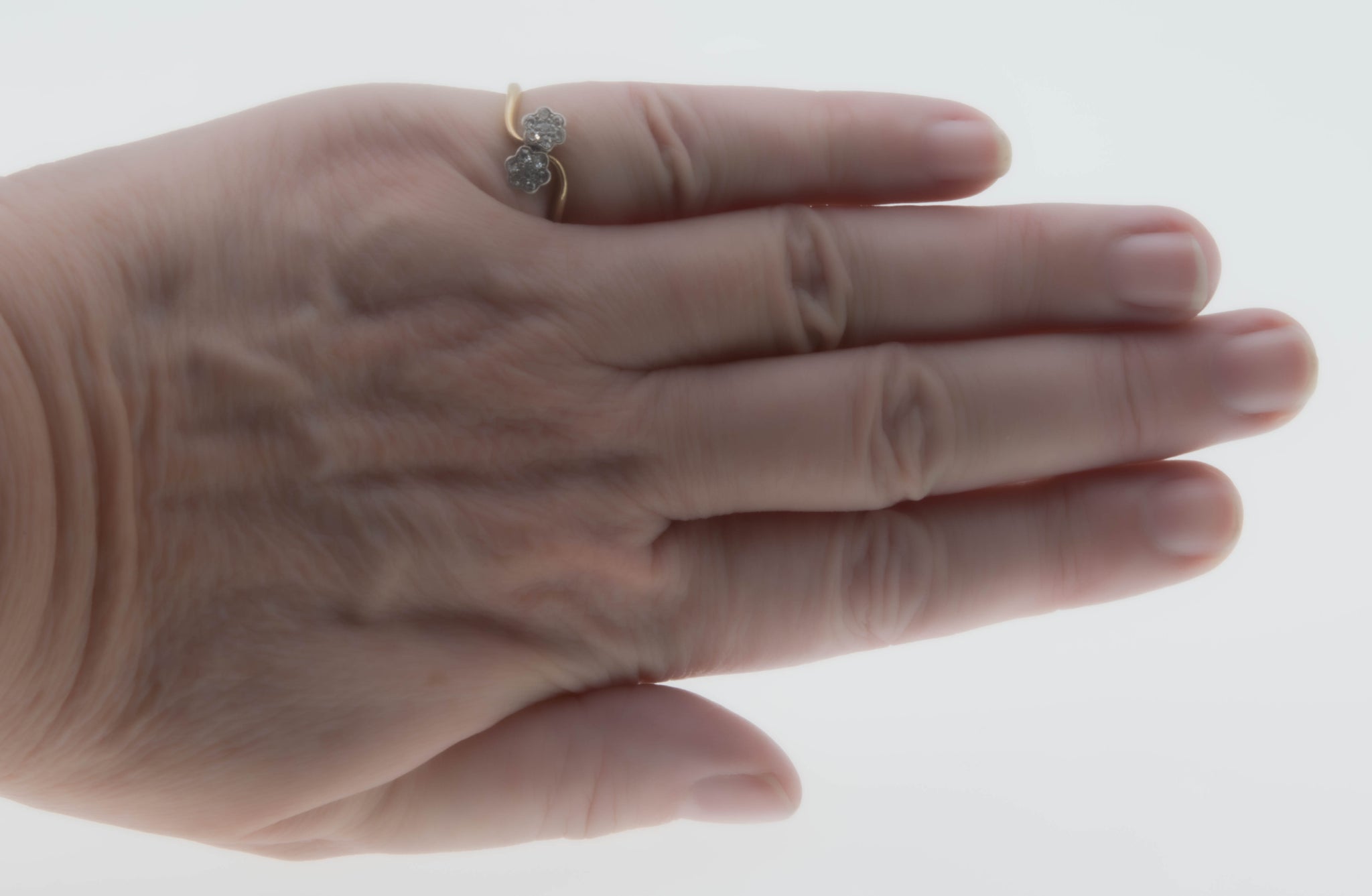Toi Et Moi - Edwardian English 18K Gold Natural Old European Cut Diamond Daisy Cluster Ring. This exquisite ring is crafted from 18K yellow gold, hallmarked 18CT (European hallmark for 18K), and a makers mark A.H. This ring features 14 natural 'Old European Cut' diamonds, Edwardian era styling, and high quality craftsmanship. The two galleries on this ring are made of white gold in the form of daisies, which are adorned by clear sparkling diamonds in the form of charming double flower clusters. The galleries exhibits traces of delicate milgrain decoration, adding character and detail to the piece. The band is a bypass design, and crafted in a yellow buttery gold colour, It is smooth and polished, which allows for a comfortable fit and easy sizing. This Edwardian ring would make a perfect unique engagement ring, gift, or a wonderful addition to any fine vintage jewelry collection.