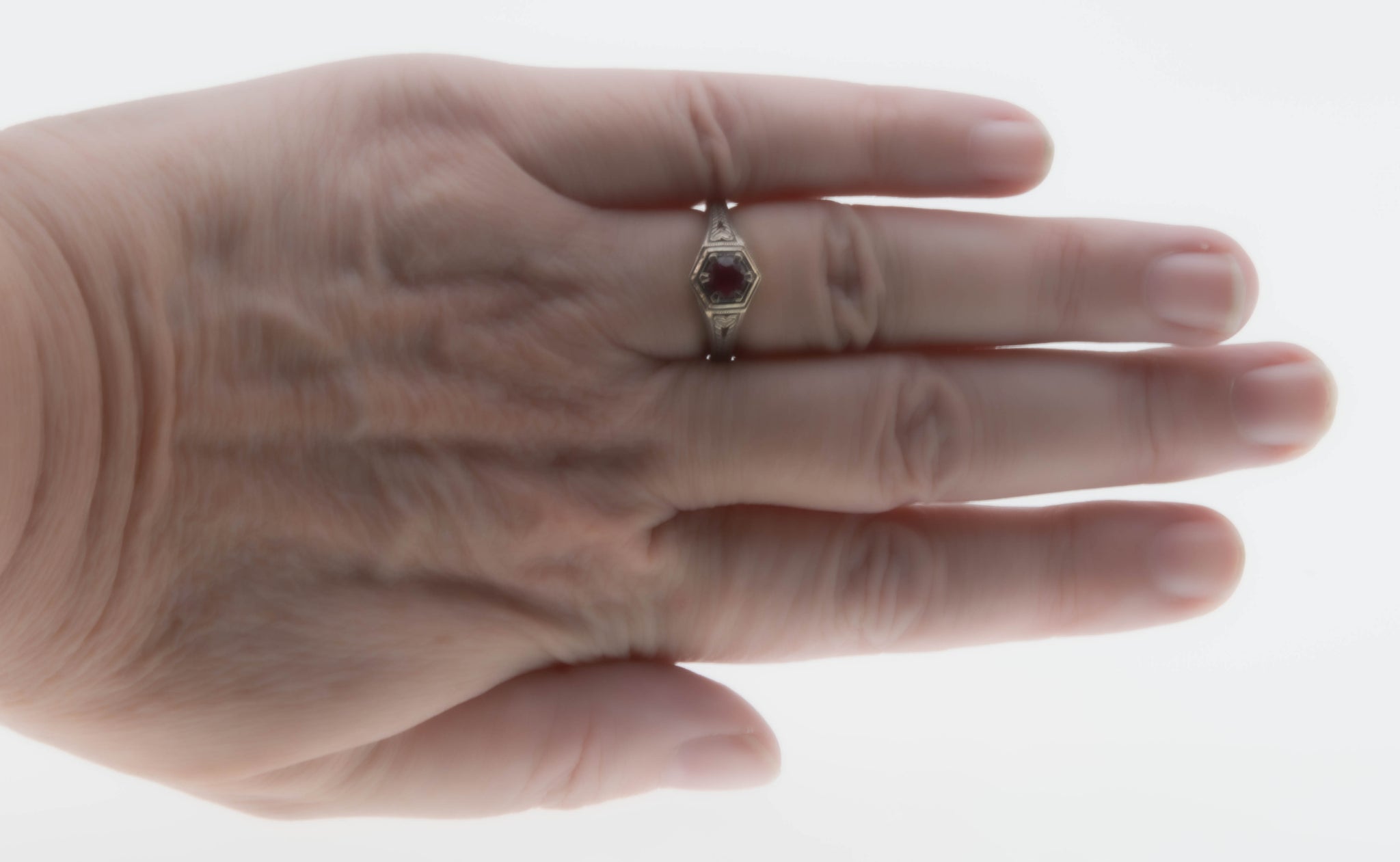 Crimson & Hearts - Estate Sterling Silver Natural Ruby Filigree Engraved Ring. This pretty ring is crafted from sterling silver, hallmarked 925. The ring features one natural round cut faceted ruby, Edwardian Revival styling, and quality craftsmanship. The setting on this ring is hexagon shaped, and expertly claw-set with a beautiful crimson red ruby. The gallery exhibits lovely filigree work, and engravings, which add character and detail to the piece. The shank is smooth, and polished, which allows for a comfortable fit and easy sizing. This estate ring would make a wonderful gift or addition to any jewelry collection.