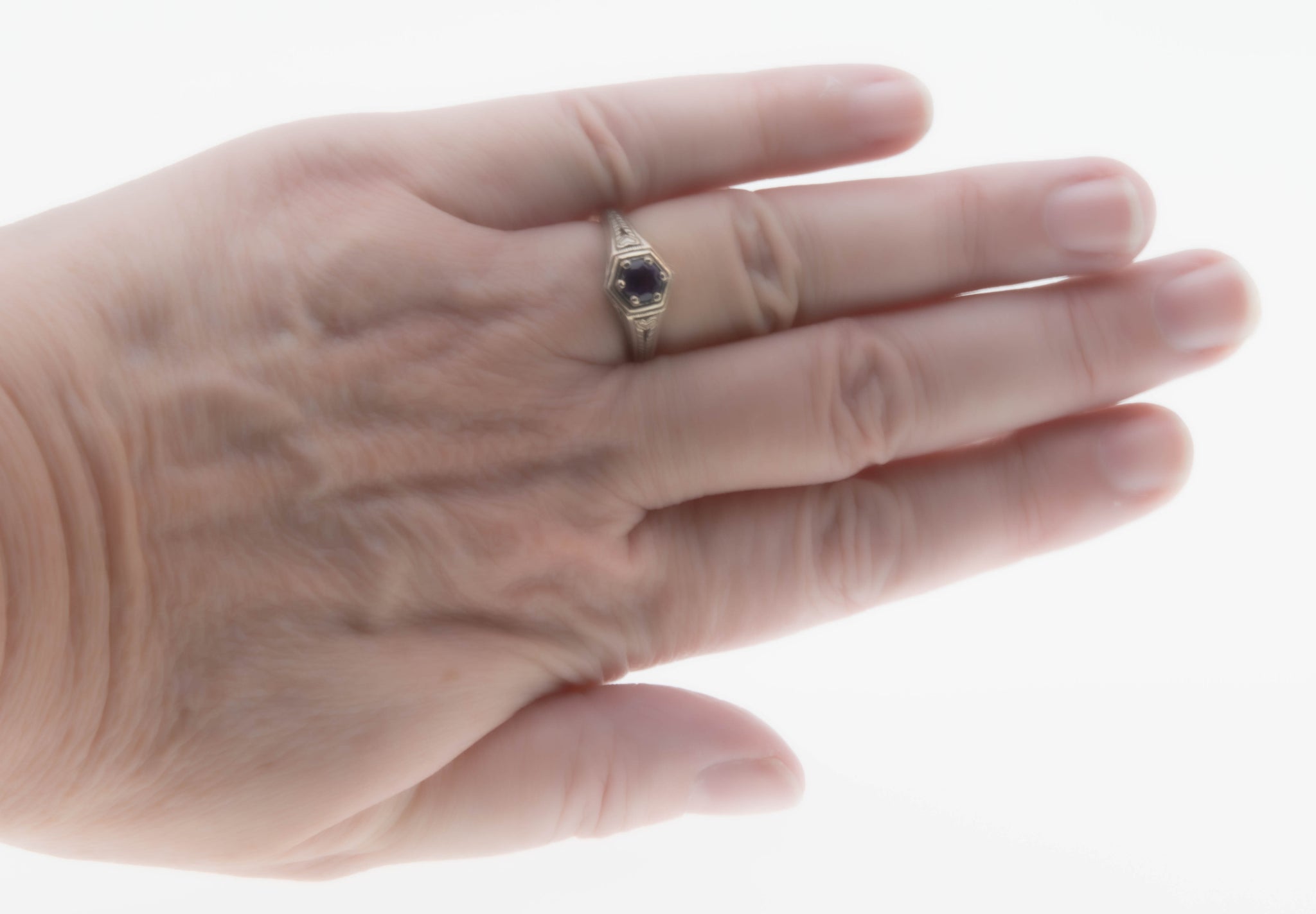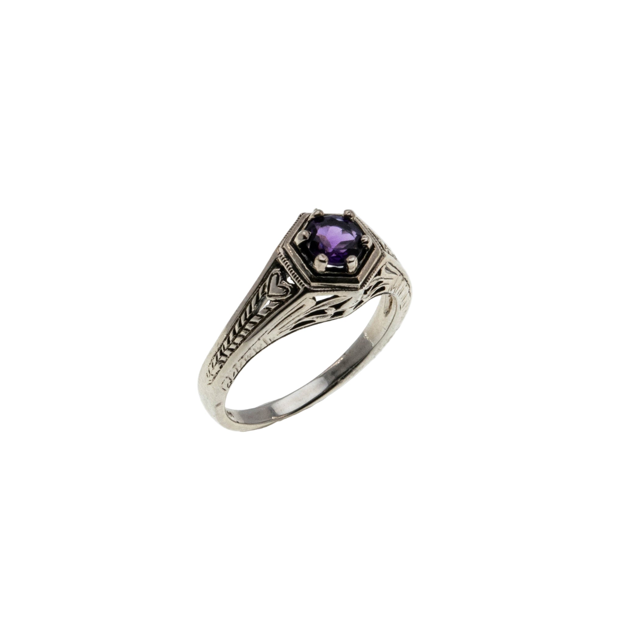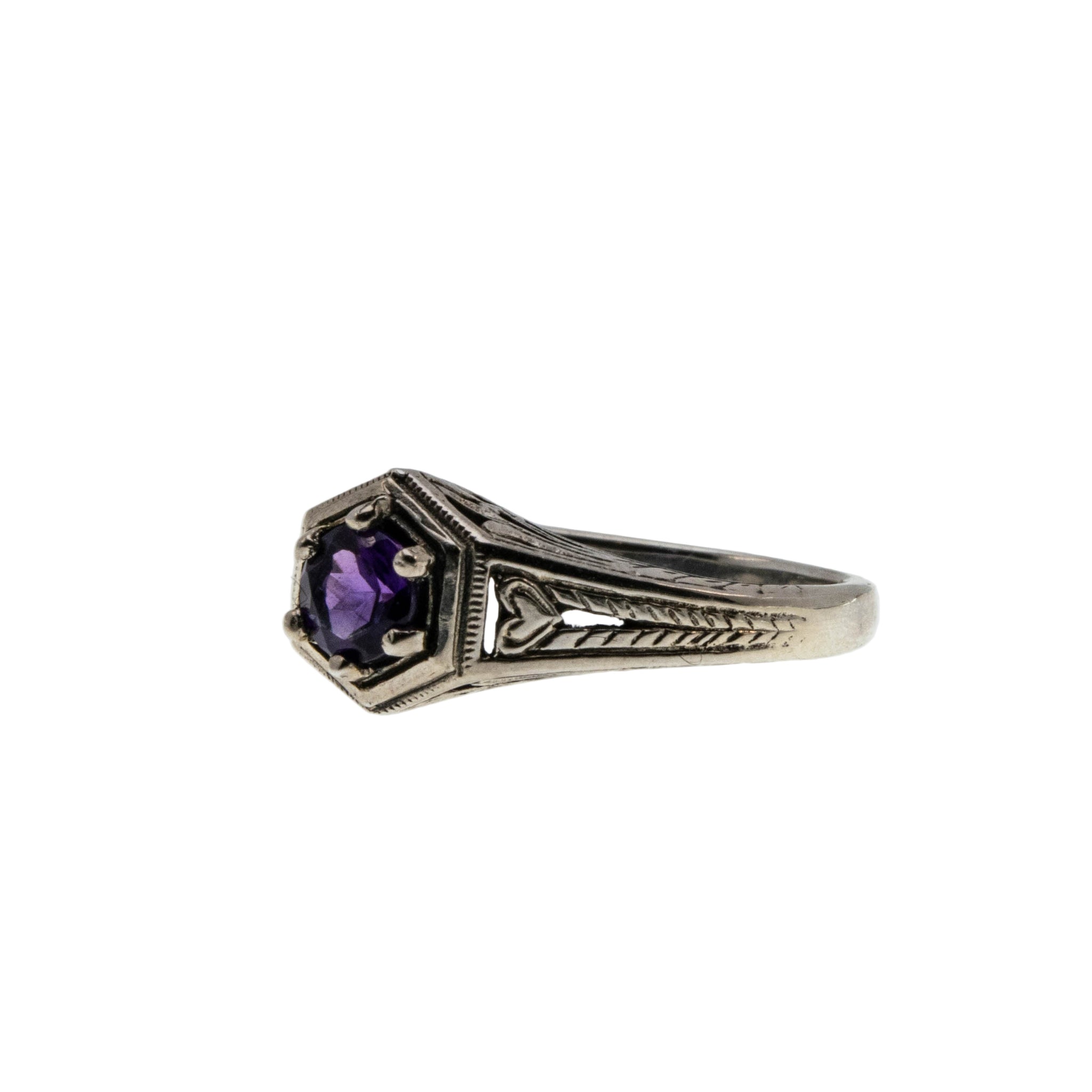 Lavender & Hearts - Estate Sterling Silver Natural Amethyst Engraved Filigree Ring. This pretty ring is crafted from sterling silver, hallmarked 925. The ring features one natural round cut faceted amethyst, Edwardian Revival styling, and quality craftsmanship. The setting on this ring is hexagon shaped, and expertly claw-set with a beautiful purple amethyst. The gallery exhibits lovely filigree work, and engravings, which add character and detail to the piece. The shank is smooth, and polished, which allows for a comfortable fit and easy sizing. This estate ring would make a wonderful gift or addition to any jewelry collection.