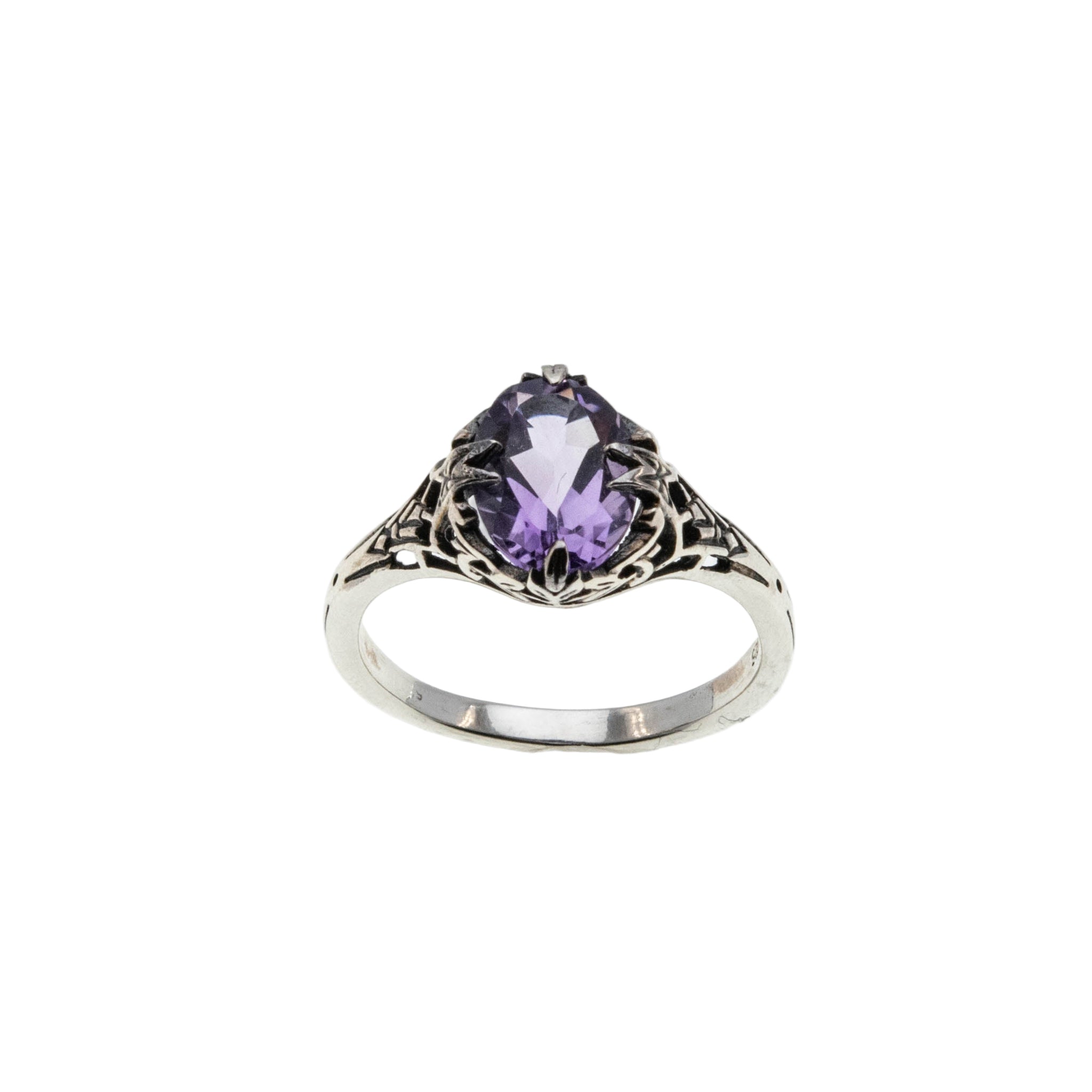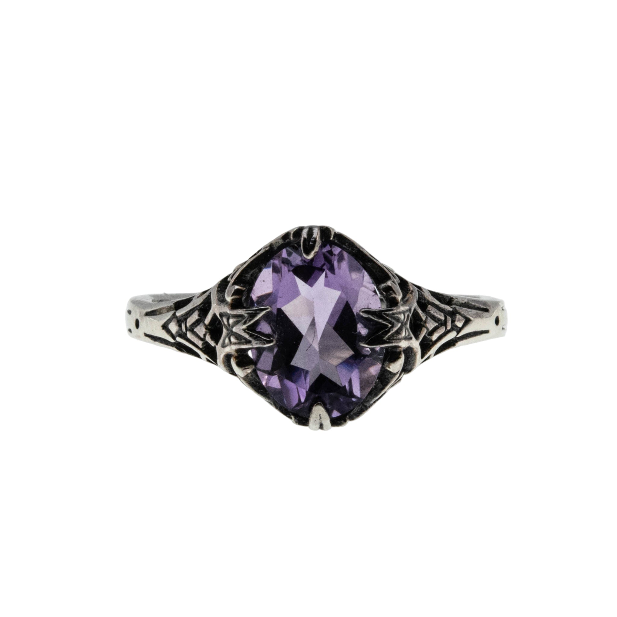 Sweet Lavender - Estate Sterling Silver Amethyst Filigree Ring. This gorgeous ring is crafted from sterling silver, hallmarked 925 for sterling silver. Featuring one natural oval cut amethyst, Edwardian revival styling, and quality craftsmanship. The expertly claw-set amethyst is purple in color, displaying purplish/Lavender hues. The gallery and shoulders display a sea of filigree leading down to a polished and smooth shank, which allows for a comfortable fit, and easy sizing. The Edwardian Revival ring is rich an elegant, truly a perfect gift or addition to any jewelry collection.