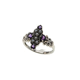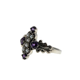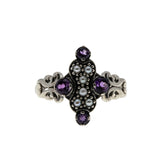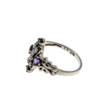 Twilight Over The Sea - Estate Sterling Silver Natural Amethyst & Seed Pearl Filigree Ring. This gorgeous ring is crafted from sterling silver, hallmarked SS 925 for sterling. Featuring 4 expertly claw-set genuine natural vibrant purple amethyst, 6 genuine seed pearls, Victorian Revival styling, and quality craftsmanship. The Gallery on this ring is adorned by beautiful white pearls, which are framed by purple amethysts. The shoulders of the ring exhibit deeply carved decoration, adding character and beauty to the piece. The band is smooth and solid, which allows for a comfortable fit and easy sizing. This estate ring is created in the  Victorian Revival in style, which looks exquisite when worn, truly a perfect gift or addition to any jewelry collection.