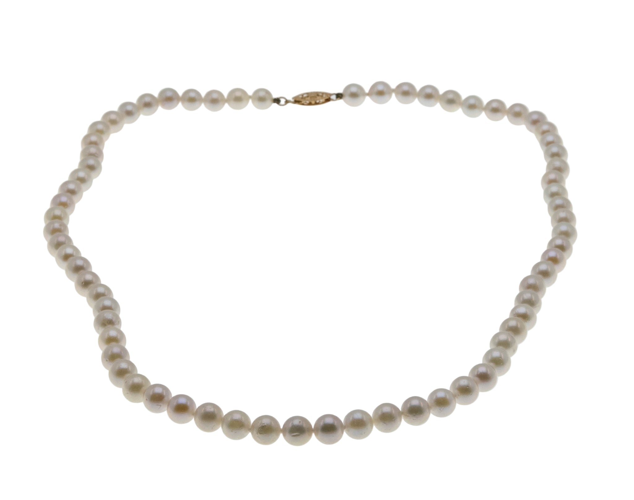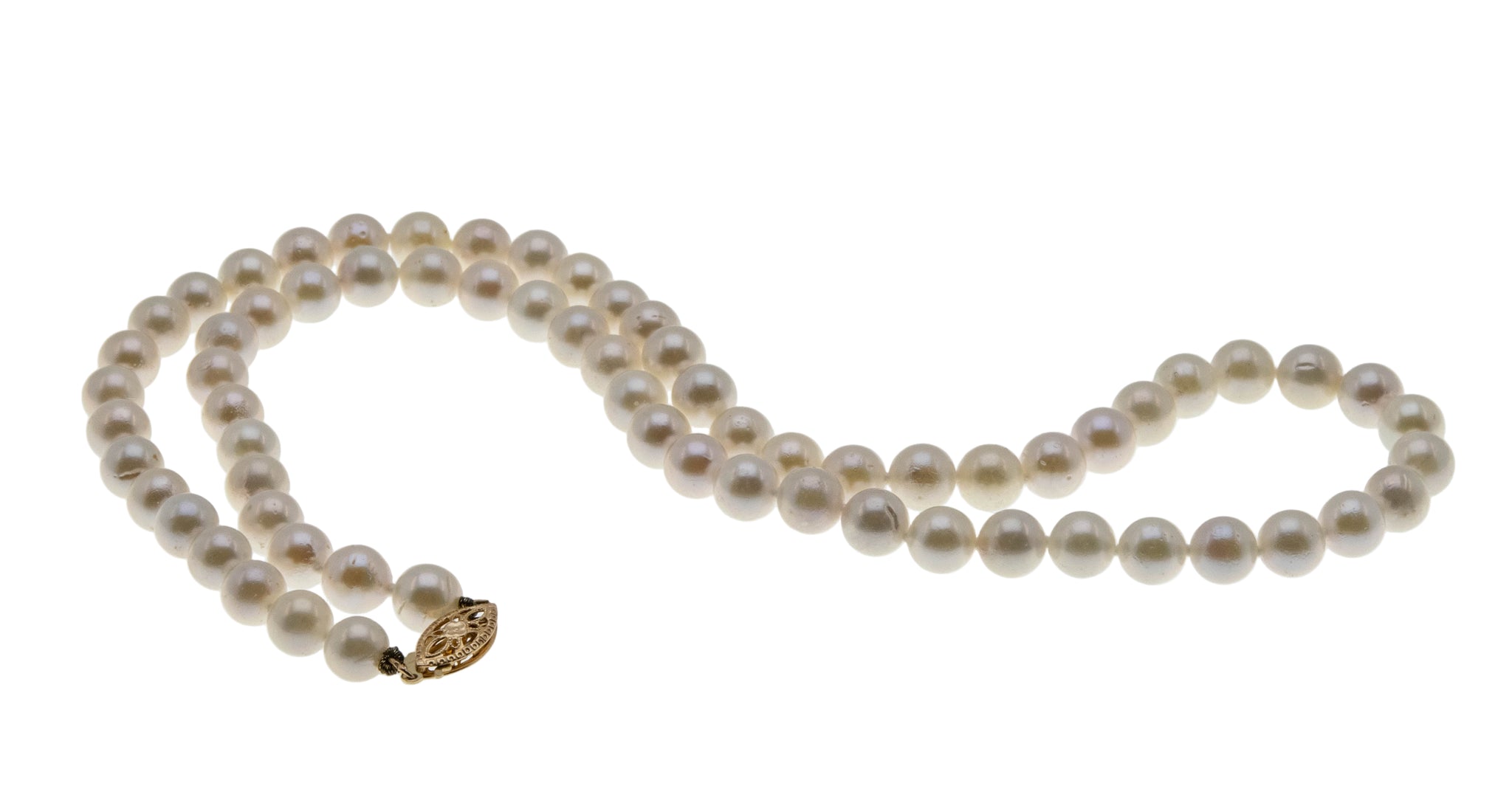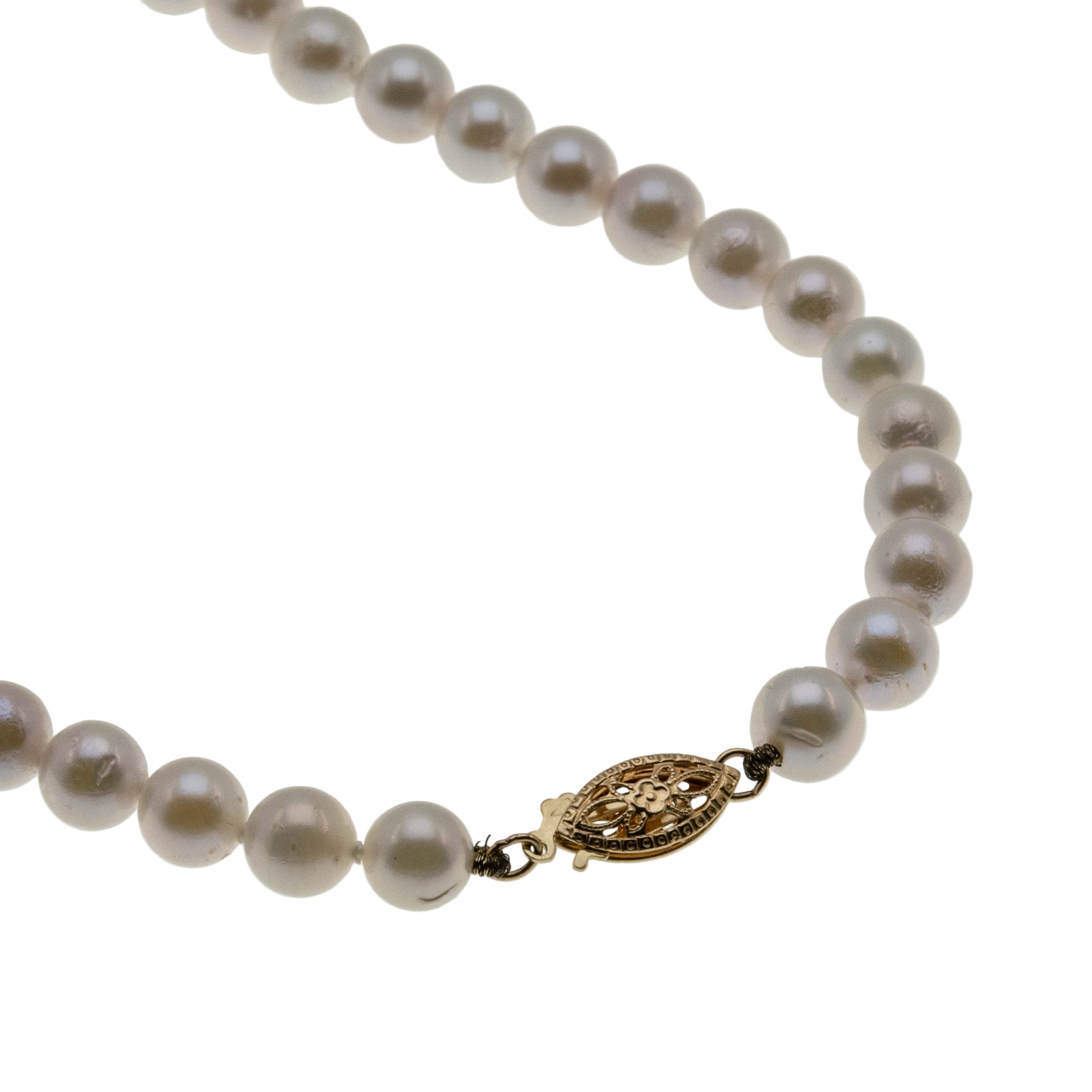 Lustrous Classic - Vintage 14K Gold Cultured Saltwater Japanese Akoya Pearl Necklace Strand. This lovely strand of pearls is crafted from 14K yellow gold, hallmarked 14K. Featuring 68 genuine cultured pearls, vintage classic design, and quality work. The pearls on this strand are white and lustrous, displaying silvery/pink overtones. They are hand knotted with silk thread, which protects each pearl from rubbing against each other. The clasp is a filigree design and is in perfect working order. Pearls are known as being the most feminine of all gems and have been used in jewelry for centuries. This Vintage strand of pearls would make a wonderful gift or addition to any jewelry collection.