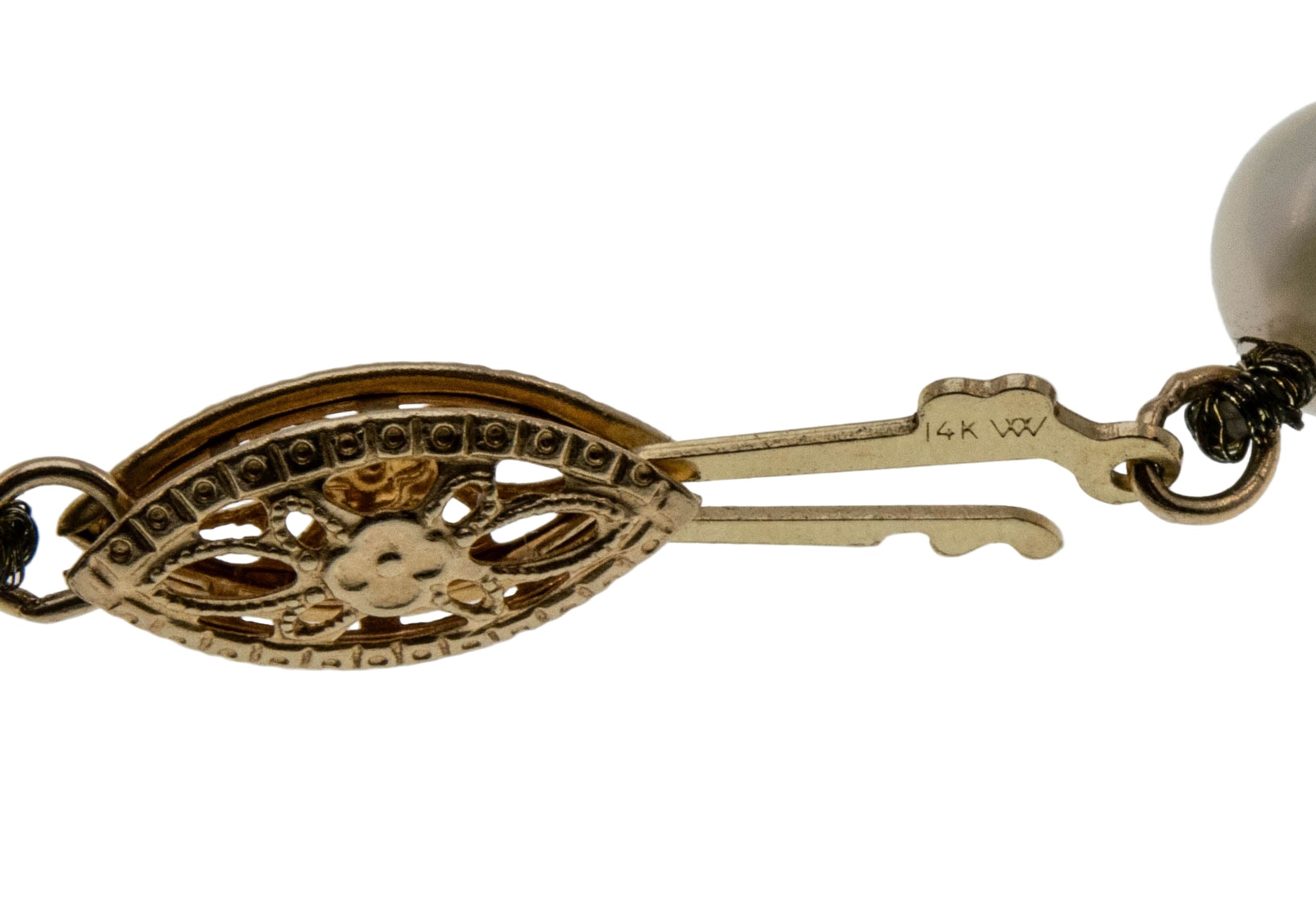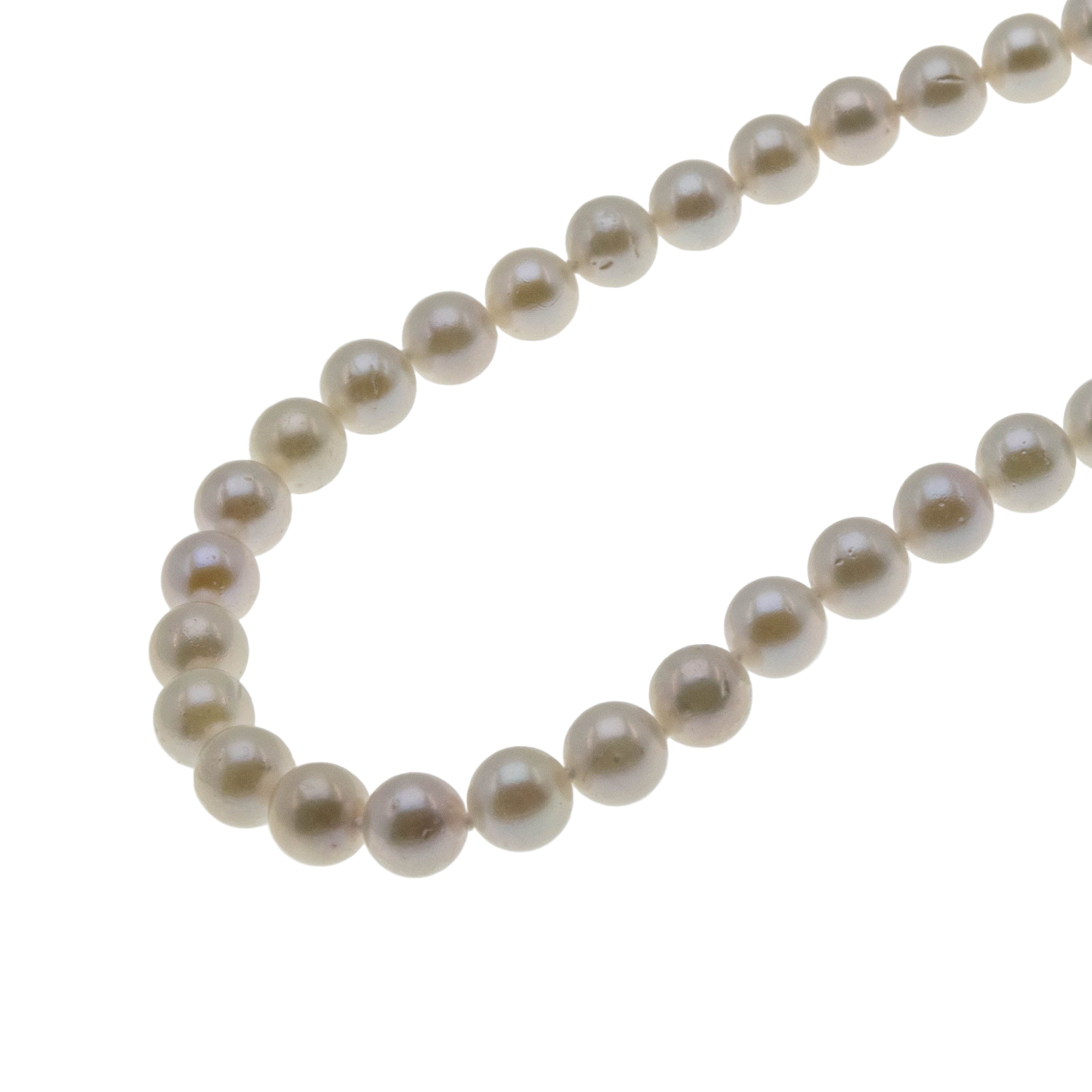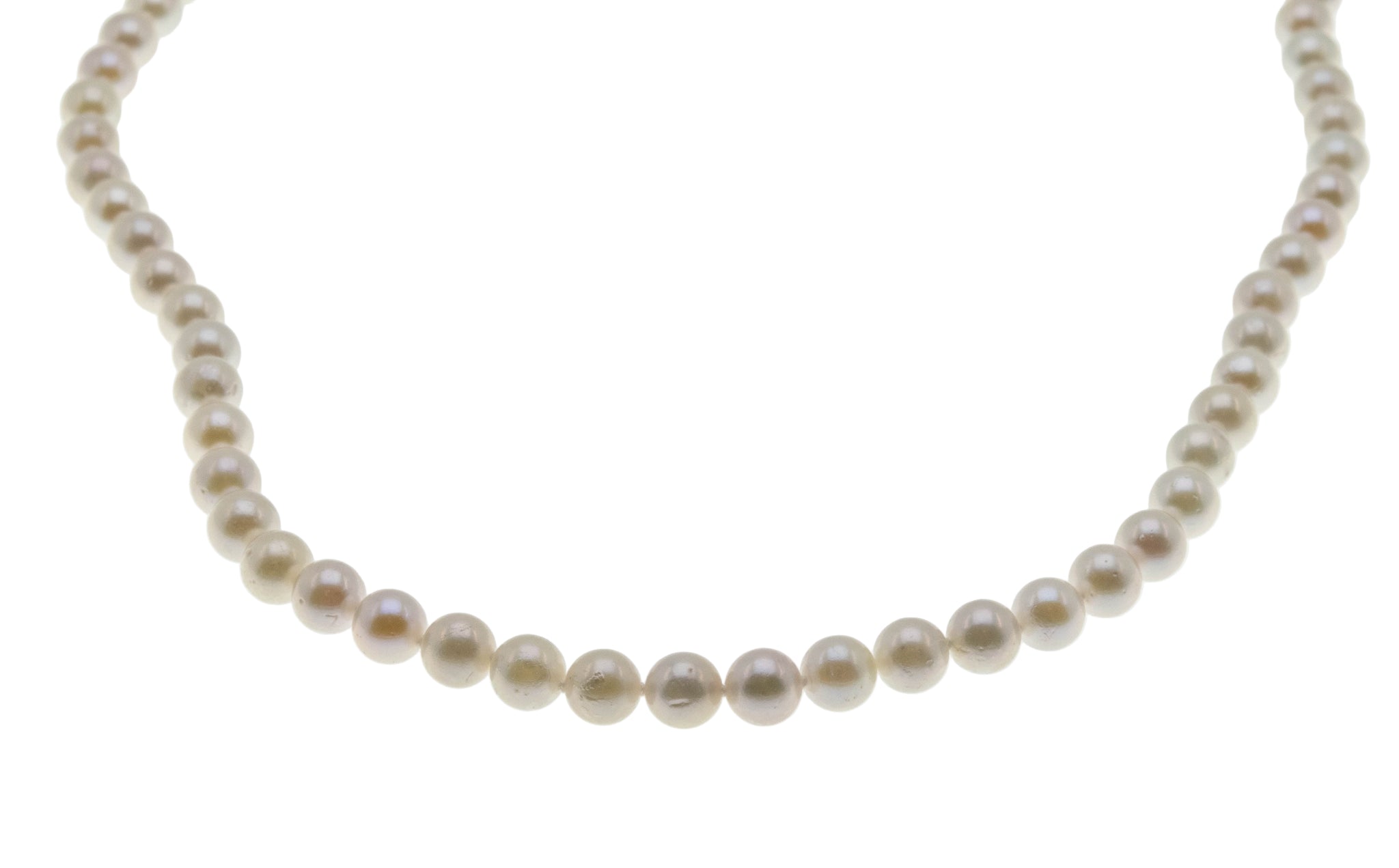 Lustrous Classic - Vintage 14K Gold Cultured Saltwater Japanese Akoya Pearl Necklace Strand. This lovely strand of pearls is crafted from 14K yellow gold, hallmarked 14K. Featuring 68 genuine cultured pearls, vintage classic design, and quality work. The pearls on this strand are white and lustrous, displaying silvery/pink overtones. They are hand knotted with silk thread, which protects each pearl from rubbing against each other. The clasp is a filigree design and is in perfect working order. Pearls are known as being the most feminine of all gems and have been used in jewelry for centuries. This Vintage strand of pearls would make a wonderful gift or addition to any jewelry collection.