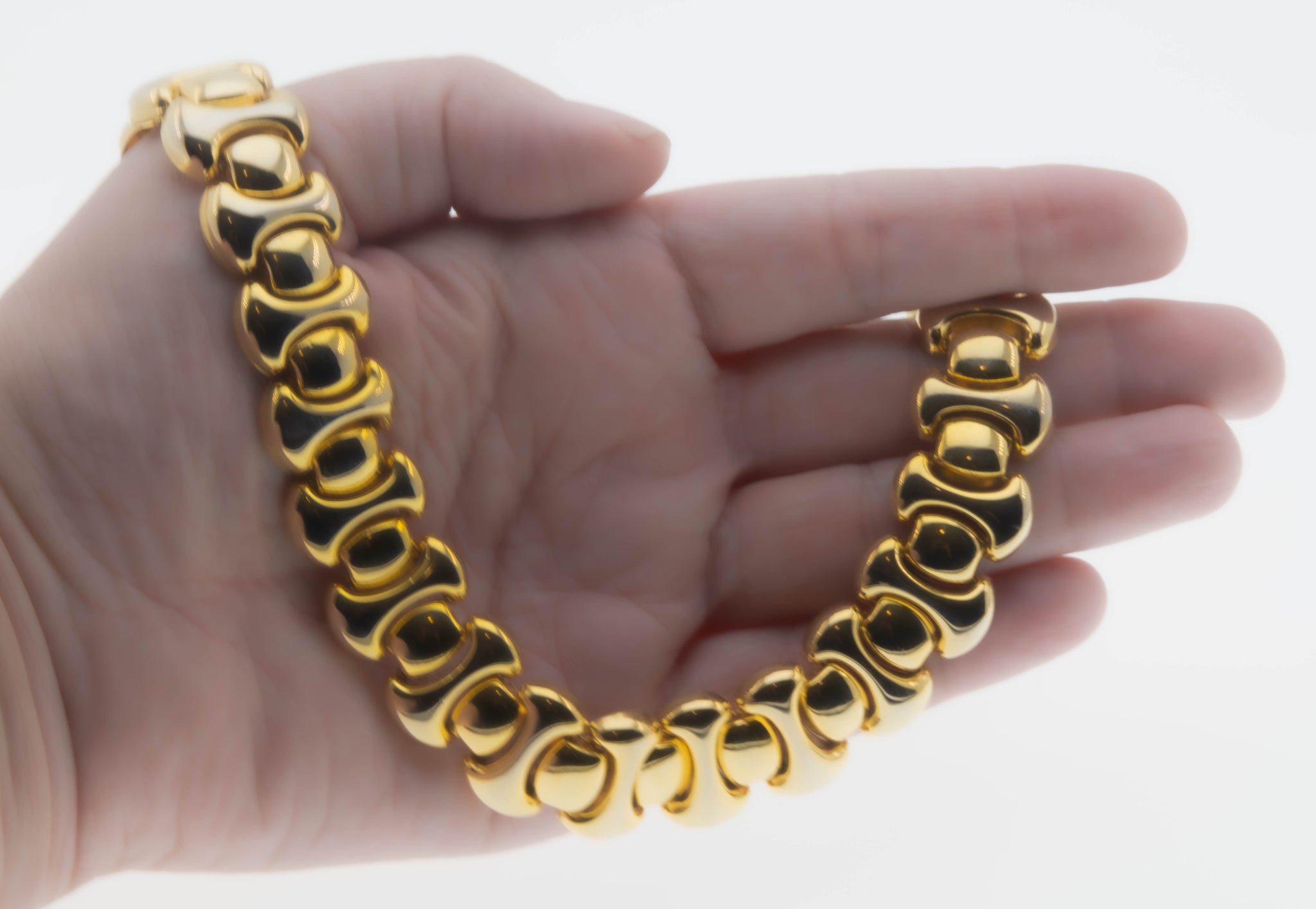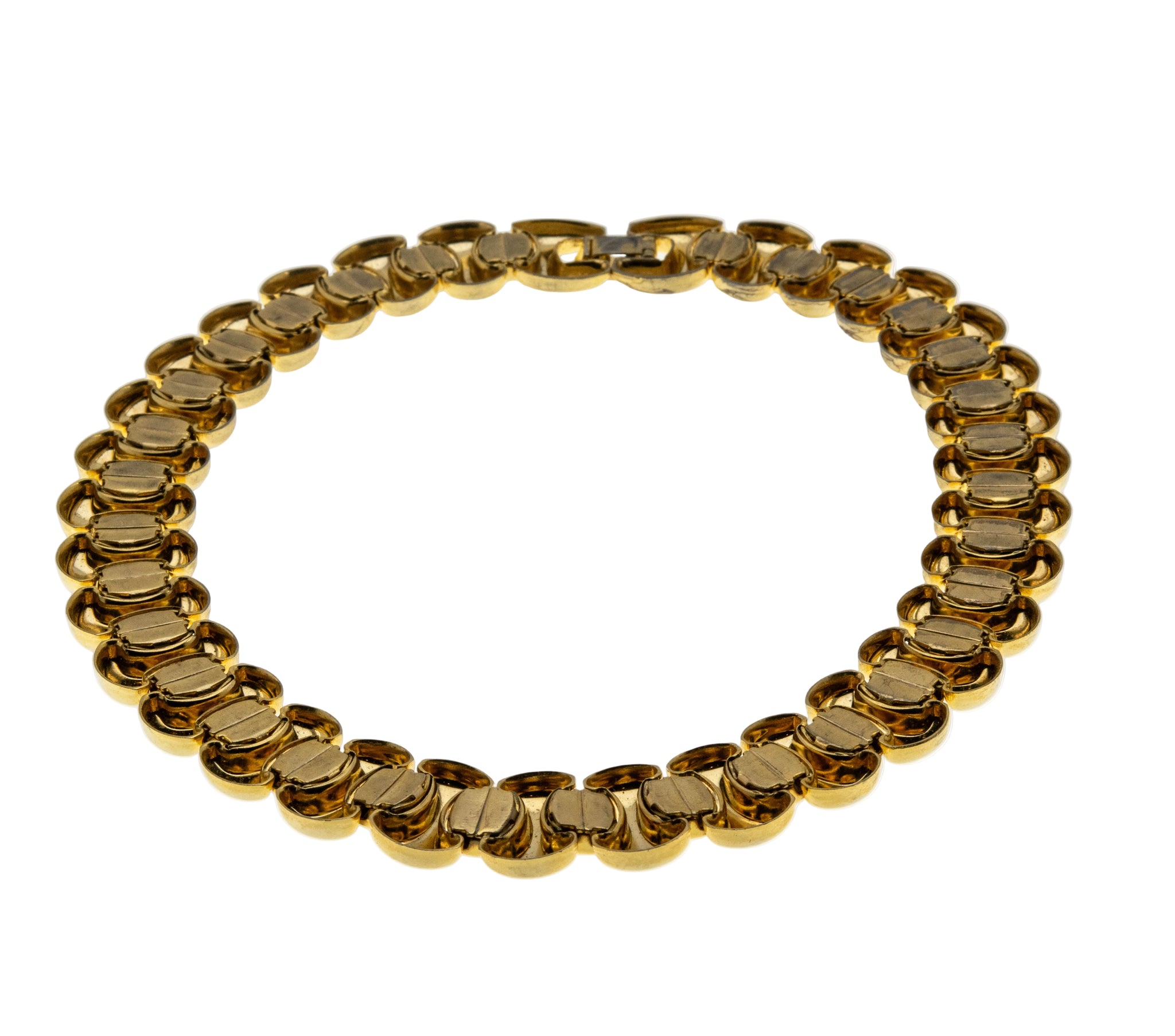 Retro Couture - Vintage Gold Plated Fancy Link Collar Necklace. This eye-catching necklace is crafted from gold plate over metal. The necklace features vintage era styling, and quality craftsmanship. This necklace is comprised of connecting gold links, which allows for flexibility, and a perfect drape around the neck. The necklace has a high gold polished finish, and a fold-type locking clasp, which is in perfect working order. This vintage necklace looks stunning when worn, truly a wonderful addition to any vintage jewelry collection.