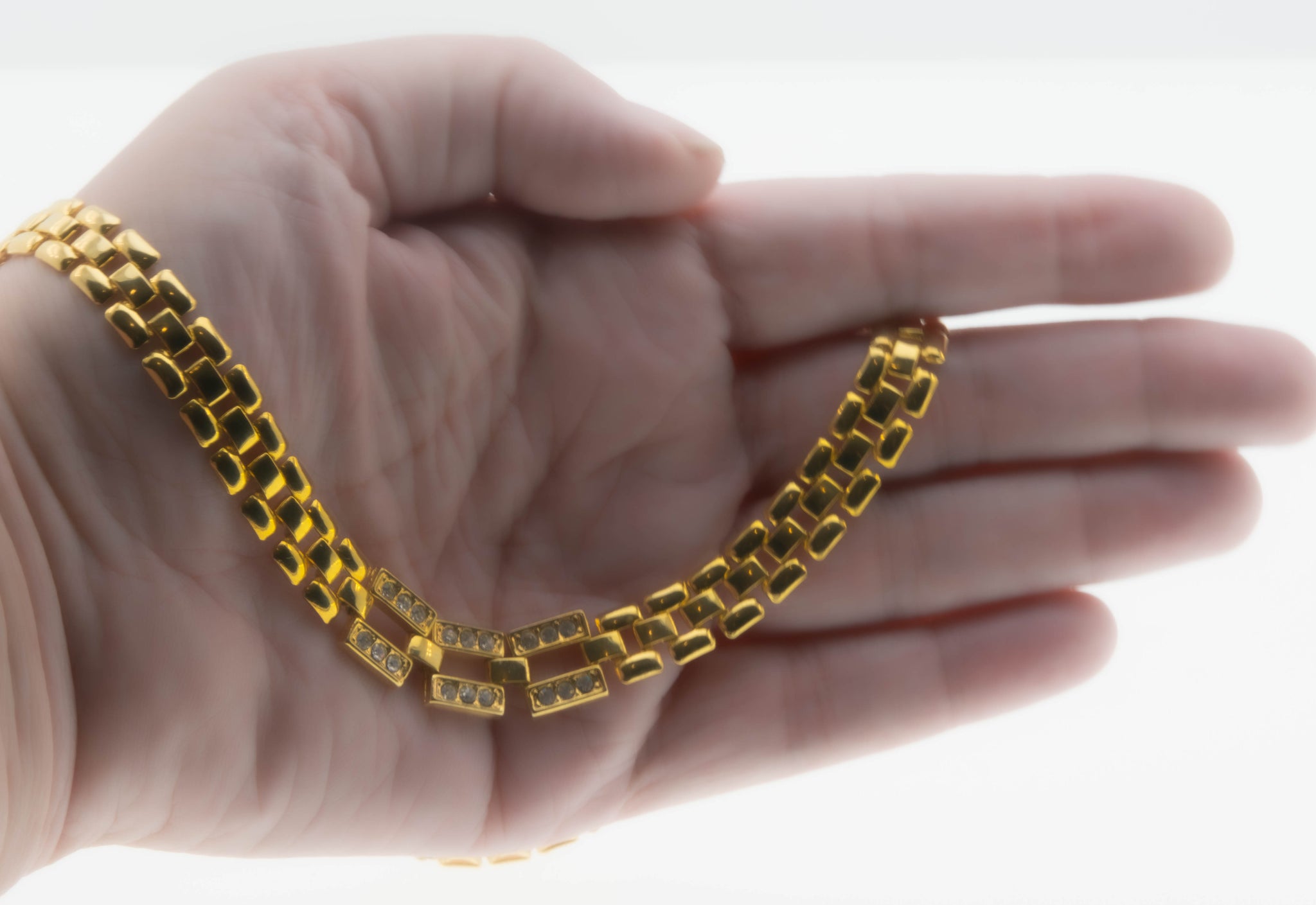 Retro Magic- Vintage Gold Plated Crystal Rhinestone Fancy Link Collar Necklace. This eye-catching necklace is crafted from gold plate over metal. The necklace features 18 round cut crystal rhinestones, vintage era styling, and quality craftsmanship. This necklace is comprised of connecting gold links, which allows for flexibility, and a perfect drape around the neck. The gallery is comprised of 3 square frames, which are adorned by sparking rhinestones. The necklace has a high gold polished finish, and a fold-type locking clasp, which is in perfect working order. This vintage necklace looks stunning when worn, truly a wonderful addition to any vintage jewelry collection.