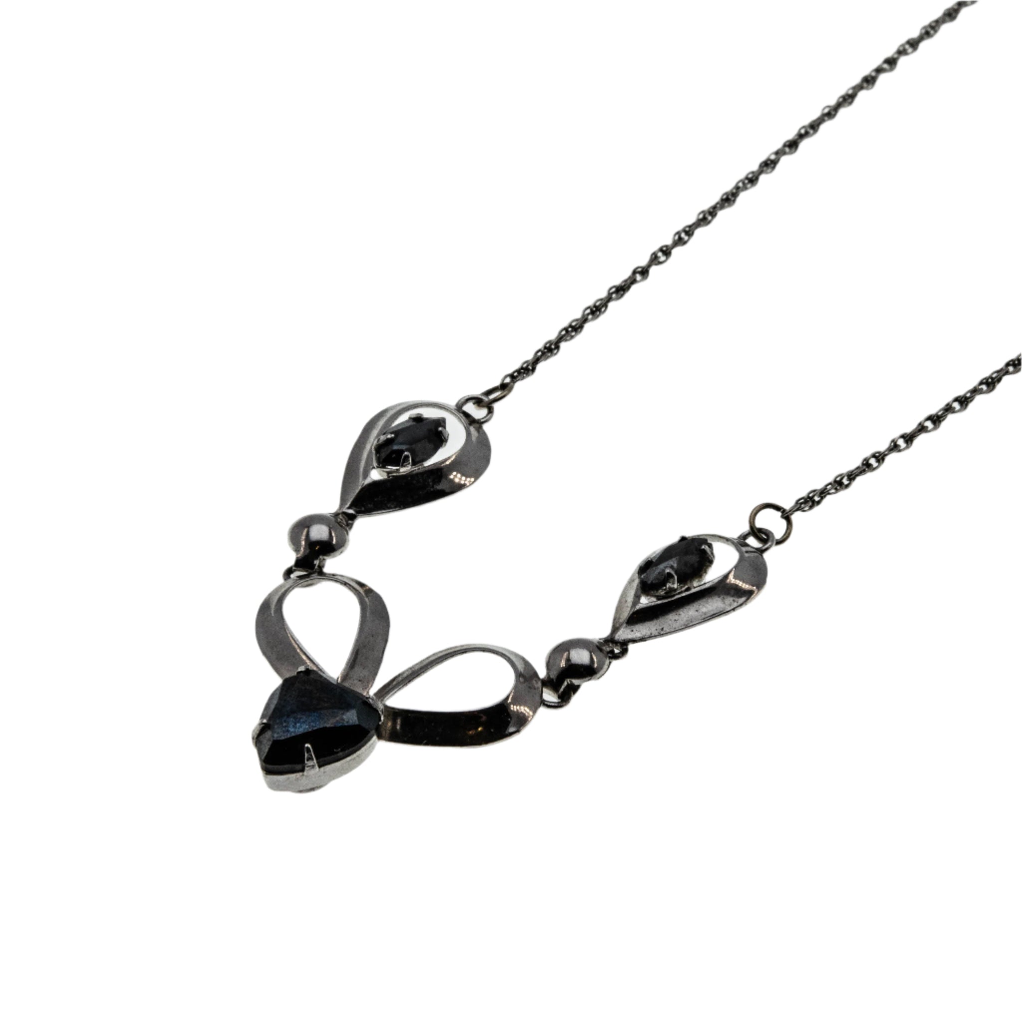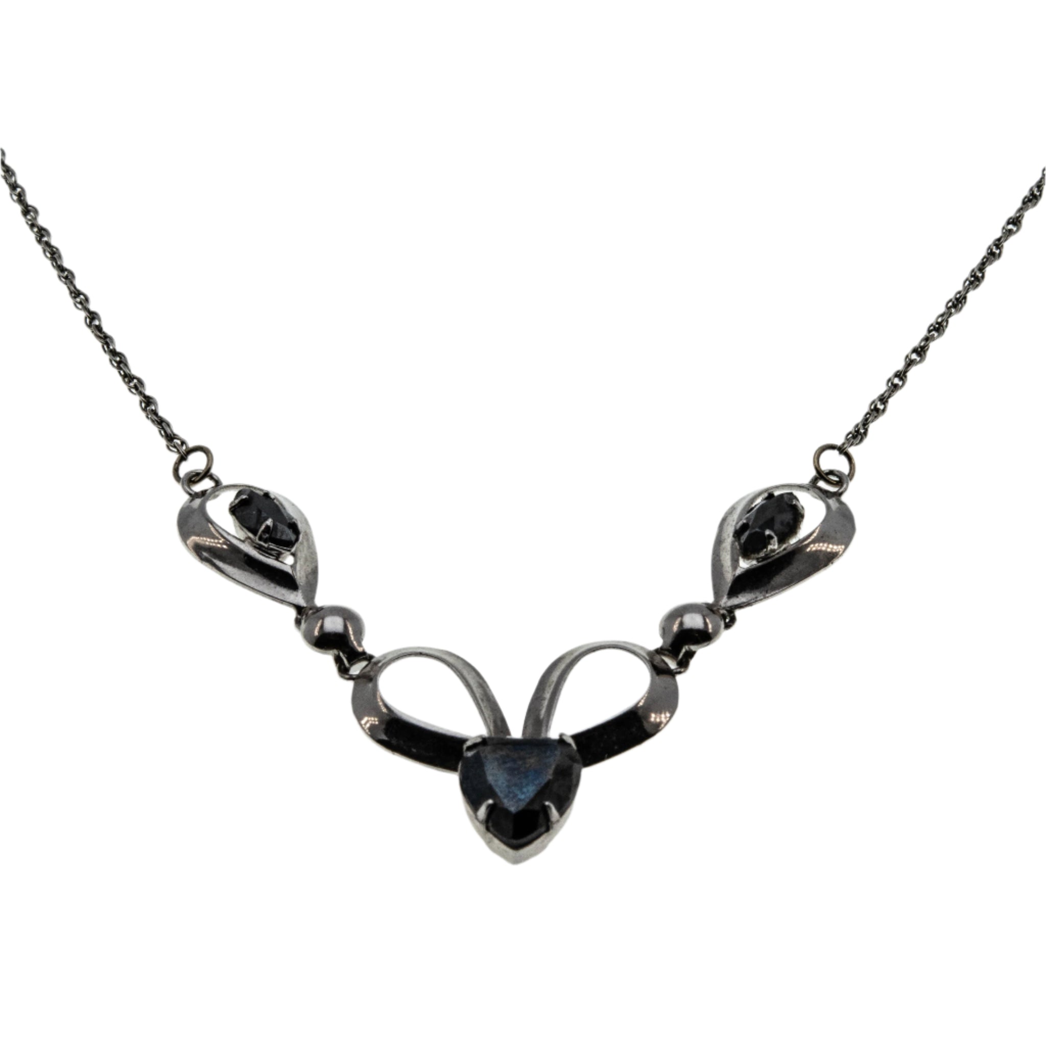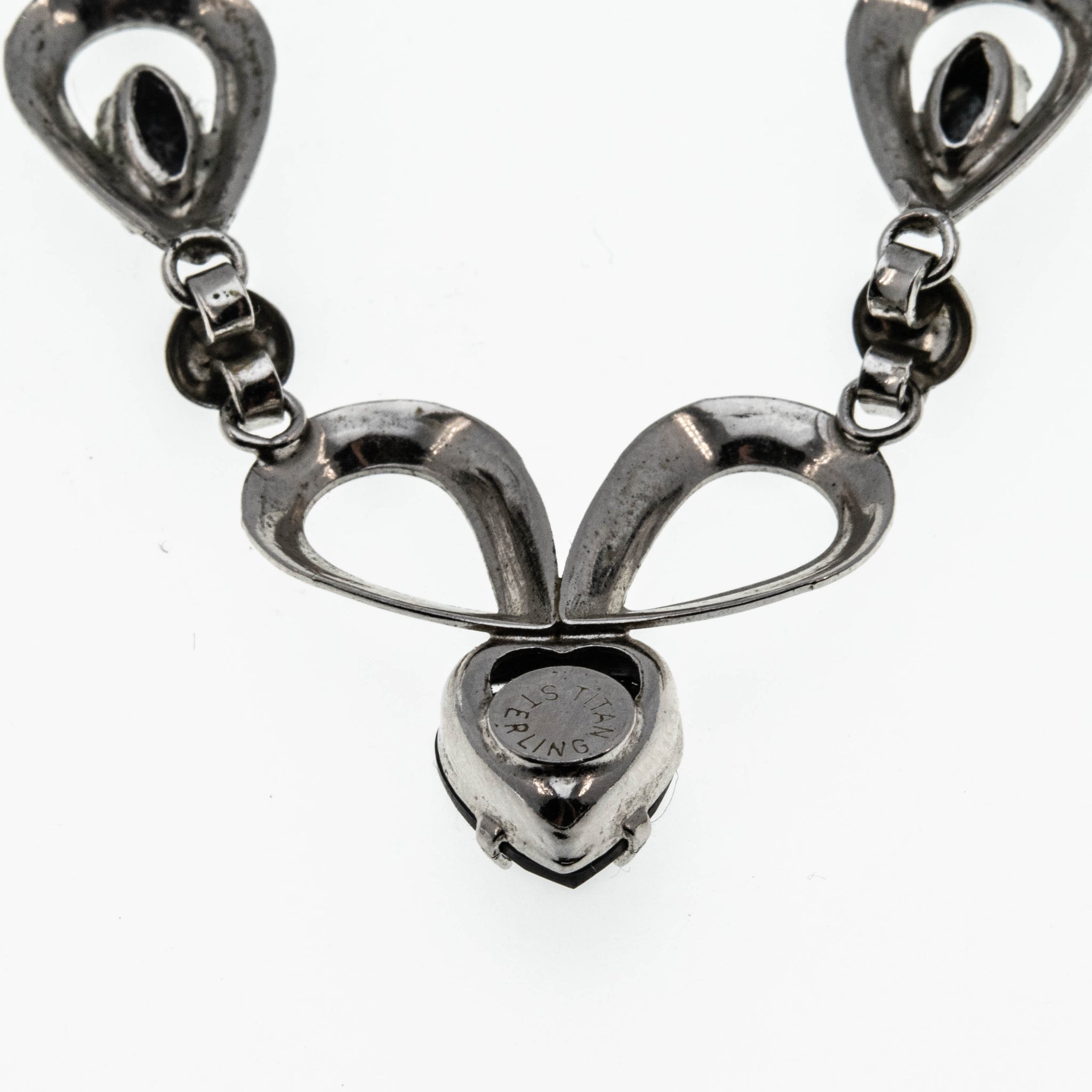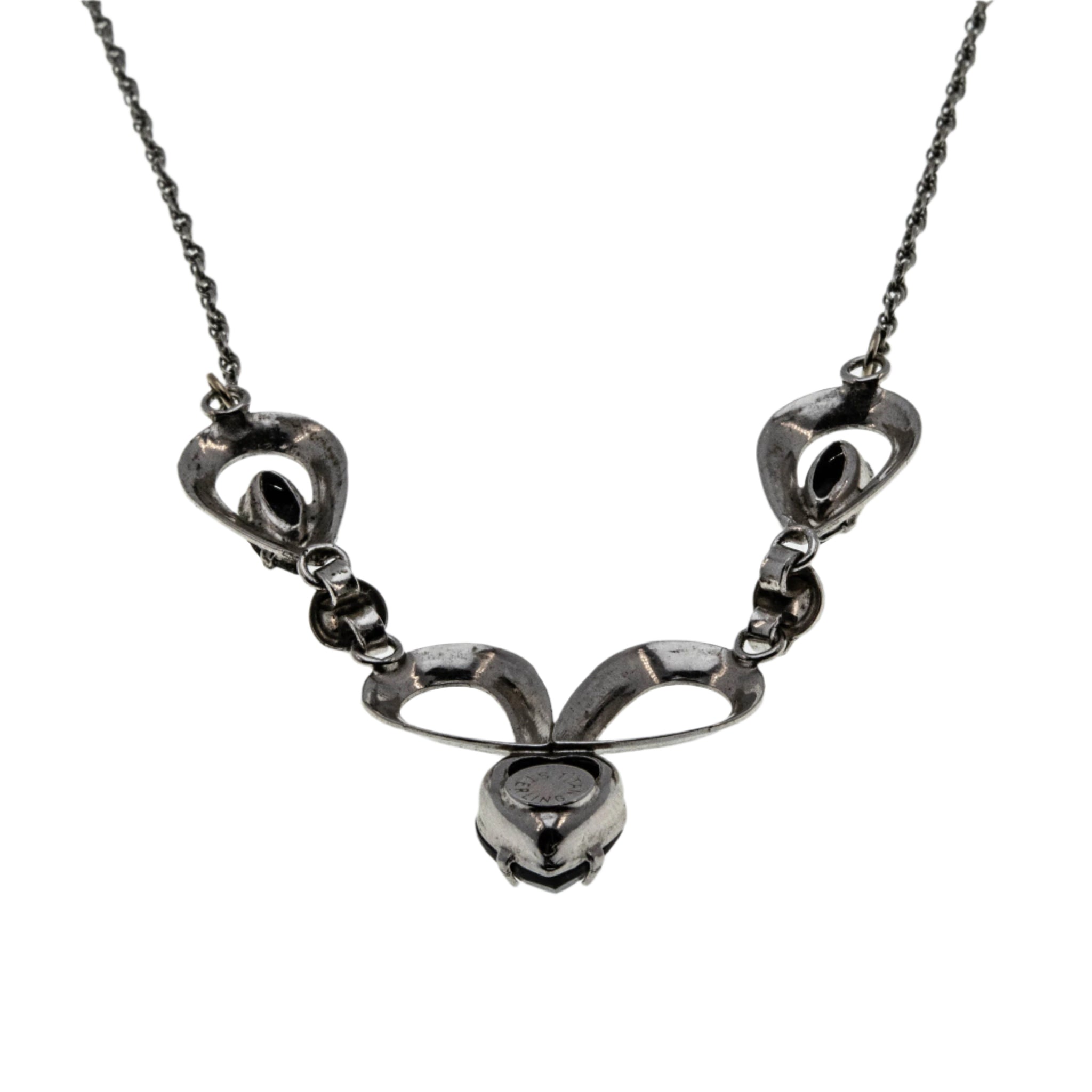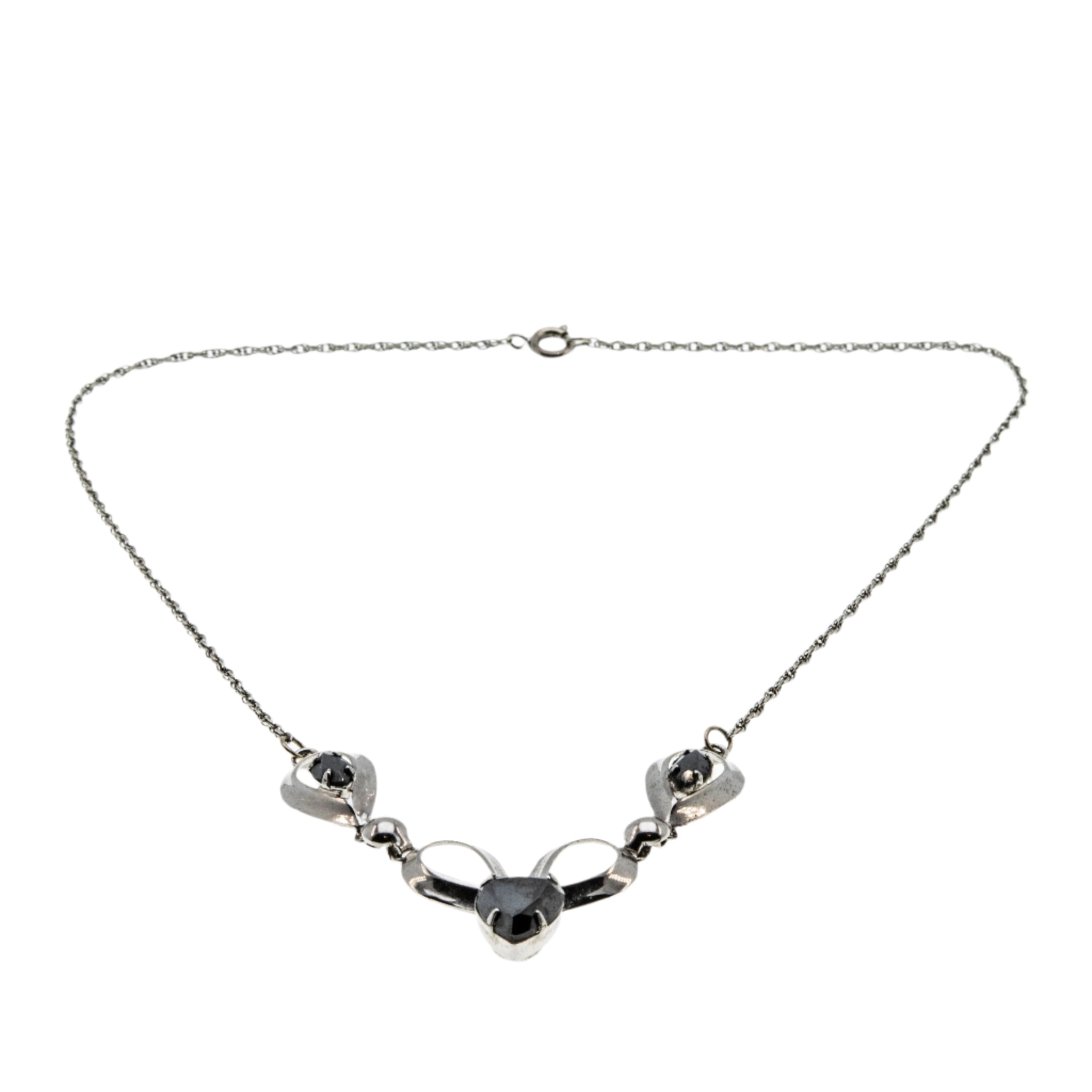 Sleek & Versatile - Vintage Signed 'TITAN' Sterling Silver Black Alaskan Diamond Necklace. This lovely necklace is crafted from sterling silver, hallmarked TITAN STERLING. The necklace features one natural heart shaped Black Alaskan Diamond, (Hematite), two natural marquise shaped Black Alaskan Diamonds (Hematite), vintage styling, and quality craftsmanship. The gallery on this necklace is expertly claw-set with beautiful charcoal grey hematite gems, which features a high polished finish on the frame work. The chain is a twisted rope design, featuring a secure spring ring clasp in perfect working order. This vintage necklace is versatile, and can be worn day or night with everything and anything.