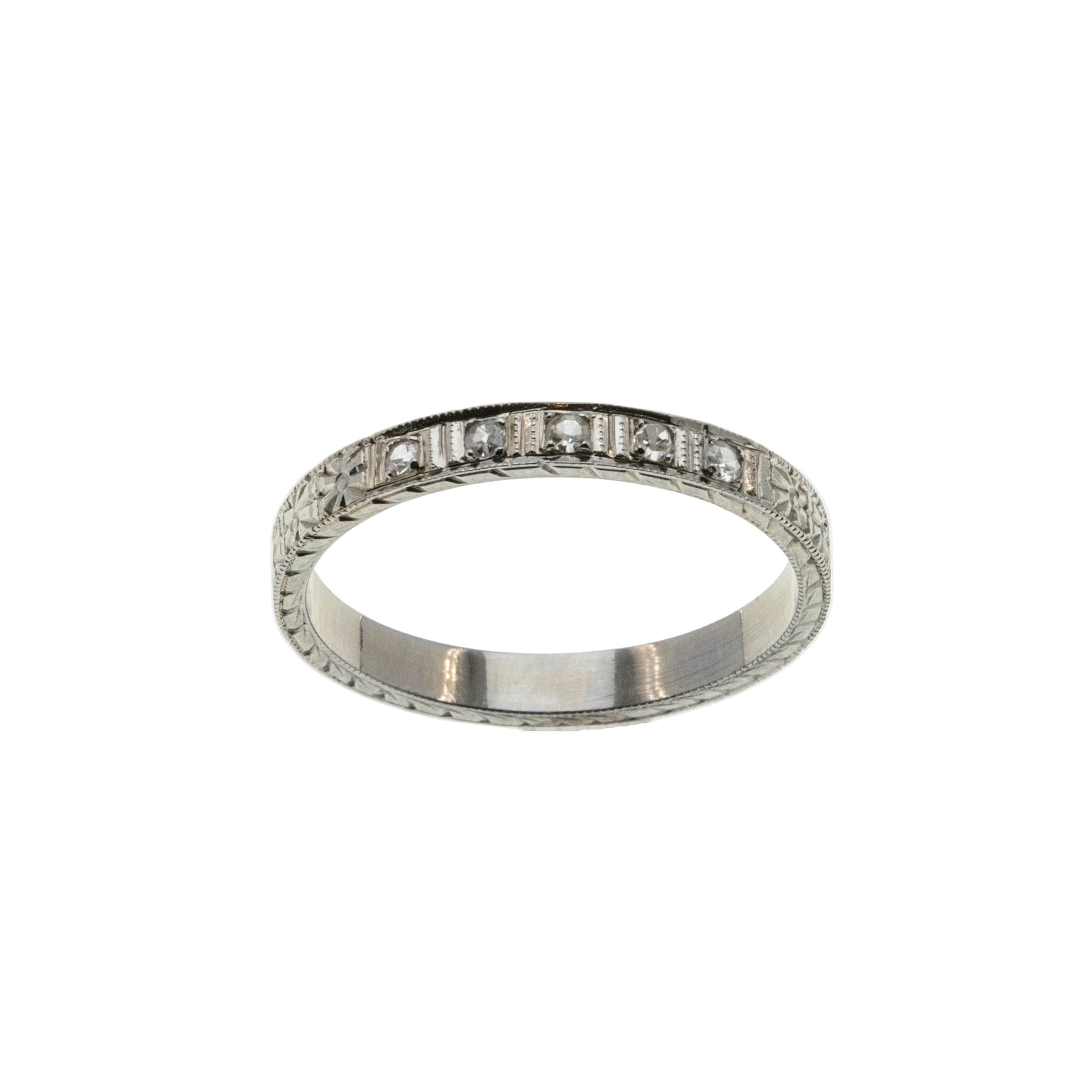 On This Day In 1925 - Art Deco 18K White Gold Natural Diamond Wedding Band Ring. This exquisite ring is crafted from 18K white gold, hallmarked 18K gold, hallmarked 18KT, and a Patent date of 1925. This ring features 5 natural round cut diamonds, Art Deco era styling, and quality craftsmanship. This antique ring is comprised of expertly set sparkling diamonds, which are incased in square settings, and exquisite floral engravings. The ring also exhibits delicate engravings on the profile of the ring. This Art Deco era ring looks wonderful when worn as a wedding band, on its own, or as a stacking ring.