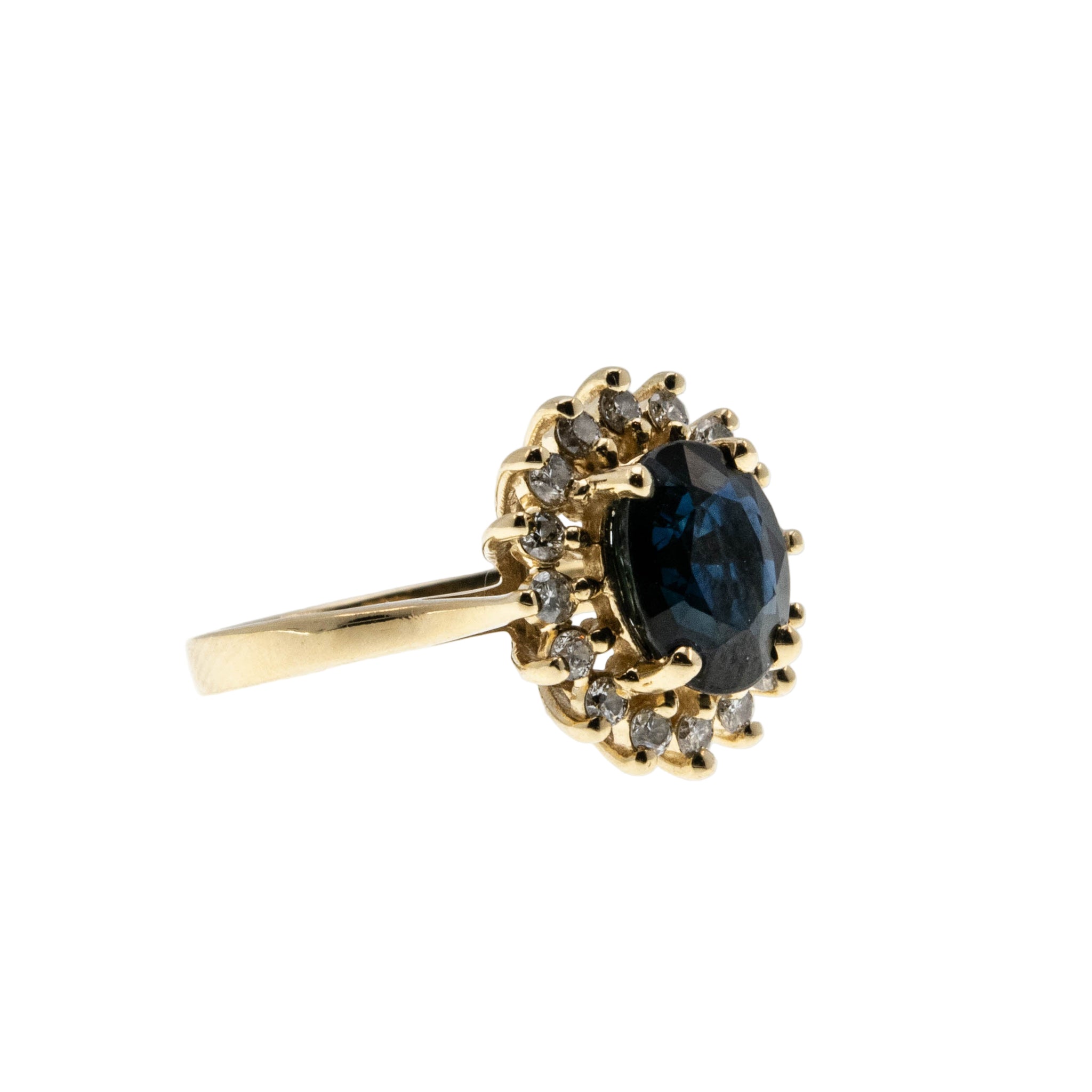 For A Princess - Vintage 14K Gold Natural Sapphire & Diamond Cluster Ring. This gorgeous ring is crafted from 14K yellow gold, hallmarked 14K in side the band. Featuring one natural oval cut faceted sapphire, 16 natural full cut diamonds, classic "Lady Di's" styled engagement ring, vintage era styling, and quality craftsmanship. The sapphire in this ring is a beautiful deep blue colour with a bluish/greenish hue. The diamonds are set in a gallery of gold, as are the shoulders and band. The mount is a high quality with a substantial gallery. The band is tapered, solid, smooth and polished, which allows for a comfortable fit. This vintage ring is classic, elegant and beautiful, truly a perfect engagement ring, gift, or addition to any fine jewelry collection.