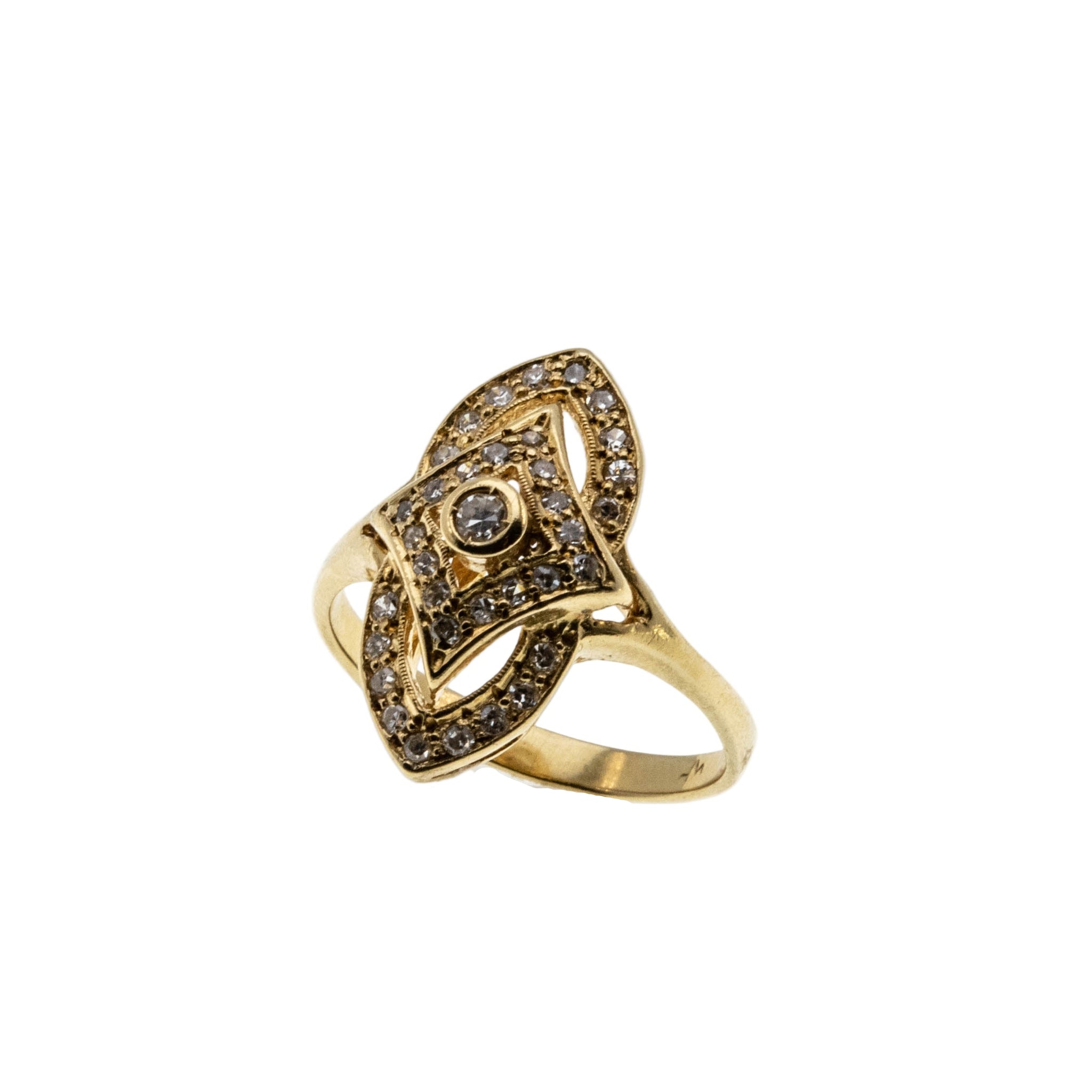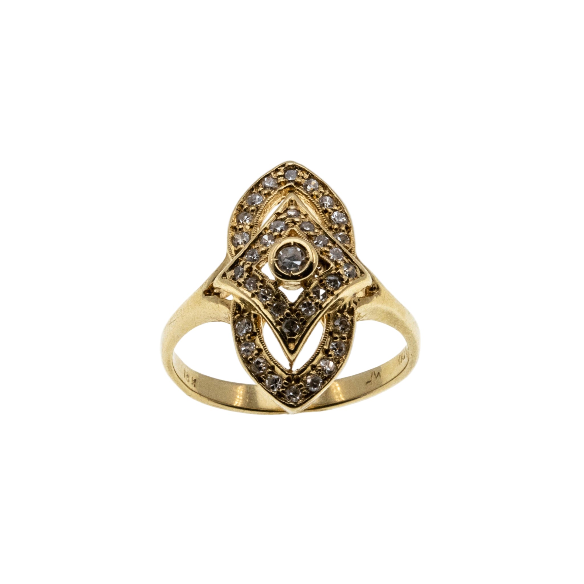 Marquise Elegance - Vintage Retro Italian 18K Gold Natural Diamond Ring. This unique ring is crafted in 18K yellow gold, hallmarked 18K, tested and confirmed. The ring features 5 natural round brilliant cut diamonds, 3 natural marquise cut diamonds, 35 natural single cut diamonds, vintage styling, and quality craftsmanship. The gallery on this ring is comprised of ribbons of gold, which are set with sparkling diamonds. The central diamond is expertly bezel-set, Whilst the ribbons are enhanced by shimmering bead-set diamonds, which form a diamond shaped setting, within a marquise setting. The milgrain decoration is yet another element, which adds detail, and character to the piece. The shank is smooth, and polished, which allows for a comfortable fit , and easy sizing. This elegant vintage ring would make a perfect addition to any jewelry collection.