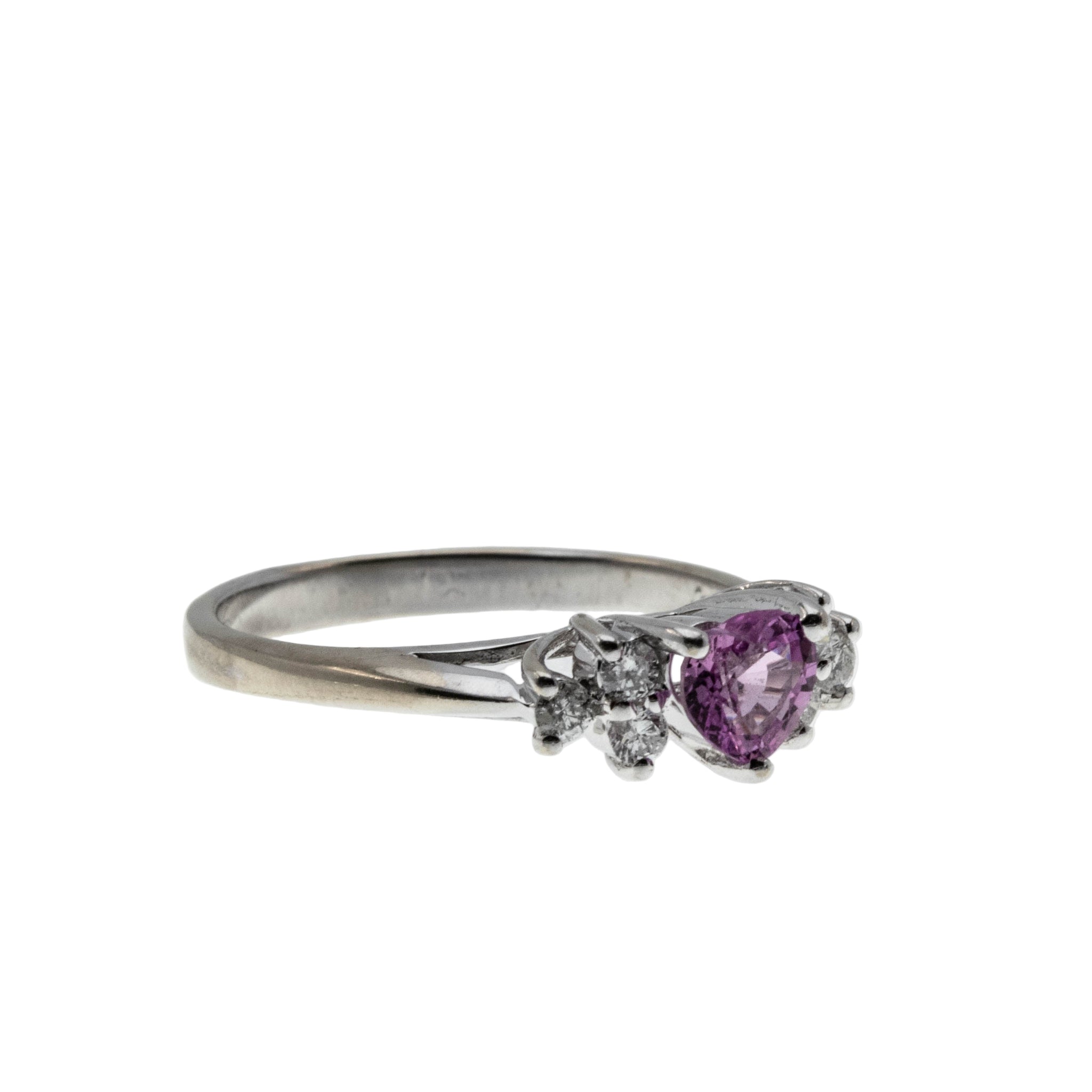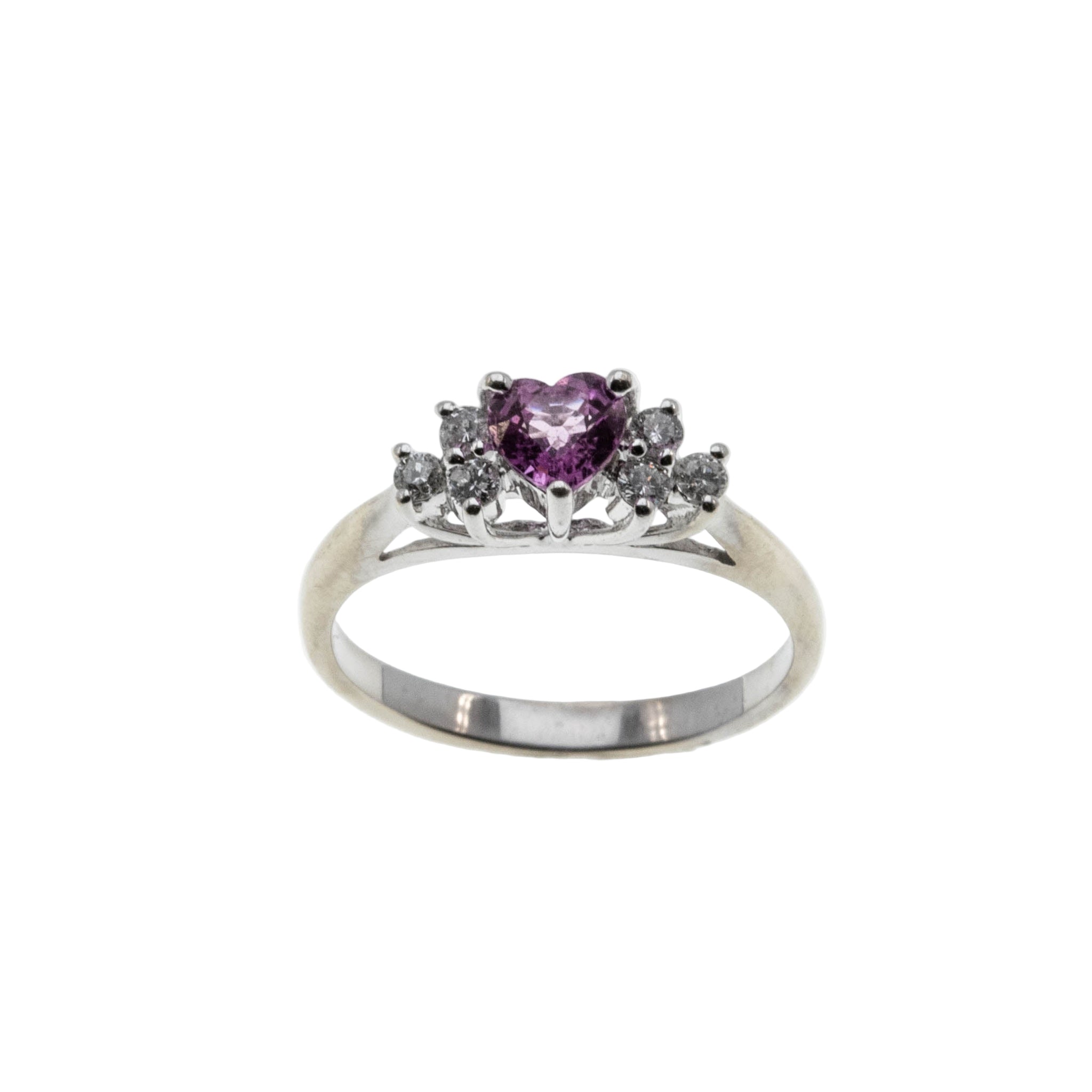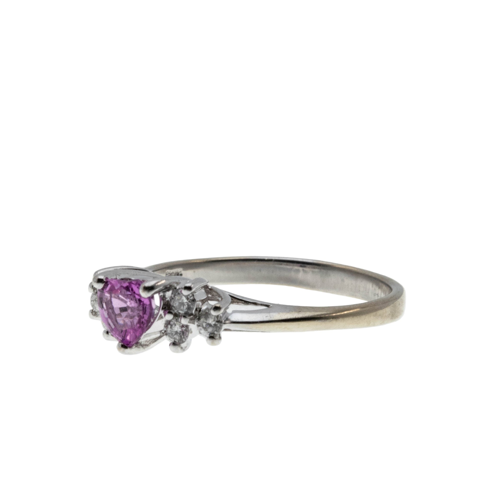 Pink Passion - Vintage Signed 'Cardow' 14K White Gold Natural Pink Sapphire & Diamond Heart Ring. This lovely ring is crafted from 14K white gold, hallmarked 14K 585.  Featuring a natural heart shaped faceted pink sapphire, 6 natural round brilliant cut diamonds, classic vintage styling and quality craftsmanship. The expertly claw-set sapphire takes centre stage in this ring, displaying a beautiful vibrant pink colour, with a purplish/pink hue. The sapphire is enhanced by bright white sparkling diamonds. The gallery on this ring is classic, and features a low profile setting, which makes for easy wearing. The shoulders are slightly tapered, leading down to a substantial smooth and polished shank, which allows for a comfortable fit and easy sizing. This vintage ring would make a unique engagement, anniversary ring, or wonderful addition to any fine jewelry collection.