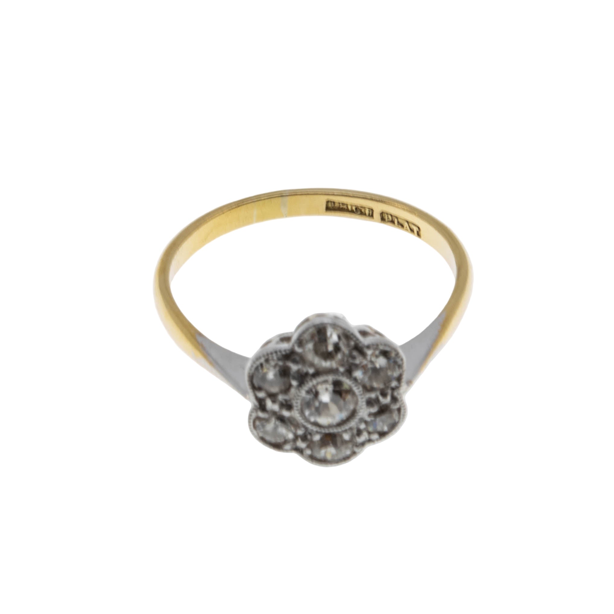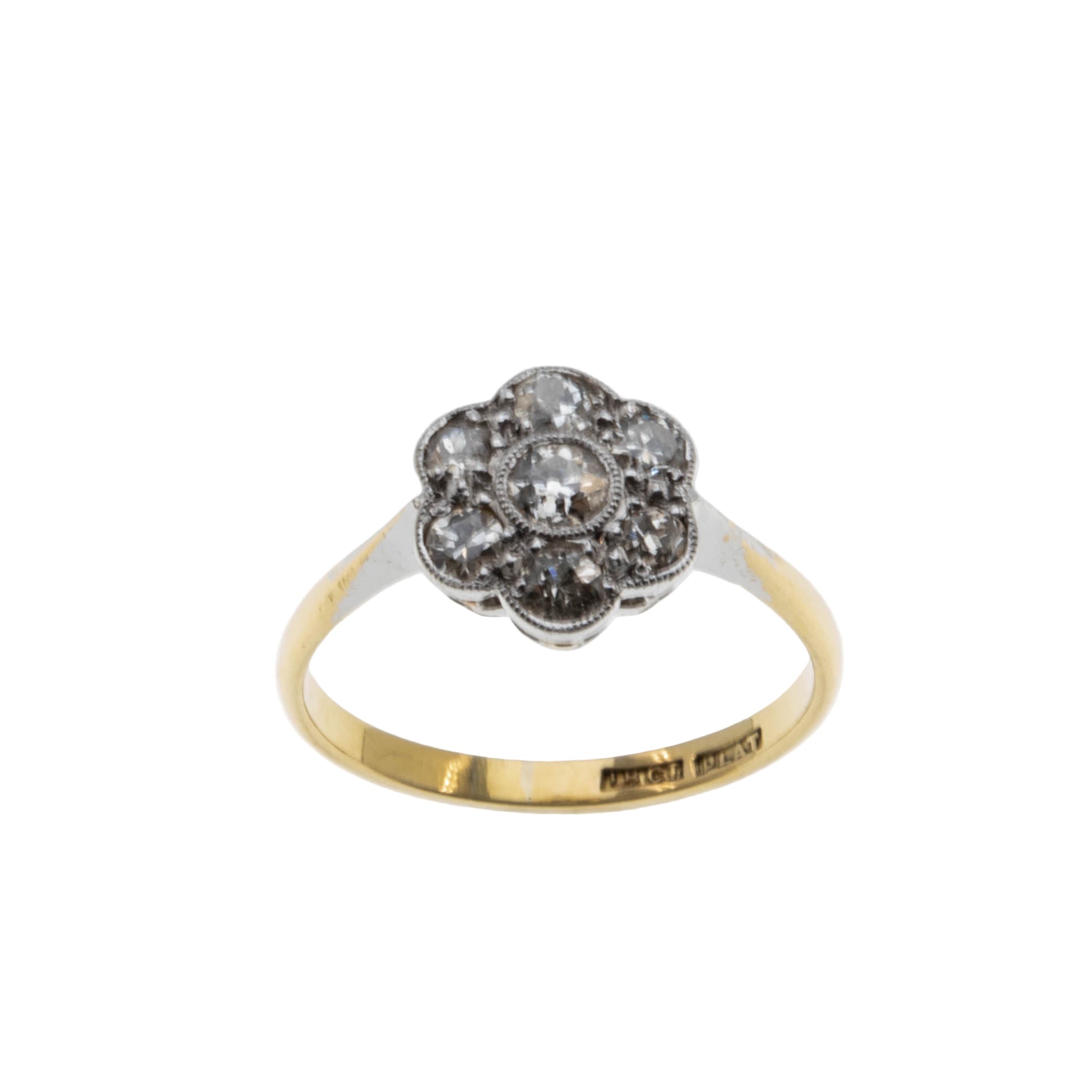 Sparkling Daisy - Edwardian English Platinum 18K Gold Natural 'Old European Cut' Diamond Flower Cluster Ring. This exquisite ring is crafted from 18K yellow gold, and platinum, hallmarked 18 (for 18CT) and PLAT (For Platinum). This ring features 7 natural 'Old European Cut', Edwardian era styling, and high quality craftsmanship. The gallery on this ring is made of platinum in the form of a daisy, which is adorned by clear sparkling diamonds. The gallery exhibits delicate milgrain decoration, adding character and detail to the piece. The band displays beautiful buttery yellow gold colour, and a smooth polished shank, which allows for a comfortable fit and easy sizing. This Edwardian era ring would make a perfect engagement ring, gift, or a wonderful addition to any fine vintage jewelry collection.