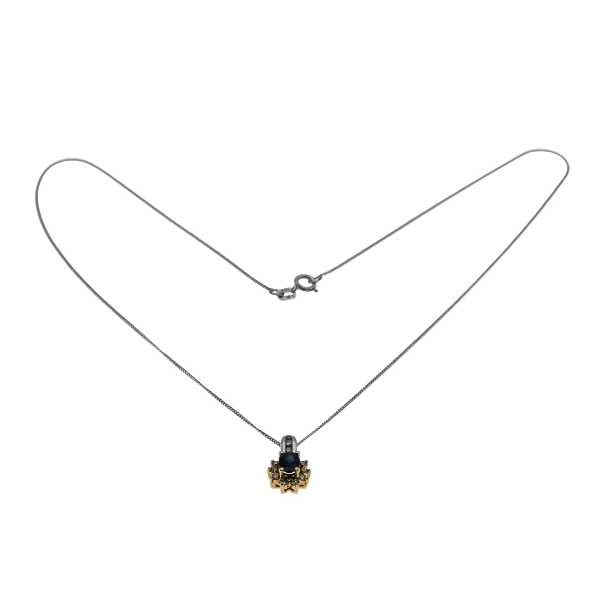 Starry Night - Vintage 14K Gold Natural Sapphire & Diamond Pendant & 10K Gold Chain. This classic pendant is crafted from 14K yellow, and white gold, hallmarked 14K.  The chain is crafted from 10K white gold, hallmarked 10k. Featuring one natural oval cut faceted sapphire, 13 natural round full cut diamonds, classic Vintage styling, and quality craftsmanship.  The gallery is expertly claw-set with a dark blue sapphire, and a sparkling surround of diamonds. It has a solid bale, enhanced with sparkling channel-set diamonds, which supports the gallery perfectly. The chain is a solid curb link style, featuring a secure spring ring clasp, in perfect working order.  This vintage pendant is classic and so versatile. It can be worn with everything and anything, day or night!