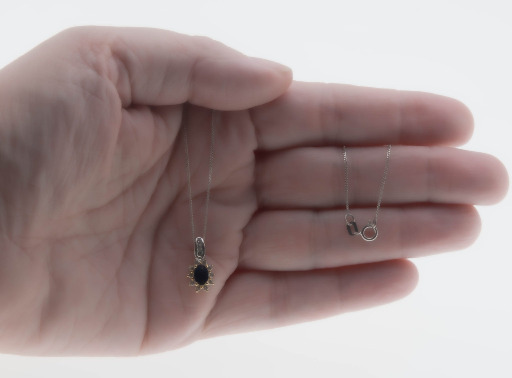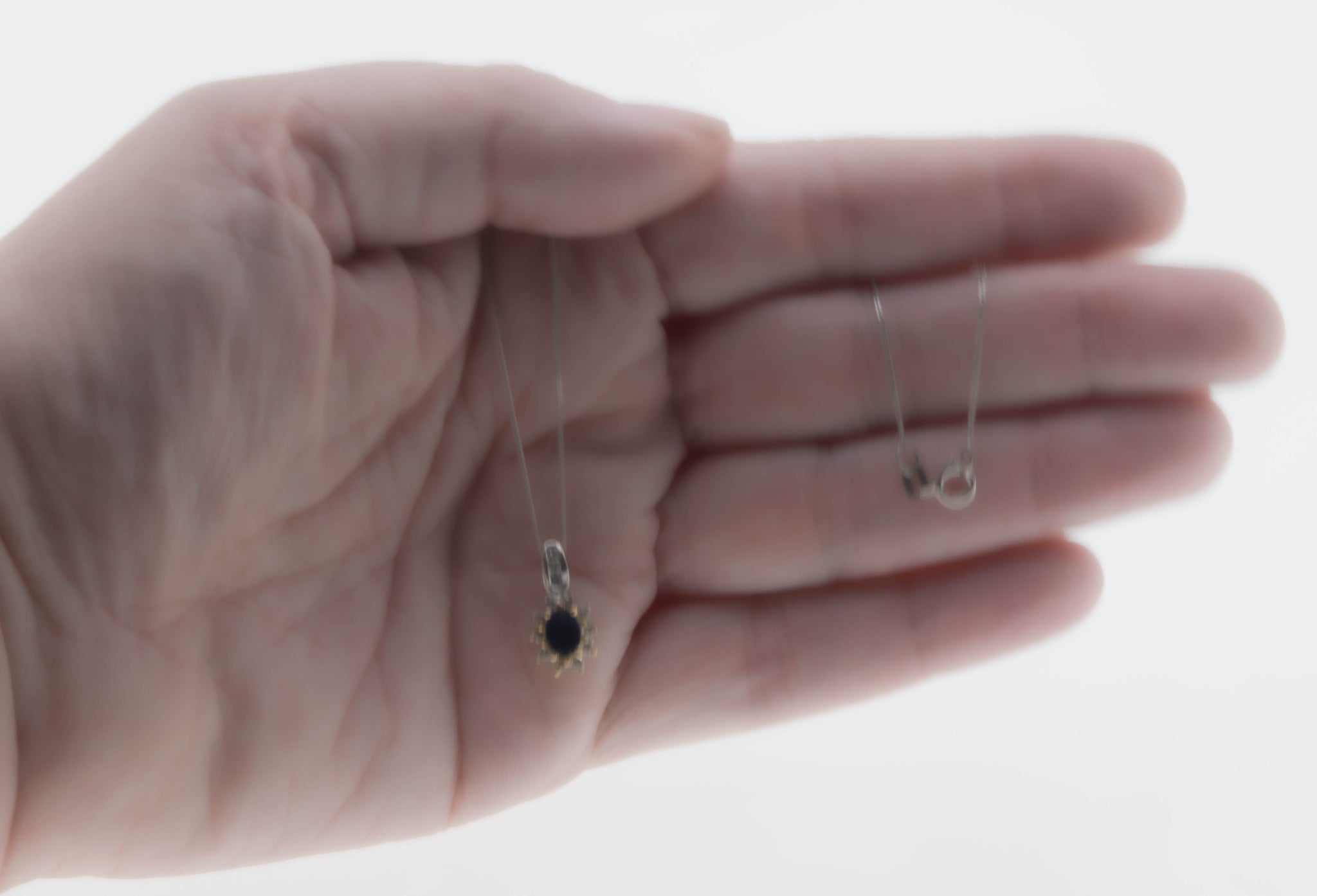 Measurements: Pendant 16.00 mm x 8.50 mm      Chain 17"