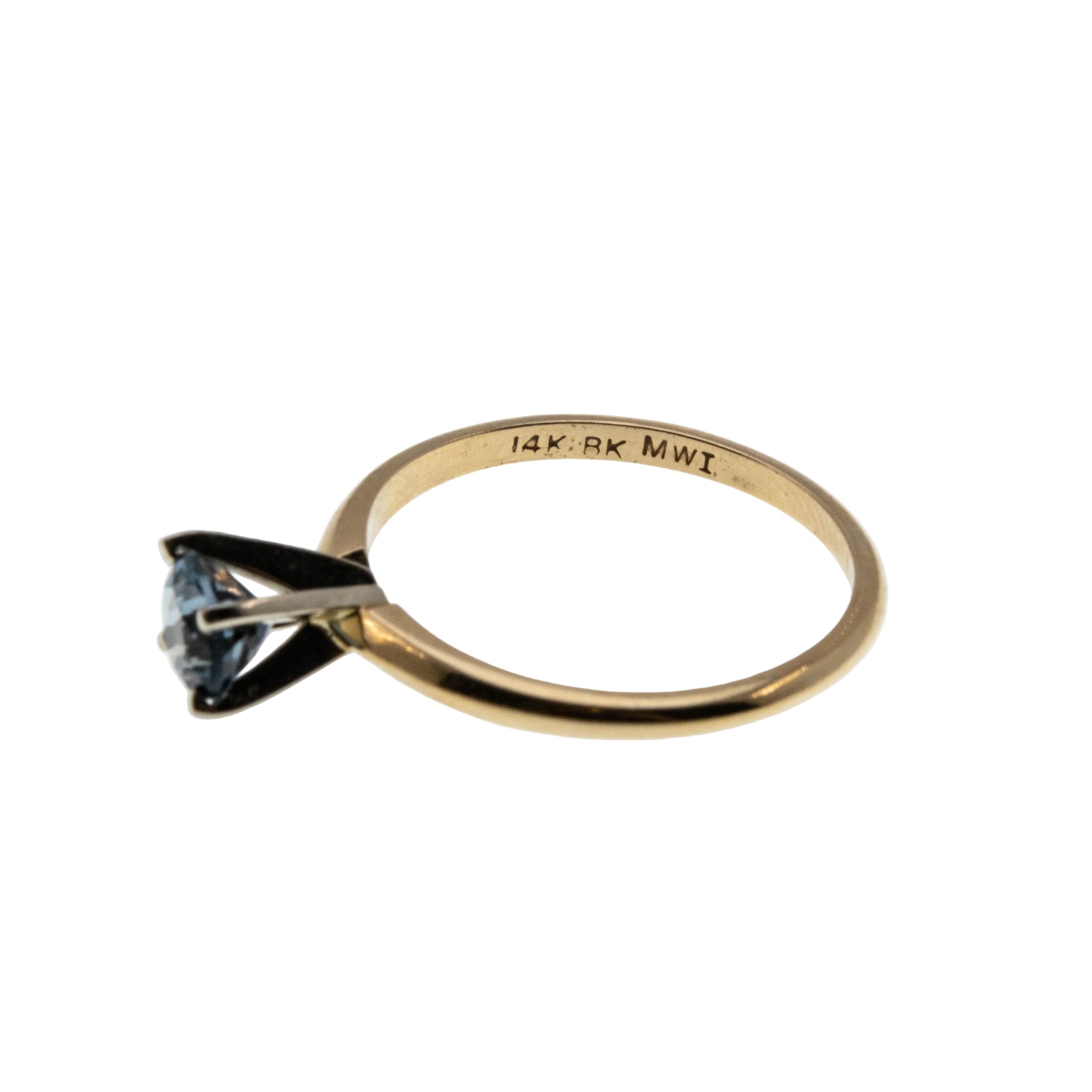 Classic Blue - Vintage 14K Gold Natural London Blue Topaz Solitaire Ring. This lovely ring is crafted from 14K yellow and white gold, hallmarked 14K, and a makers mark . The ring features one natural round cut faceted London Blue Topaz, vintage classic styling, and quality craftsmanship. The gallery on this ring is expertly claw-set with a beautiful vibrant London Blue Topaz, displaying bluish/greenish hues. The shoulders are slightly tapered, which leads down to a solid shank . The shank is smooth and polished, which allows for a comfortable fit and easy sizing. This wonderful vintage ring would make a unique engagement ring, or perfect addition to any fine jewelry collection.