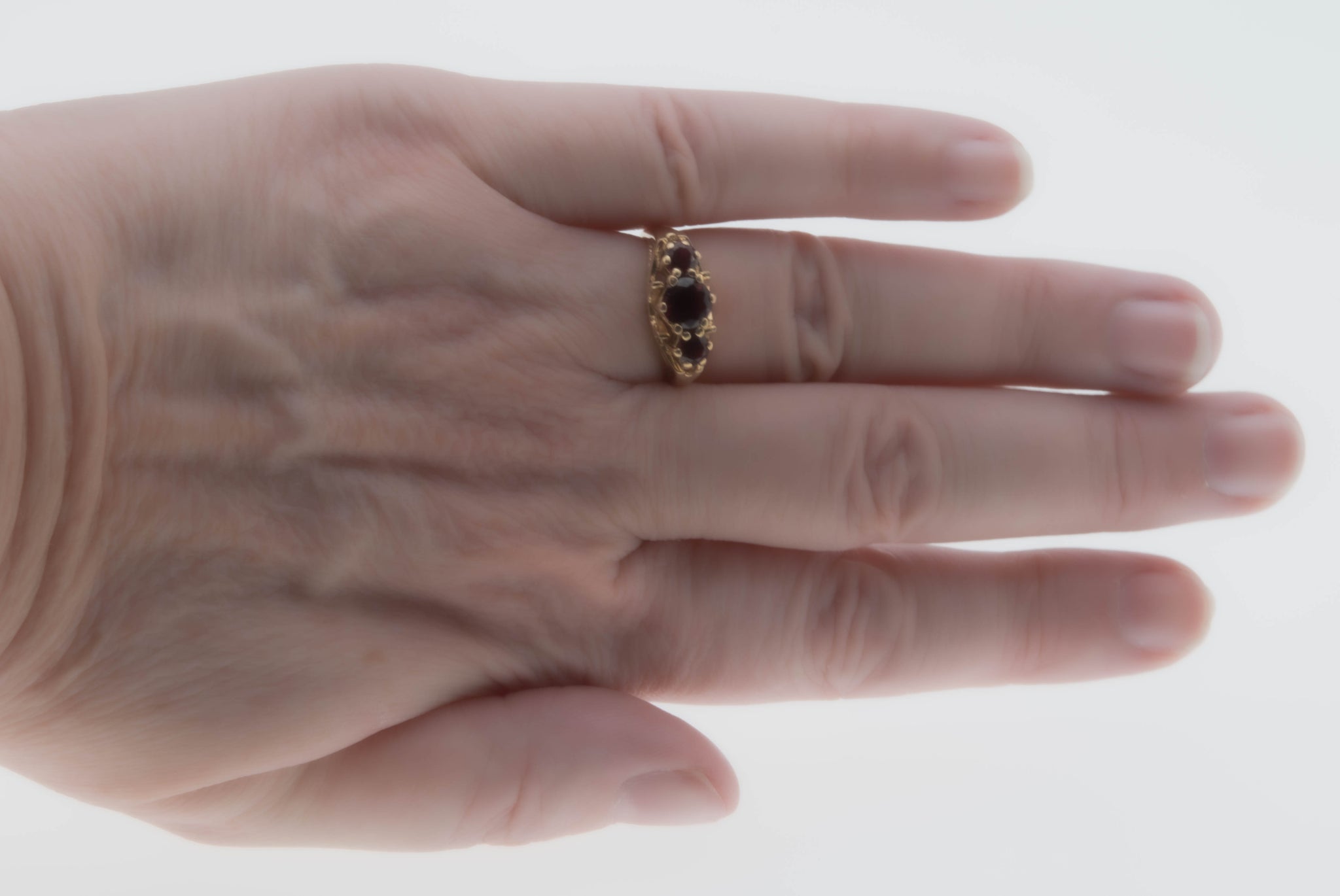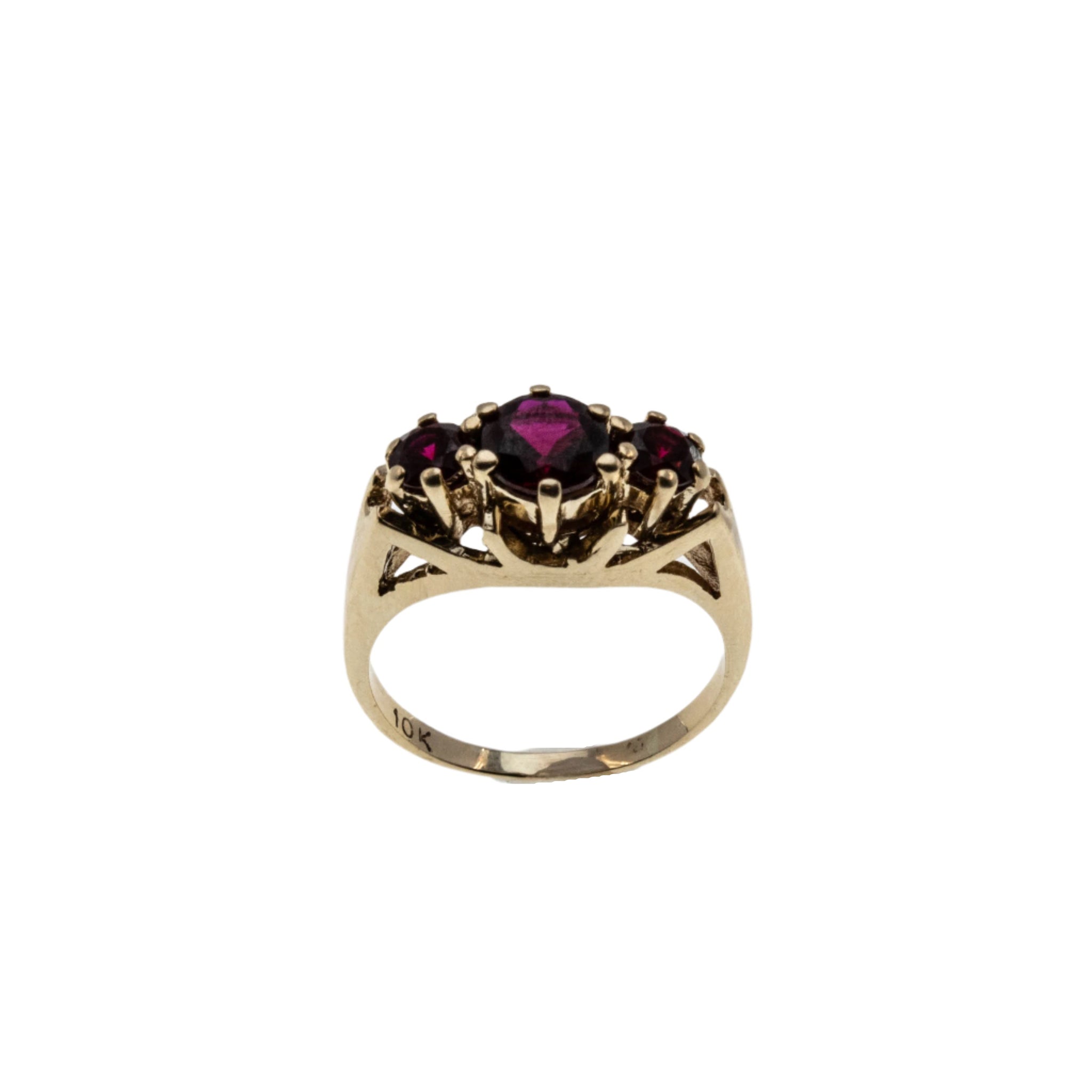 Red, Red Wine - Vintage 10K Gold Synthetic Ruby Trio Ring. This eye-catching ring is crafted from 10K yellow gold, hallmarked 10K. The ring features 3 synthetic round cut rubies, vintage styling, and quality craftsmanship. This vintage ring is comprised of a trip of expertly claw-set vibrant deep red rubies (synthetic). The galley and the ring is substantial, which is ideal for daily wear. The shank is smooth, and polished, which allows for easy sizing, and a comfortable fit. This vintage ring would make a great addition to any vintage jewelry collection.