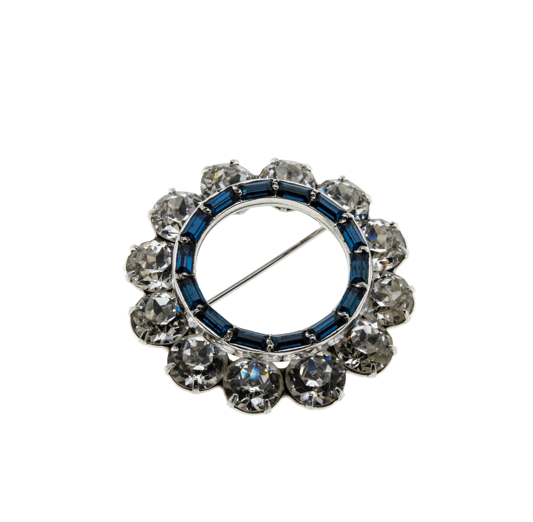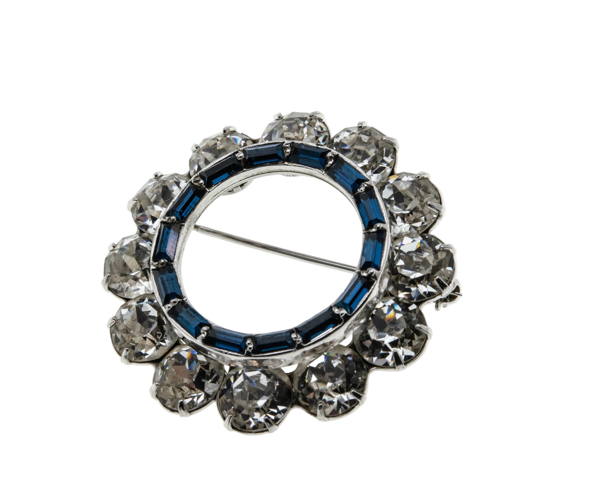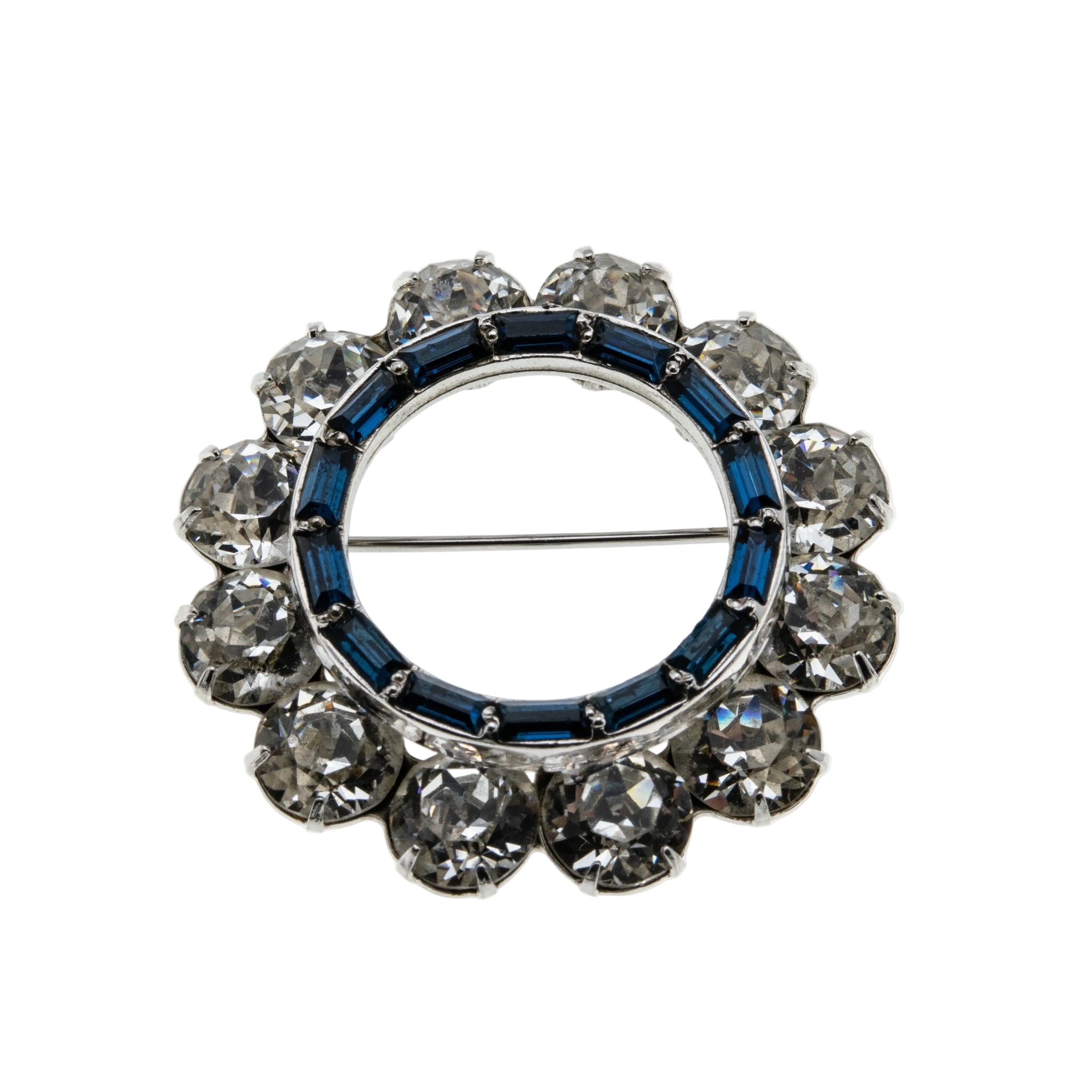 Blue & White Wreath - Vintage Rhodium Plated Crystal Rhinestone Brooch. This gorgeous brooch is crafted from rhodium plate. The brooch features numerous round cut faceted crystal rhinestones, numerous baguette cut crystal rhinestones, vintage styling, and quality craftsmanship. This brooch is made in the form of a wreath, which is expertly hand-set with beautiful clear, and sapphire blue sparkling crystal rhinestones. The back of the brooch features a pin, and rotary locking mechanism, in perfect working order. This wonderful brooch is high quality, and in wonderful vintage condition.