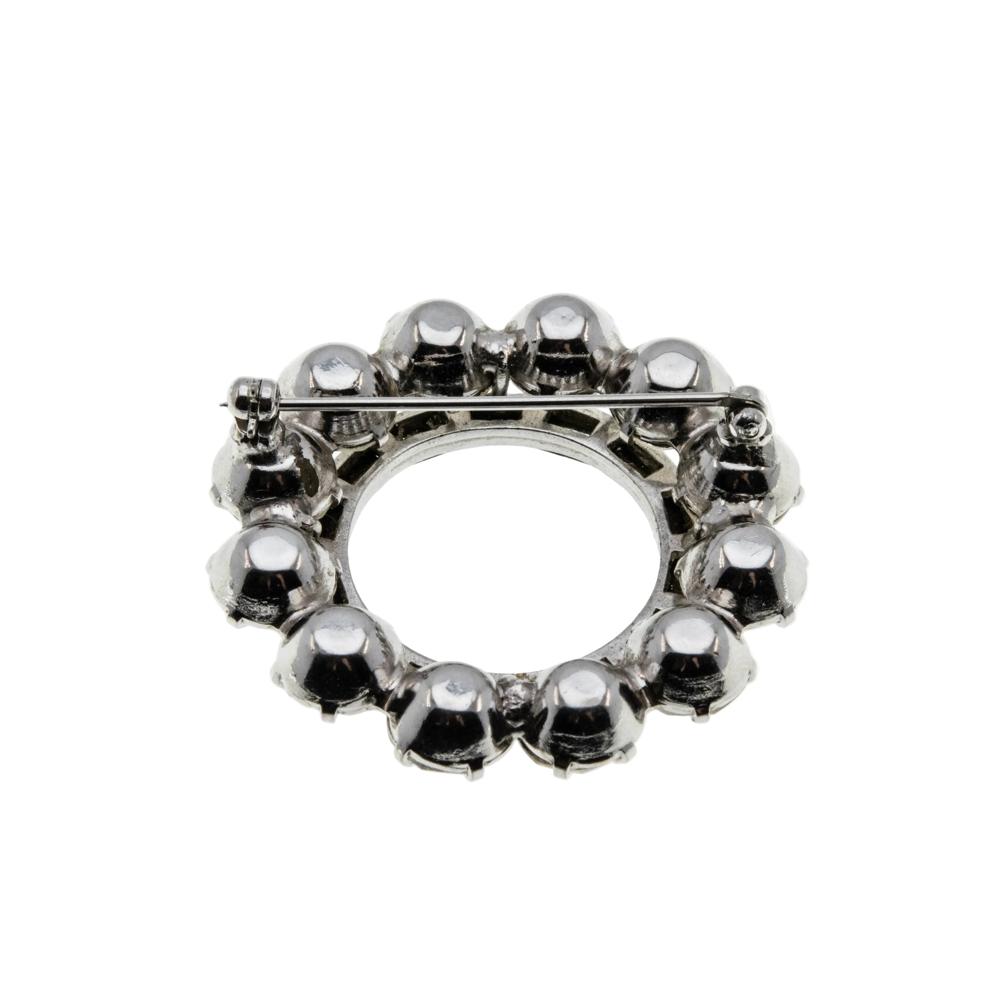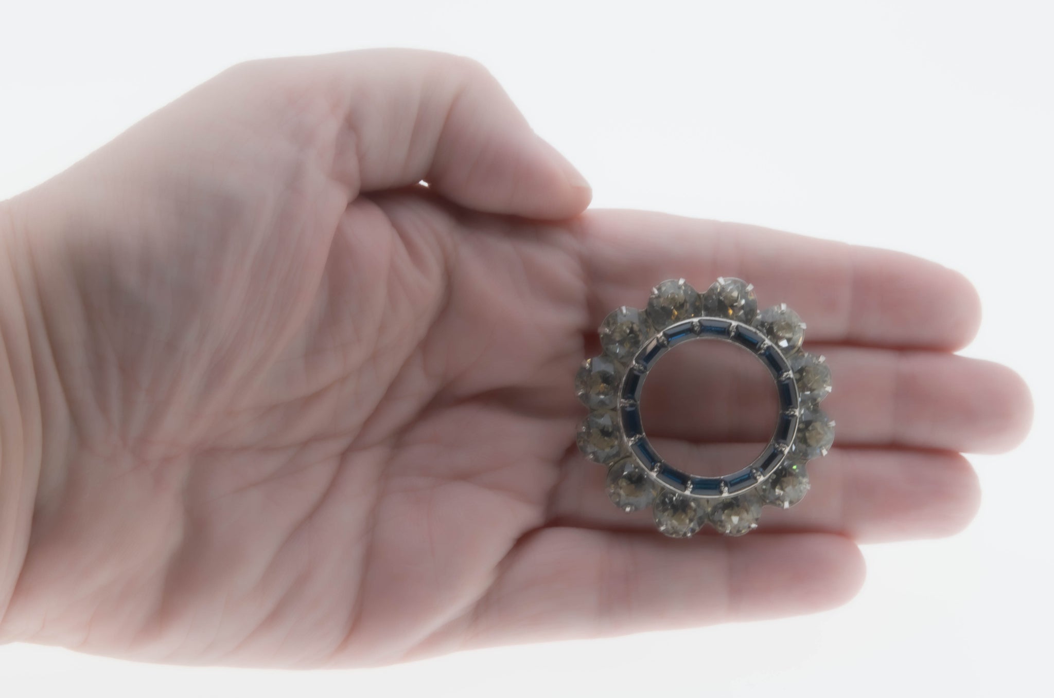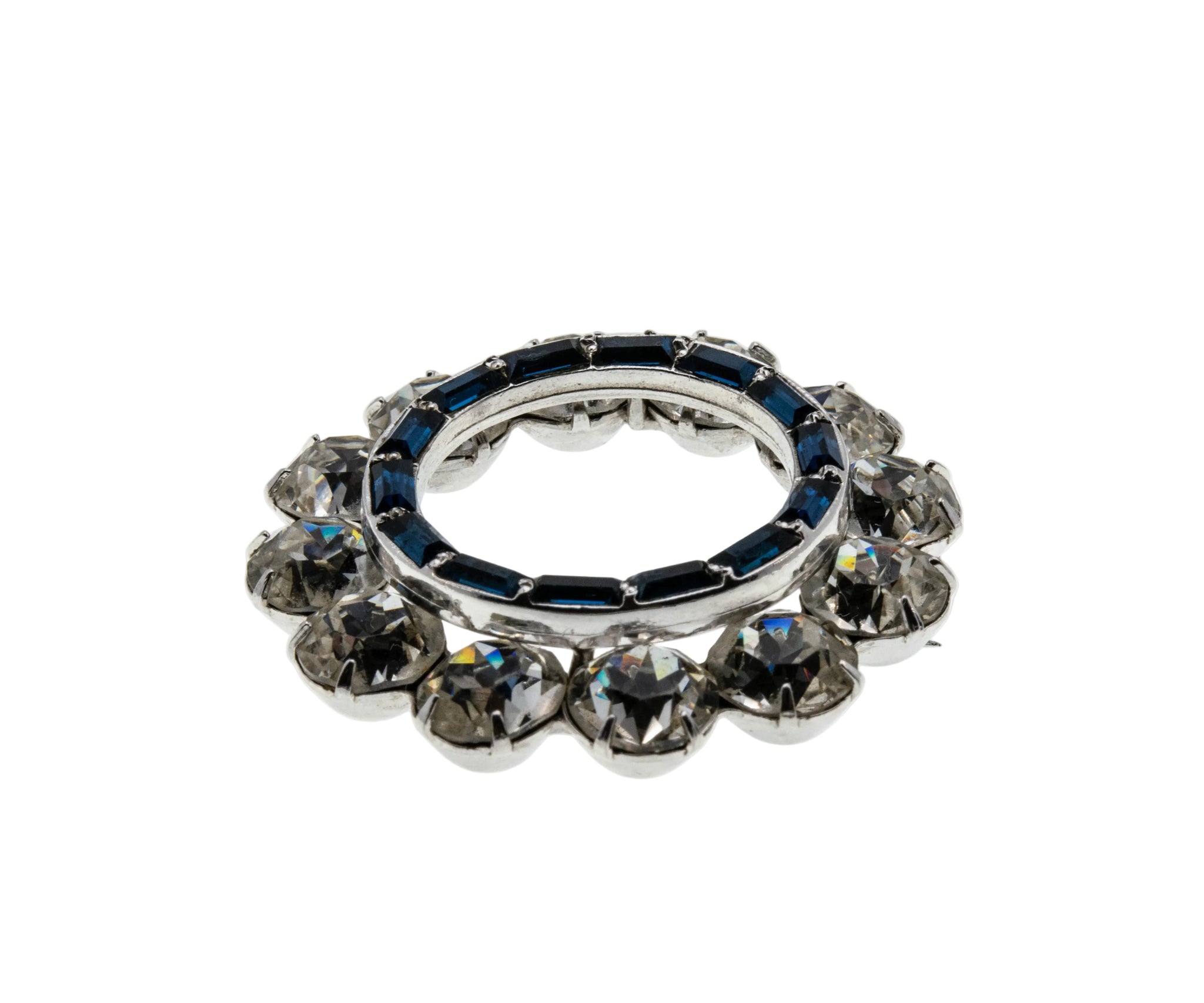 Blue & White Wreath - Vintage Rhodium Plated Crystal Rhinestone Brooch. This gorgeous brooch is crafted from rhodium plate. The brooch features numerous round cut faceted crystal rhinestones, numerous baguette cut crystal rhinestones, vintage styling, and quality craftsmanship. This brooch is made in the form of a wreath, which is expertly hand-set with beautiful clear, and sapphire blue sparkling crystal rhinestones. The back of the brooch features a pin, and rotary locking mechanism, in perfect working order. This wonderful brooch is high quality, and in wonderful vintage condition.