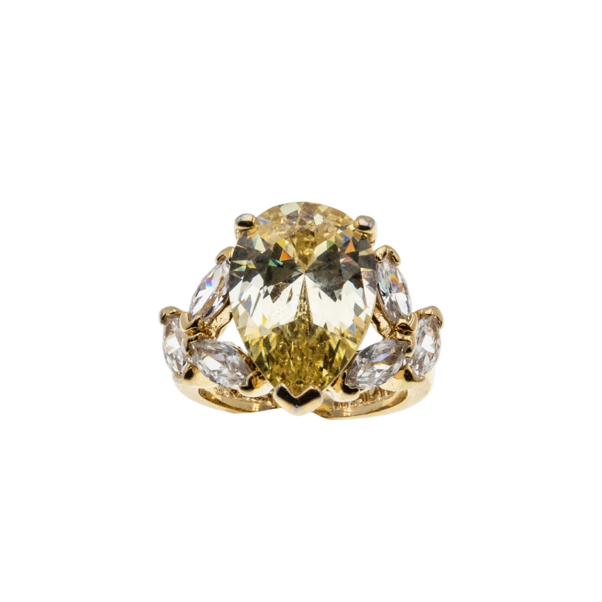 Canary Yellow Sparkler - Vintage Gold Plated Sterling Silver Cubic Zirconia Ring. This statement ring is crafted from sterling silver, hallmarked 925, and Thailand. The ring features one pear shaped faceted cubic zirconia, 6 marquise shaped cubic zirconias, classic styling, and quality craftsmanship. The gallery on this ring showcases a beautiful pale yellow canary cubic zirconia gemstone, which is flanked by sparkling marquise gemstones. The ring is substantial and the band is smooth, and polished, which allows for a comfortable fit.  This vintage ring looks stunning when worn, and would make a perfect gift, or addition to any jewelry collection.