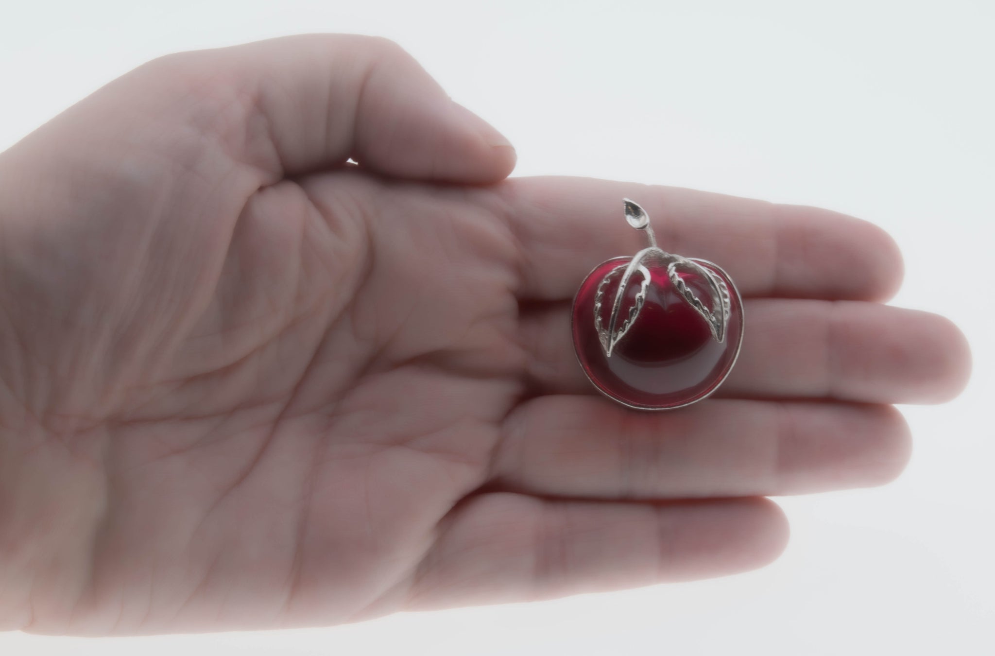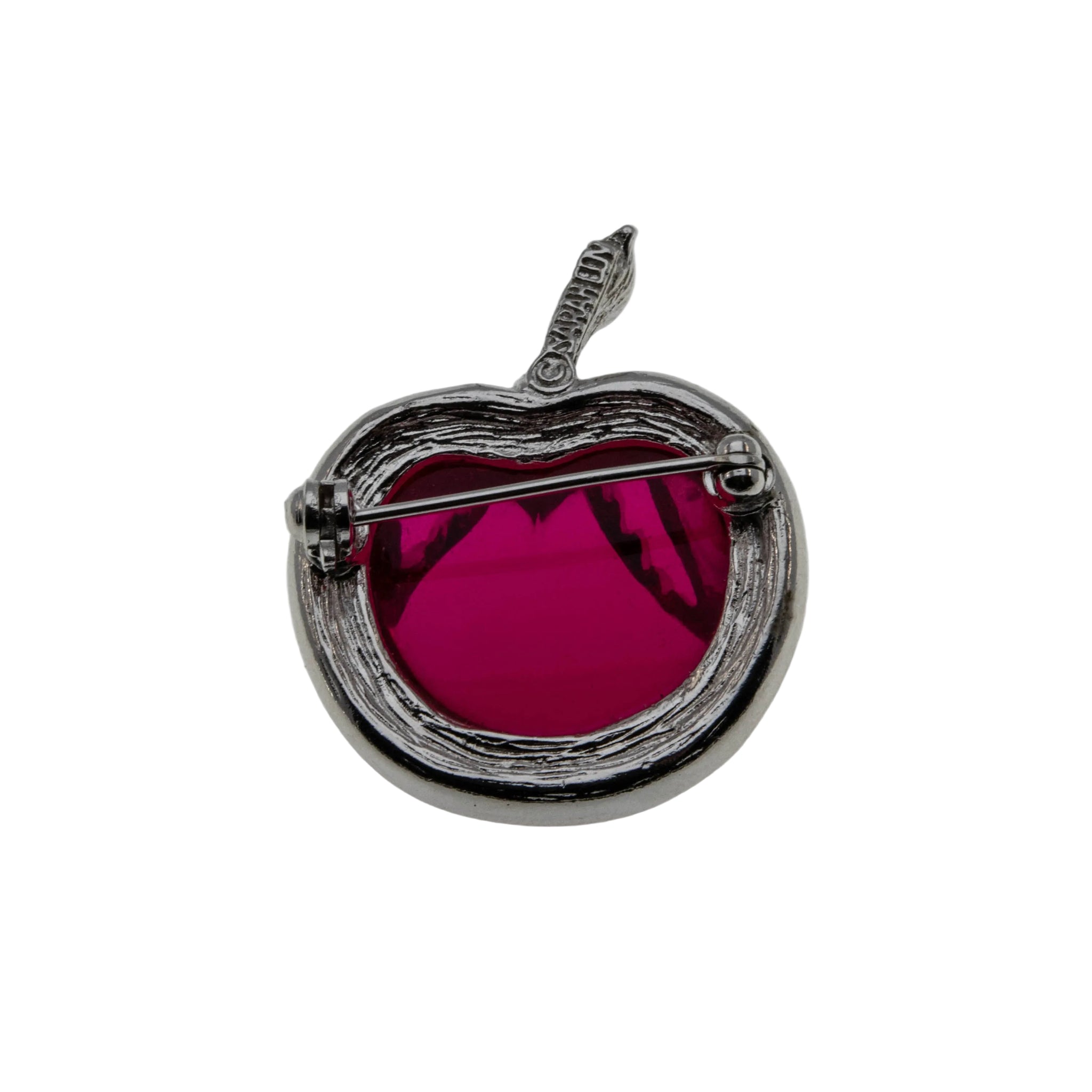 Cheri Cheri Lady - Vintage Retro Signed Sarah Coventry Silver Tone Lucite Cherry Brooch . This wonderful brooch is crafted from a silver toned metal. Featuring one cabochon lucite gem, vintage retro era styling, and quality craftsmanship. This adorable pre-owned beautiful jelly brooch is in excellent condition. This signed brooch is cherry red with a silver toned background. The red/fushia coloured lucite has a beautiful jewel like quality to it, which is transparent and glowing. This fuchsia lucite brooch measures 1 3/8” / 3.5 cm long and 1 1/8” / 2.8 cm wide. This vintage brooch was manufactured in 1972, in silver tone, for the Canadian market. This is a wonderful retro treasure!