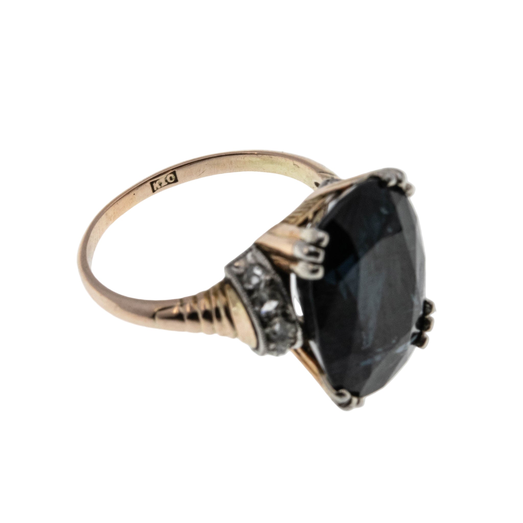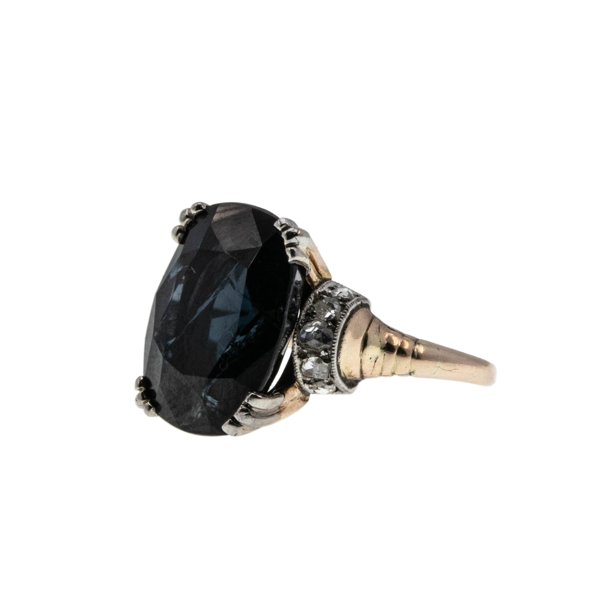 Contrasting Gems - Vintage 10K Gold Natural Blue Spinel & Rose Cut Diamond Ring. This unique ring is crafted from 10K yellow and white gold, hallmarked K10 for 10K gold. The ring features one natural oval brilliant blue spinel, 10 natural rose cut diamonds, classic styling, and quality craftsmanship. The gallery on this ring is expertly triple-claw-set with a beautiful cobalt blue spinel, which is enhanced by glowing diamond arched shoulders, and a very pretty raised decoration. The ring has a smooth, and polished shank, which allows for a comfortable fit, and easy sizing. This unique vintage ring would make a great addition to any fine jewelry collection.