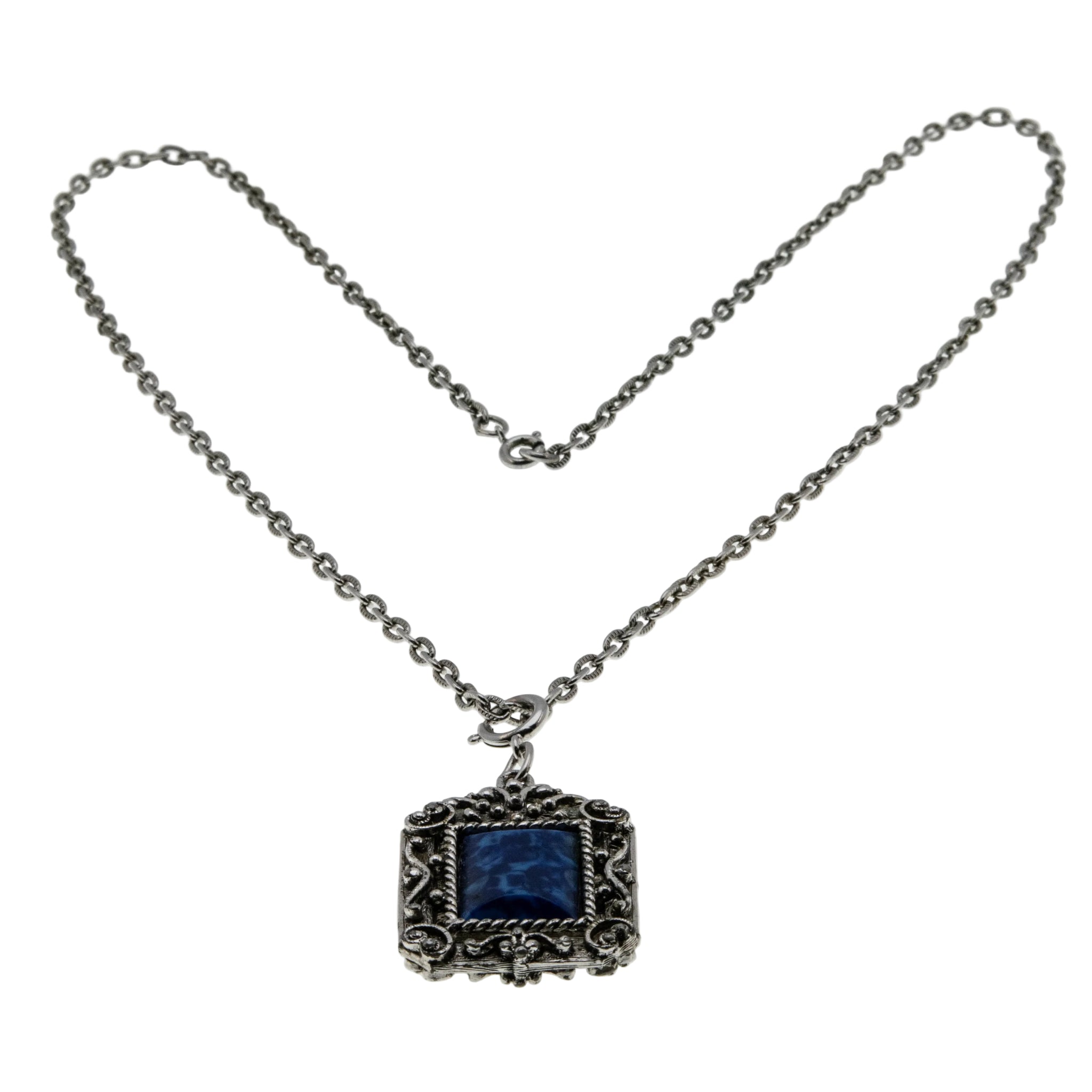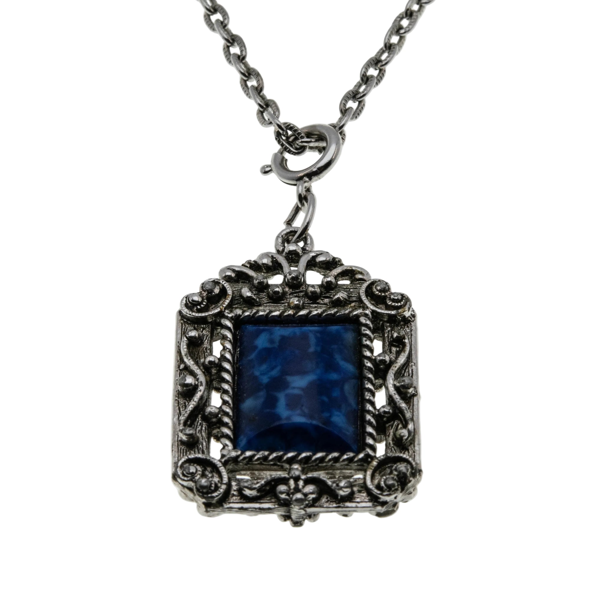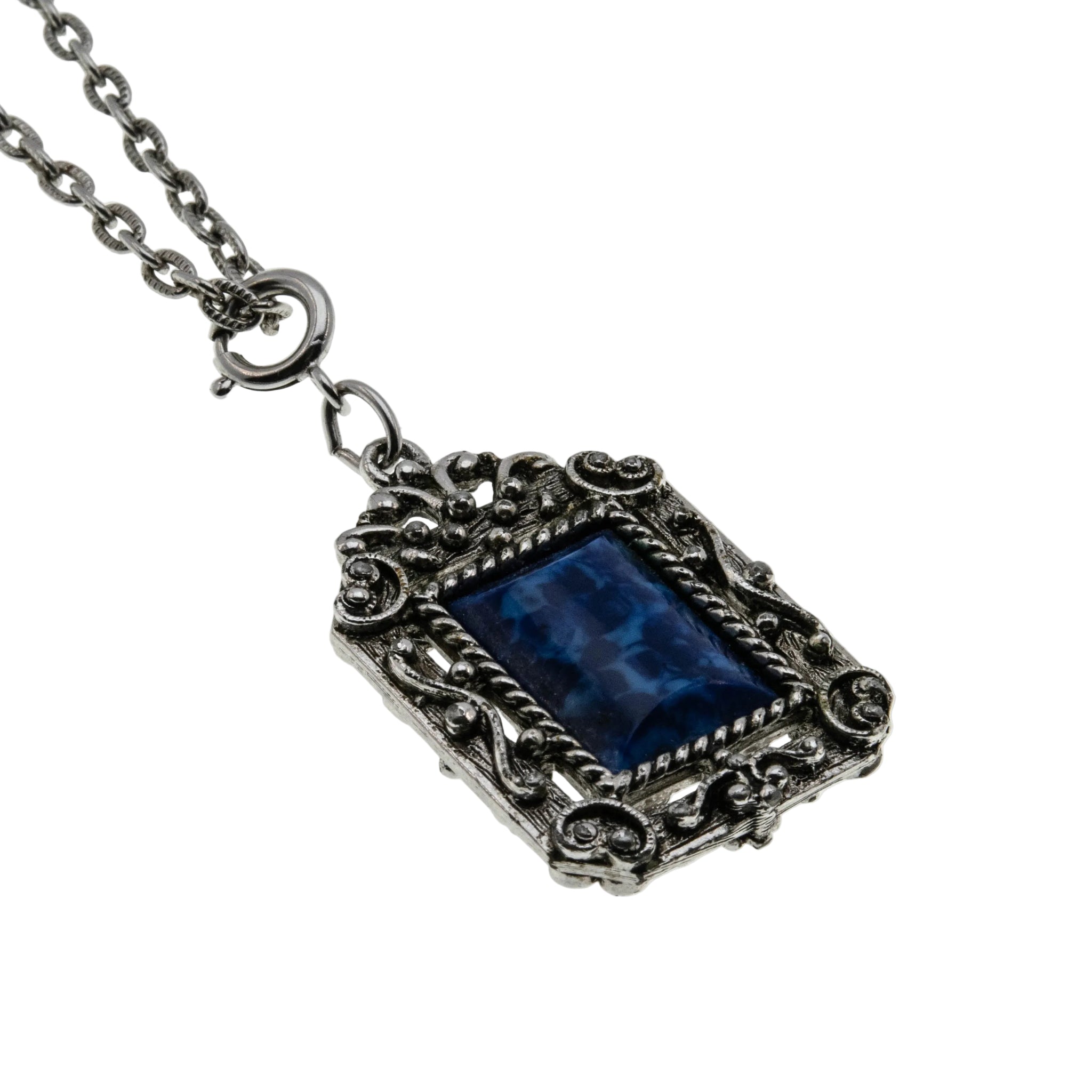Victorian Revival - Vintage Silver Tone Lapis Lazuli (Simulated) Ornate Pendant & Chain. This gorgeous pendant is crafted from a silver toned metal. The pendant features one rectangular shaped lapis lazuli (simulated), Victorian Revival vintage era styling, and quality craftsmanship. This pendant is comprised of a beautiful marbled indigo blue simulated lapis lazuli gemstone, which has an exquisite ornate open-work frame. The back of the pendant is also ornate, displaying a wonderful cross, and raised open-work detail. The pendant is matched up to a decorative chain, featuring a secure spring ring clasp, in perfect working order. This vintage era pendant is versatile and an eye-catching piece, which can be worn day or night.