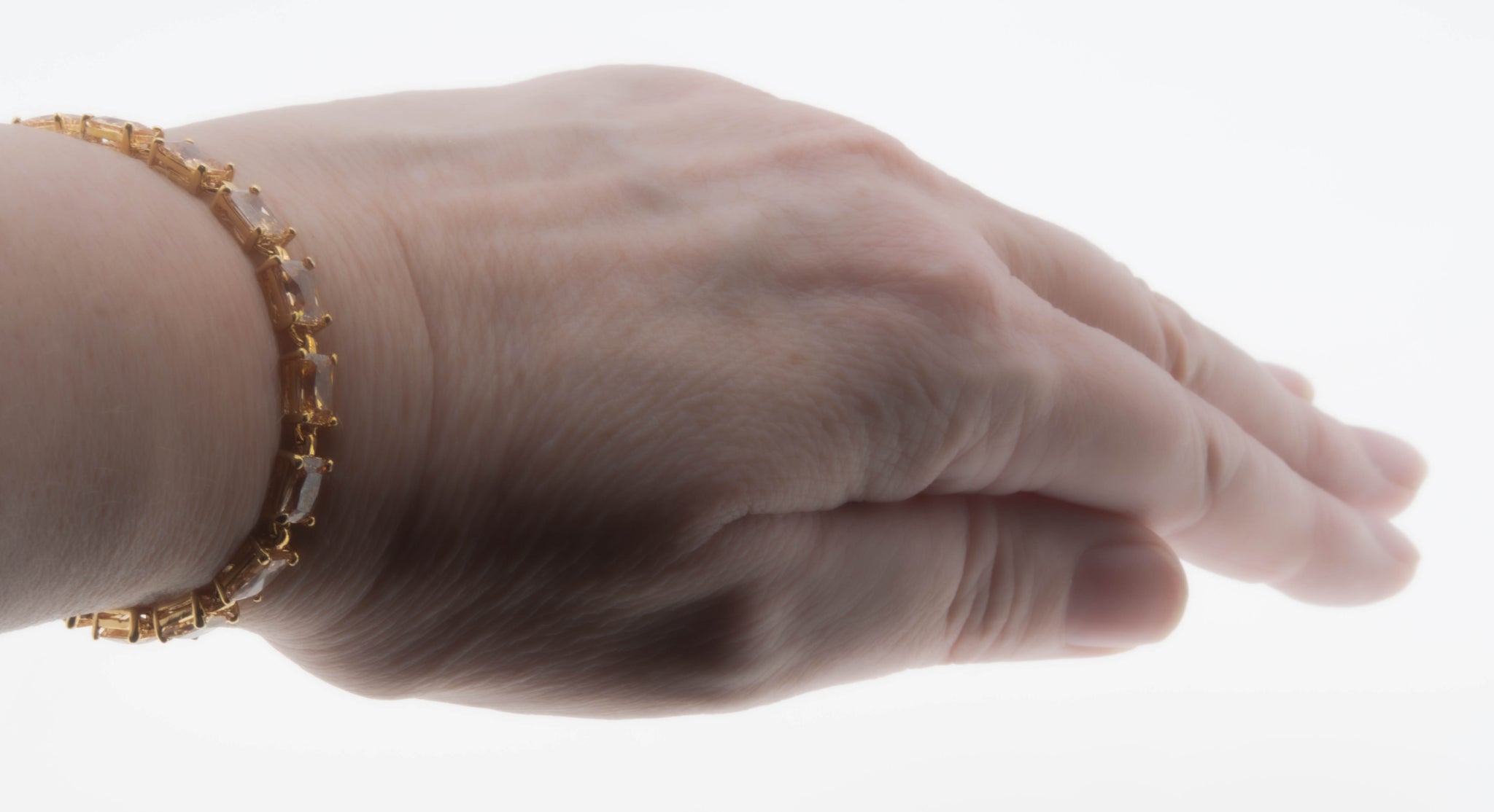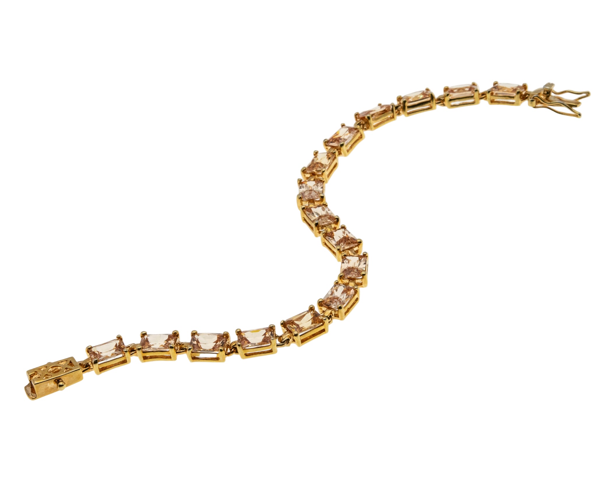 Imperial Princess - Vintage Gold Plated Imperial Topaz Coloured Princess Cut Cubic Zirconia Tennis Bracelet. This gorgeous bracelet is crafted from gold plate over metal. The bracelet features 16 princess cut gems, vintage styling, and quality craftsmanship. This bracelet is comprised of expertly claw-set sparkling cubic zirconia gems, which adorn the bracelet all the way around (known as a tennis bracelet). The gems sparkle like diamonds, and display a wonderful unique peachy/champagne hue, resembling imperial topaz gems. The bracelet features a slide locking system, and two additional security hook-type locks, in perfect working order. This vintage bracelet looks fabulous on its own or stacked with other bracelets. Glamorous and gorgeous!