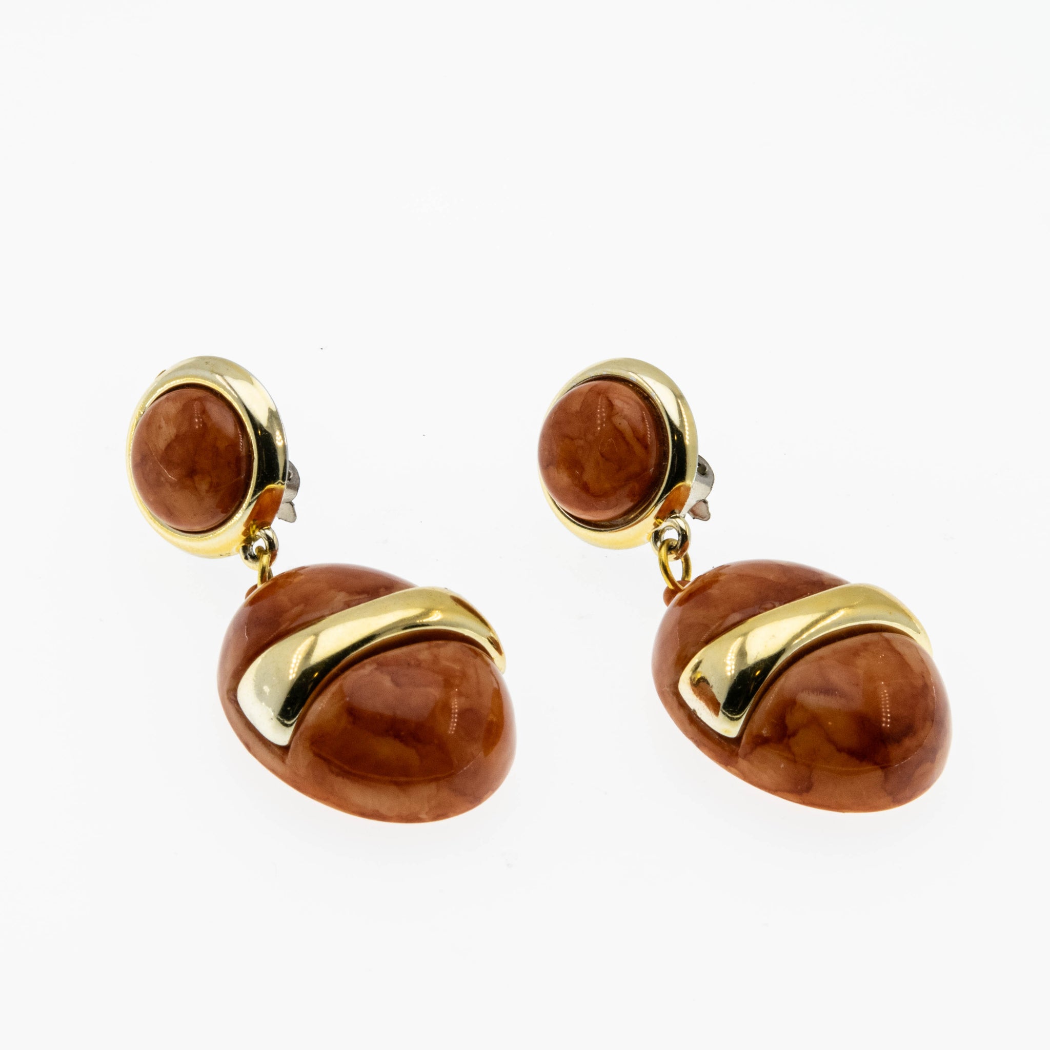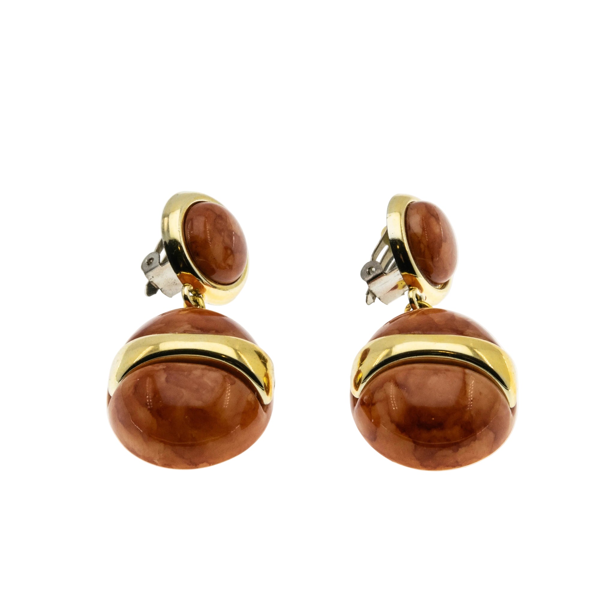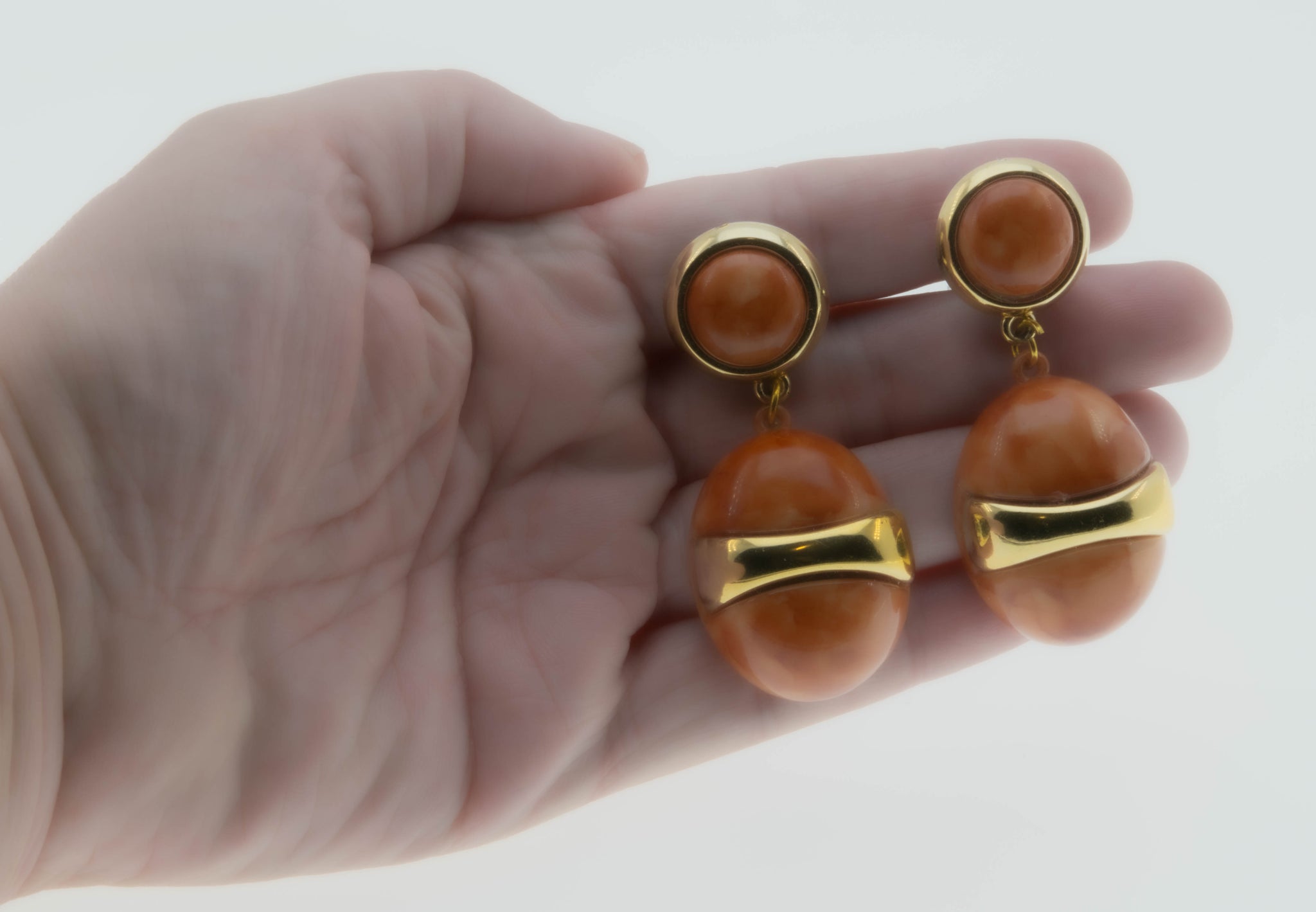 In Vogue - Vintage Retro Gold Plated Marbleized Lucite Dangly Runway Earrings. These vintage earrings are crafted from gold plate over metal. They feature lucite, vintage styling, and quality craftsmanship. These earrings are comprised of a beautiful marbled orange lucite, which are enhanced by beautiful polished gold accents. The surmounts are for pierced and non pierced ears, featuring vintage clip-on backings. The wonderful dangle is oval shaped, and articulated in such a way that they have the perfect sway. They are substantial earrings, however light on the ears, which allows for a comfortable fit. This vintage earrings were so in vogue in the 1970s/1980s... so couture!