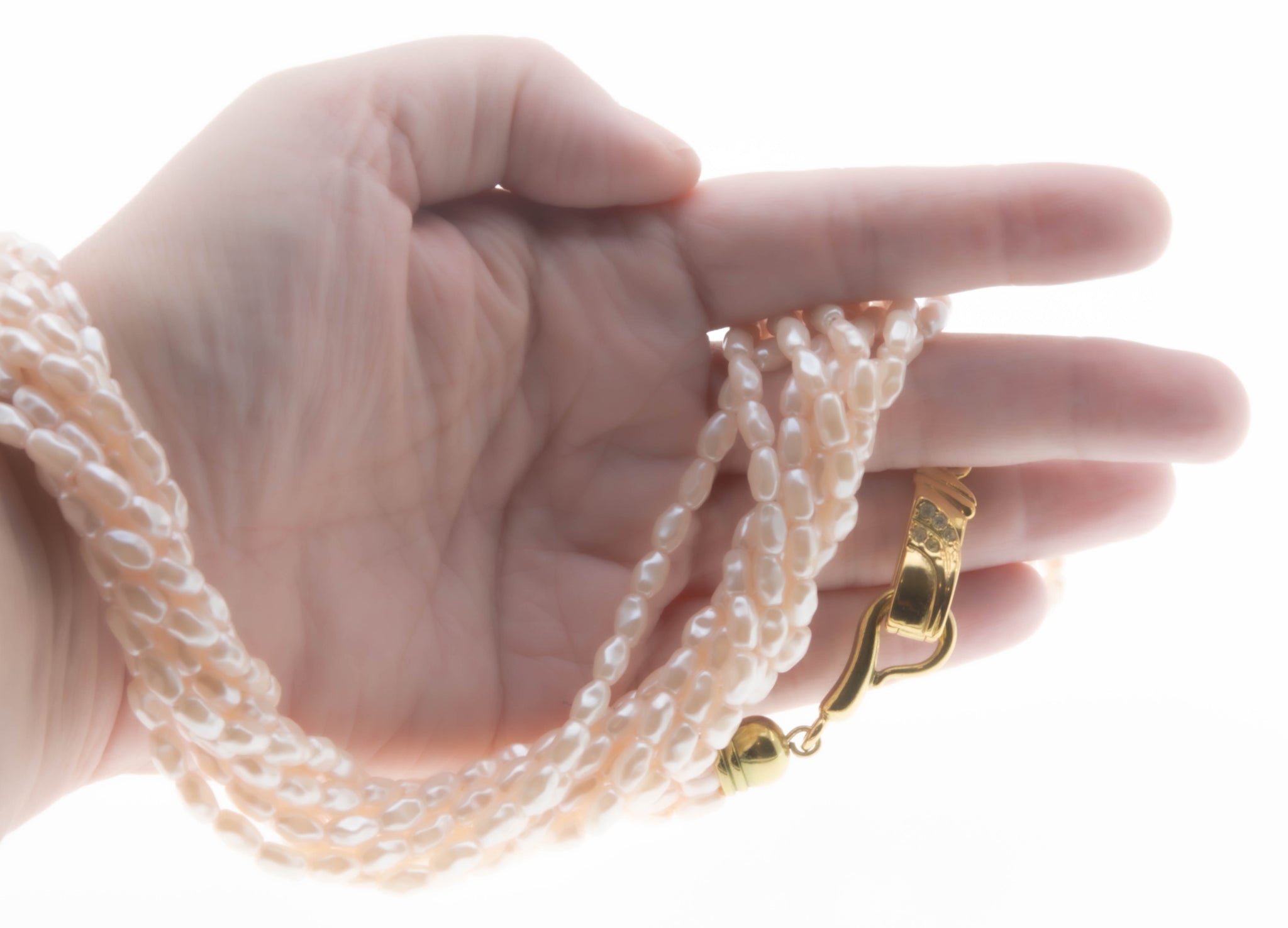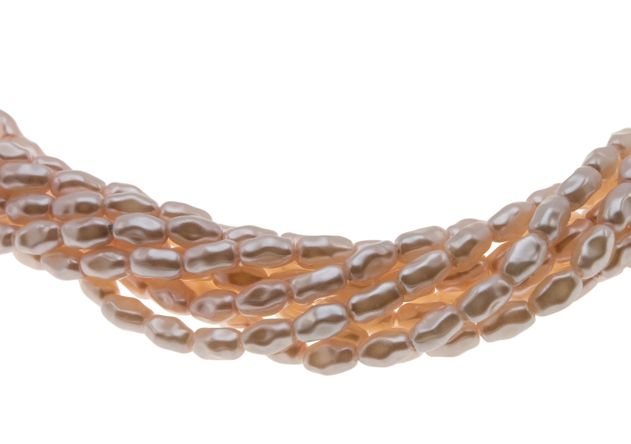 River Of Pearls - Vintage Gold Plated Pastel Pink Simulated Pearl Crystal Rhinestone Necklace. This lovely necklace is crafted from gold plate over metal. The necklace features numerous simulated freshwater pearls, 5 round cut crystal rhinestones, vintage styling, and quality craftsmanship. This vintage necklace is comprised of 8 strands of pastel pink freshwater pearls, which are expertly capped on the ends. The clasp is hinged (in perfect working order), and adorned by sparkling clear crystal rhinestones. This vintage necklace looks stunning when worn, and perfect for just about any occasion.
