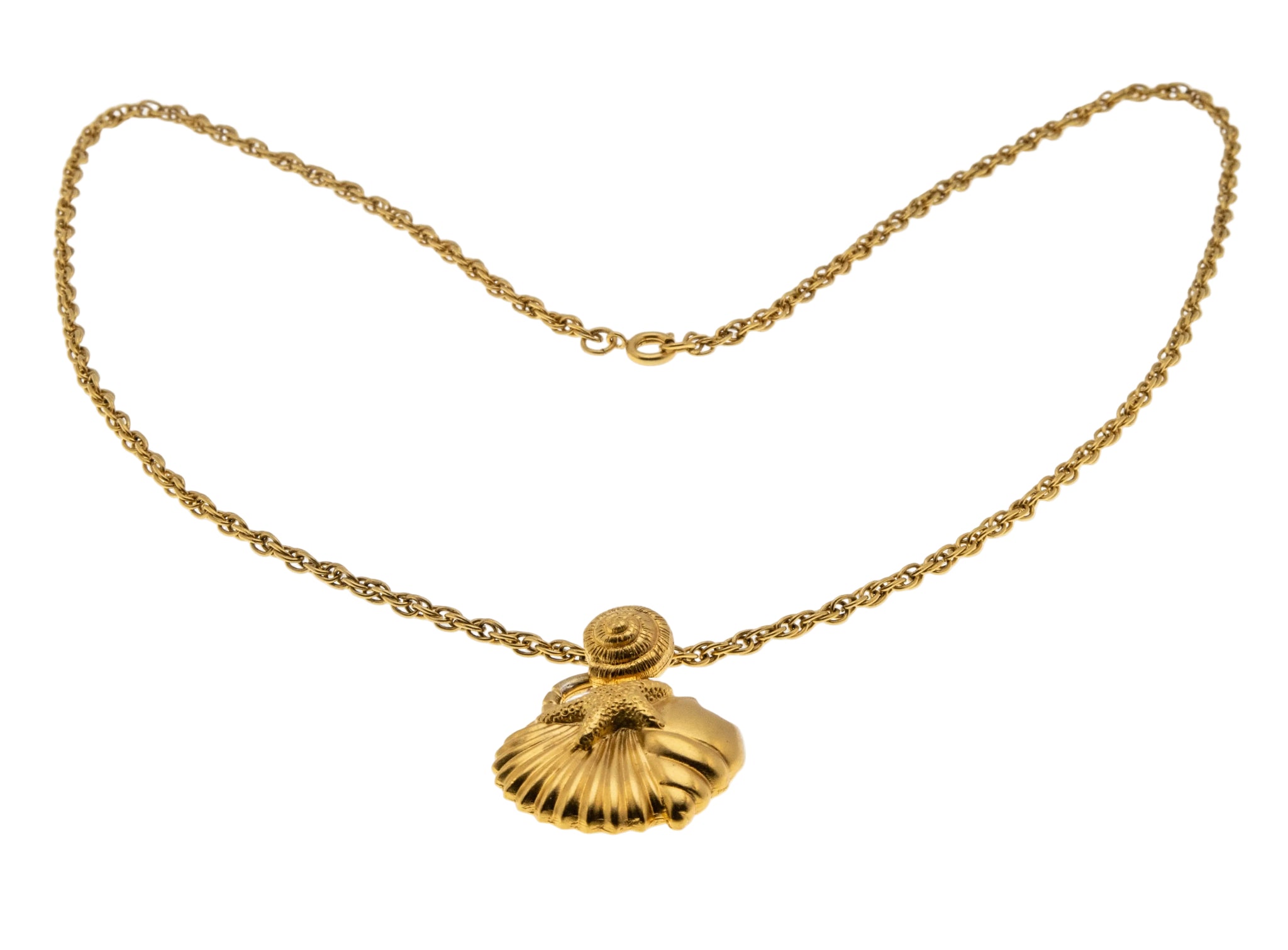 Seaside Days - Vintage Gold Plated 'Seashell & Starfish' Pendant & Chain. This unique pendant and chain is crafted from gold plate over metal. The pendant features vintage styling, and quality craftsmanship. This pendant is comprised of a wonderful dimensional design, which exhibit seashells and a starfish in a beautiful rich gold finish. Even the bale displays a charming seashell, which adds detail and character to the piece. The chain is original to the piece, designed as a substantial rope chain, featuring a spring ring clasp in perfect working order. This gorgeous vintage pendant would make a great addition to any vintage jewelry collection.