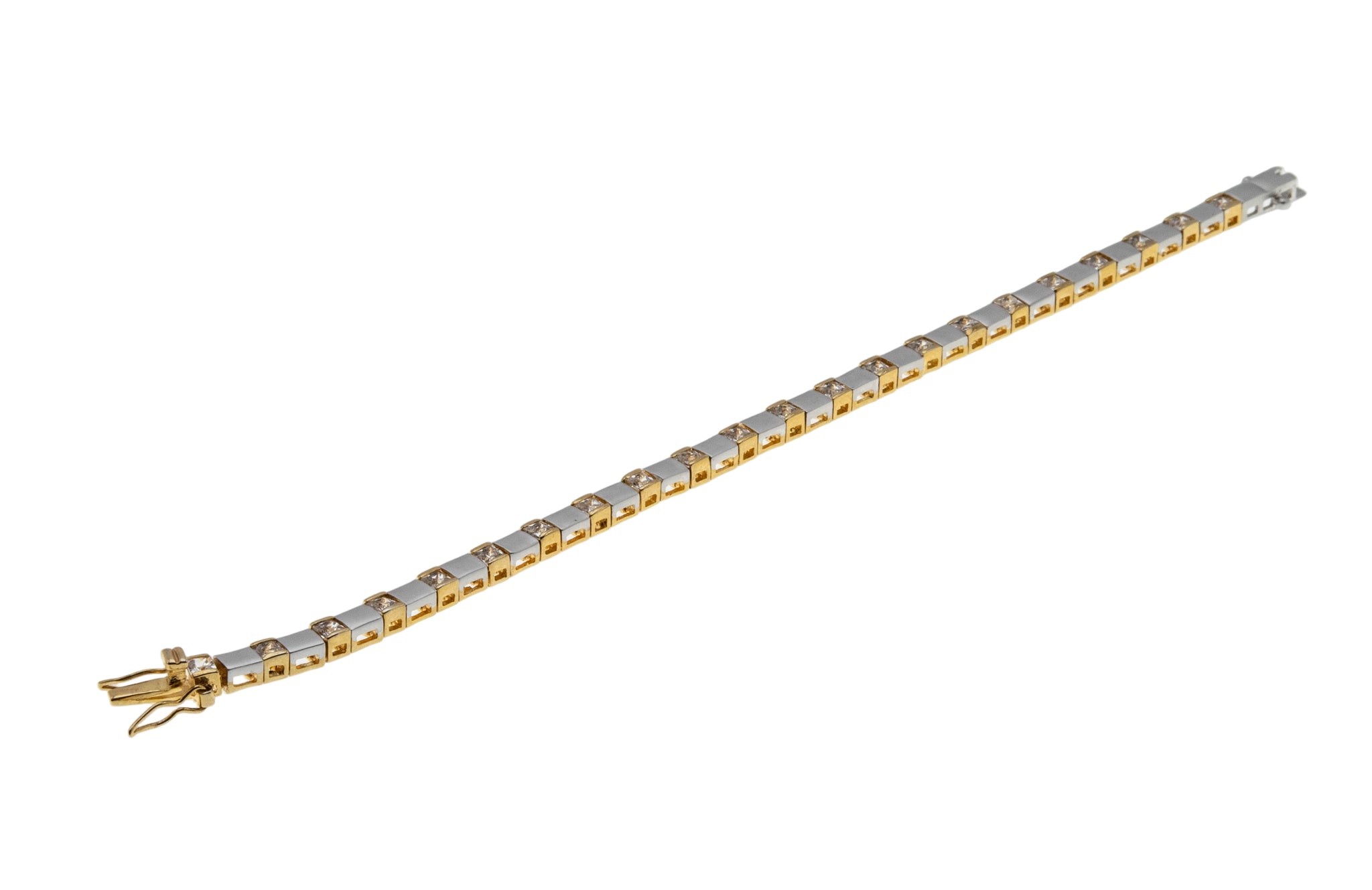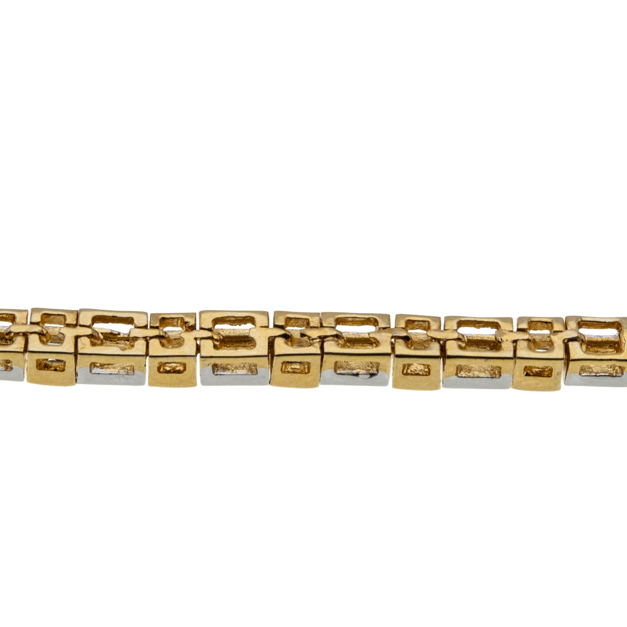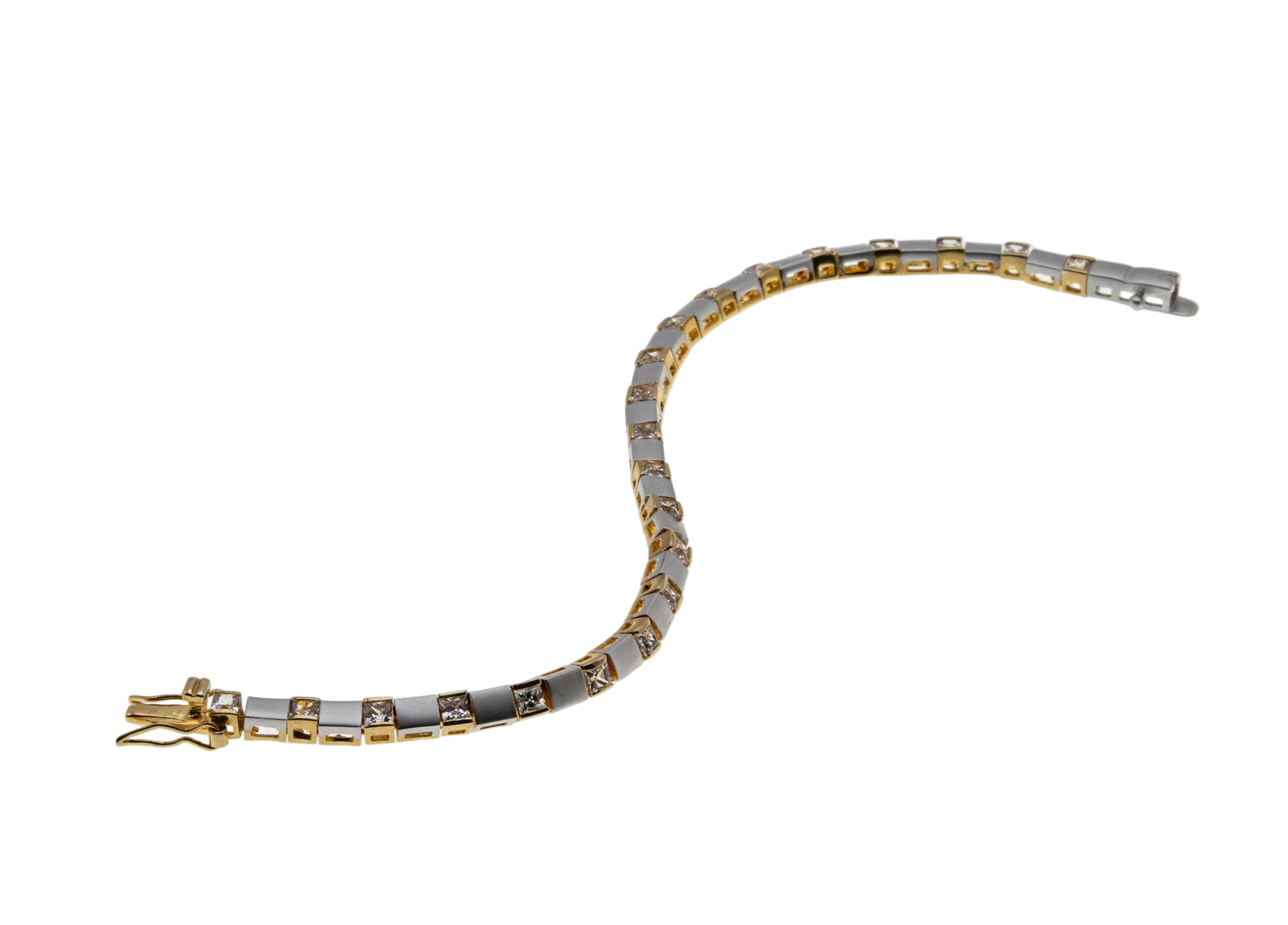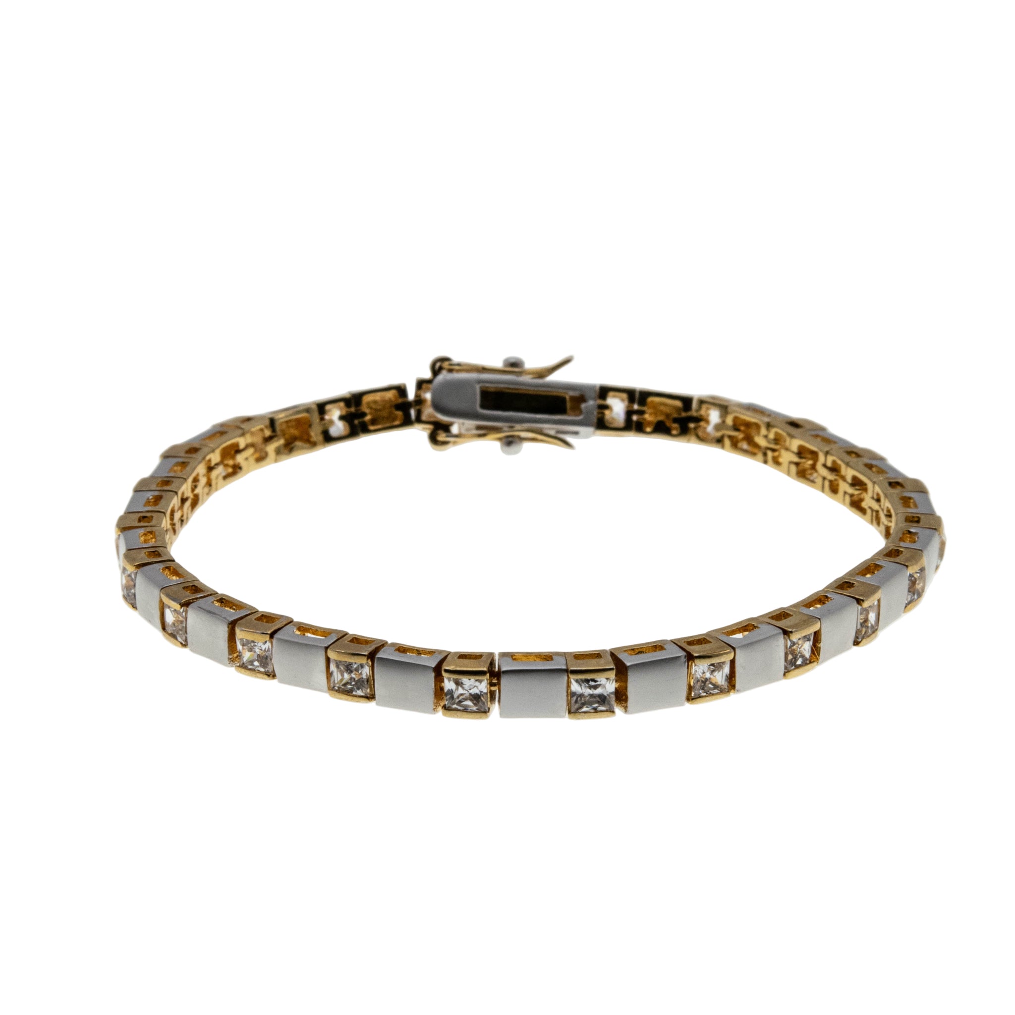 Sleek Sparkler - Vintage Yellow & White Gold Plated Cubic Zirconia Tennis Bracelet. This sleek bracelet is crafted from yellow and white gold plate. The bracelet features 22 radiant square cut cubic zirconia gemstones, classic vintage era styling, and quality craftsmanship. This bracelet is comprised of expertly channel-set sparking clear cubic zirconia gems, which are interspaced by white gold segments, displaying a lovely satin finish. Whilst the remainder of the bracelet exhibits a beautiful yellow gold plated polished finish. The two toned yellow and white gold finish have a lovely contrasting effect, and also allows the bracelet to be worn effortlessly with white gold or yellow gold jewelry. The bracelet features a slide lock, and two addition safety hooks, which are in perfect working order. This vintage bracelet looks great on its own or stacked with other bracelets.