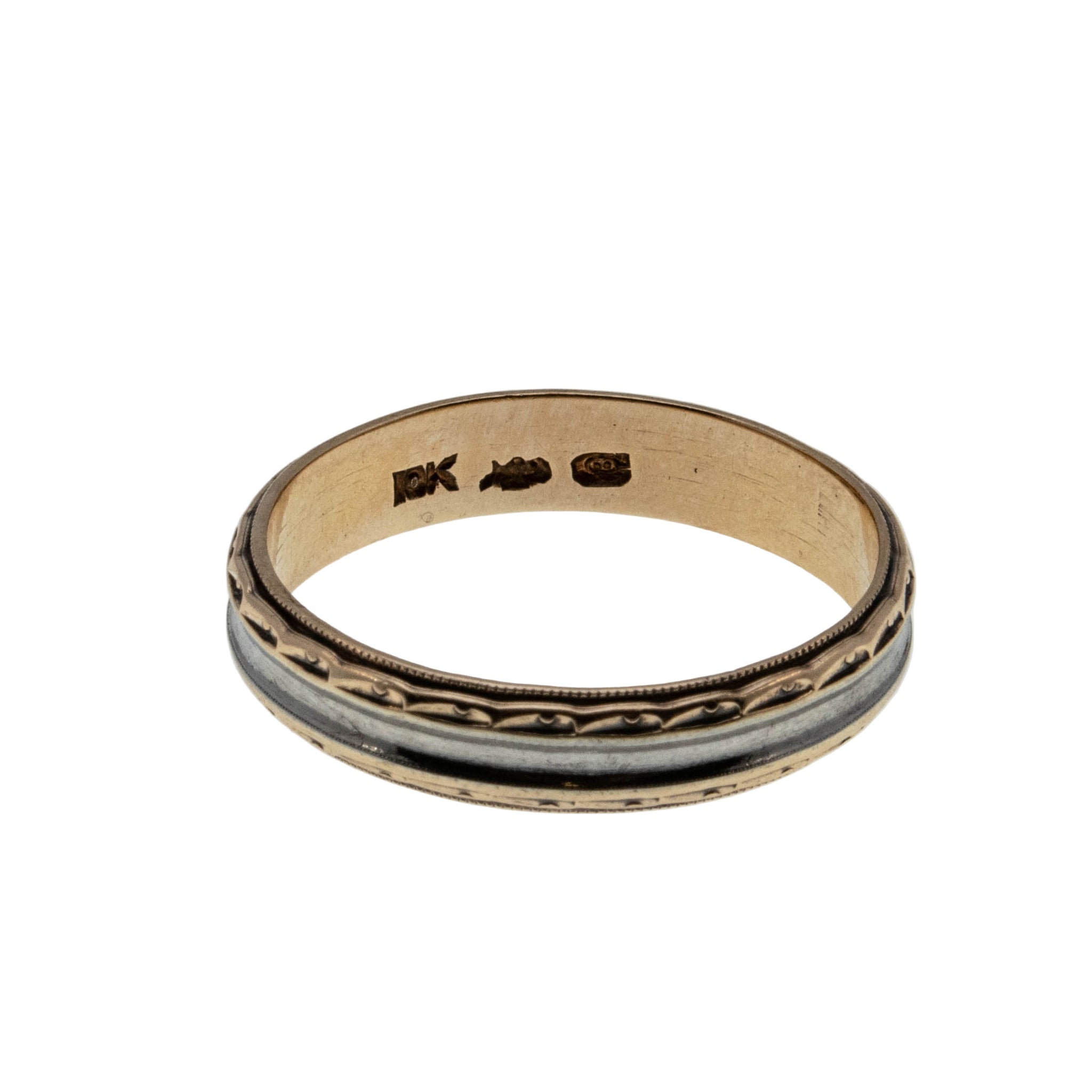 From This Day Forward - Vintage 10K Yellow & White Gold Engraved Milgrain Wedding Band Ring. This wonderful ring is crafted from 10K yellow and white gold, hallmarked 10K, and a makers mark inside the band. This ring features a vintage classic design, and quality craftsmanship. This ring is comprised of two-tone gold, featuring a unique engraved pattern (which is a characteristic seen on antique and vintage rings), and an exquisite milgrain decorated border. The ring is substantial and solid for daily wear. The wedding ring has a beautiful buttery gold, and silvery white gold colour, which is polished and smooth on the inside of the band, this allows for a comfortable fit. This Vintage wedding band ring is unique and classic, showcasing a variety of gold-work techniques and decoration...truly a ring to be cherished and enjoyed for many years to come.