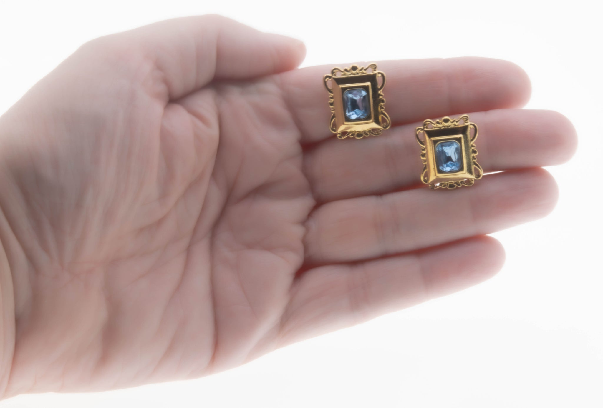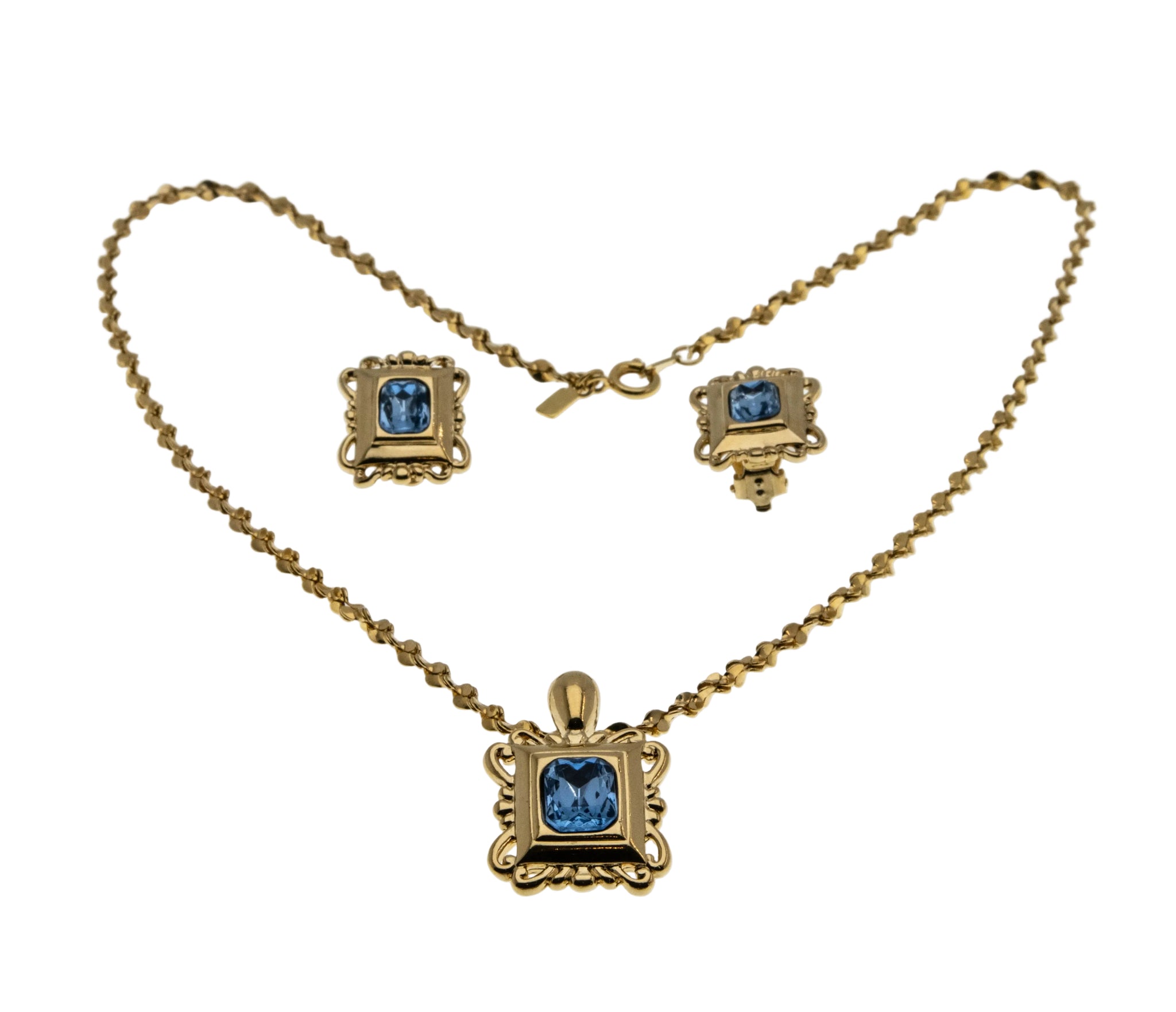 Retro - Vintage Gold Plated Crystal Rhinestone Pendant & Clip-On Earring Set. This wonderful set is crafted from gold plate over metal. The set features 3 rectangular cut crystal rhinestones, vintage retro era styling, and quality craftsmanship. This gorgeous set is comprised of beautiful sky blue crystal rhinestones surrounded by a beautiful ornate frame of gold. The pendant has a clip-on style bale, which allows the piece to be worn as an enhancer. The chain is a substantial twisted serpentine design, featuring a spring ring clasp, which is in perfect working order. The earrings are a clip-on design for pierced or non pierced ears. This retro vintage era set looks stunning when worn, truly a great addition to any vintage jewelry collection.