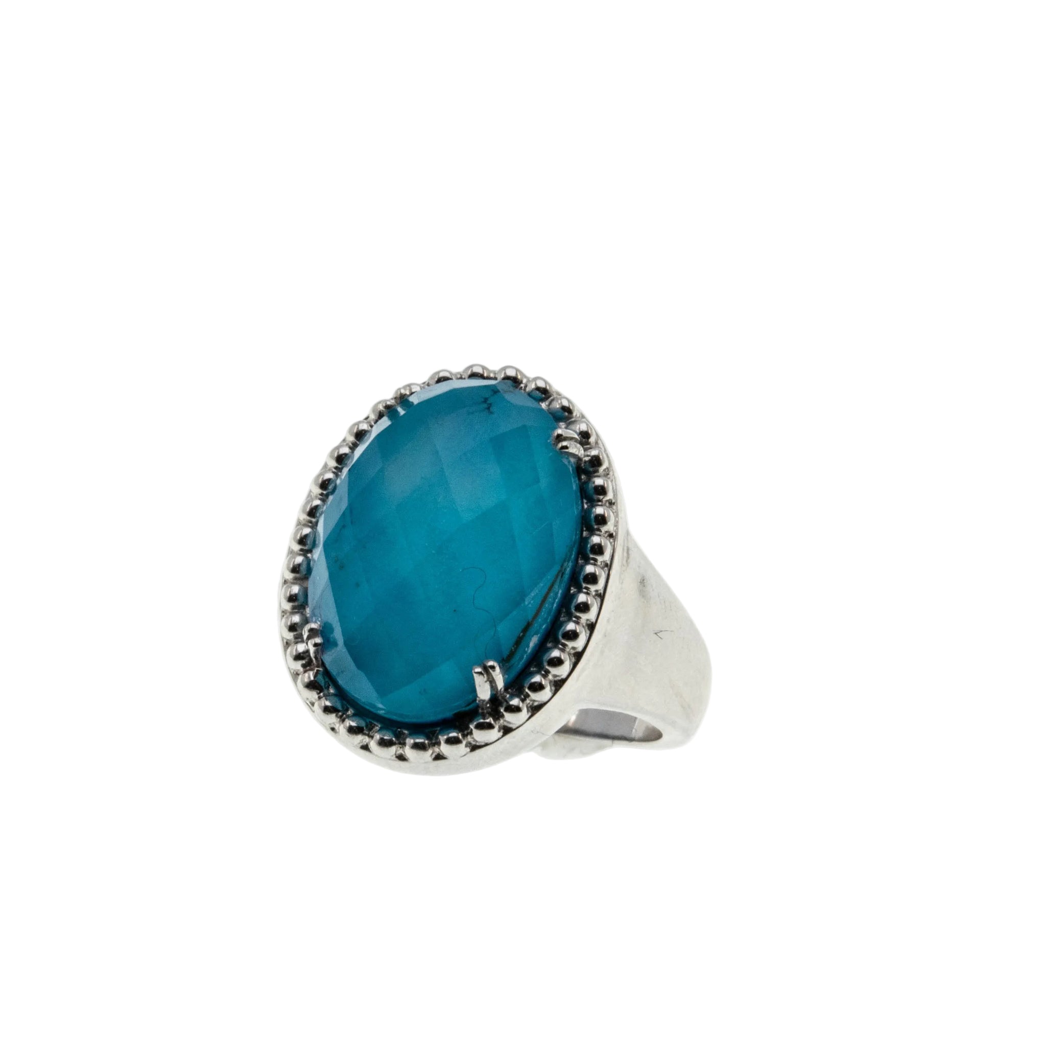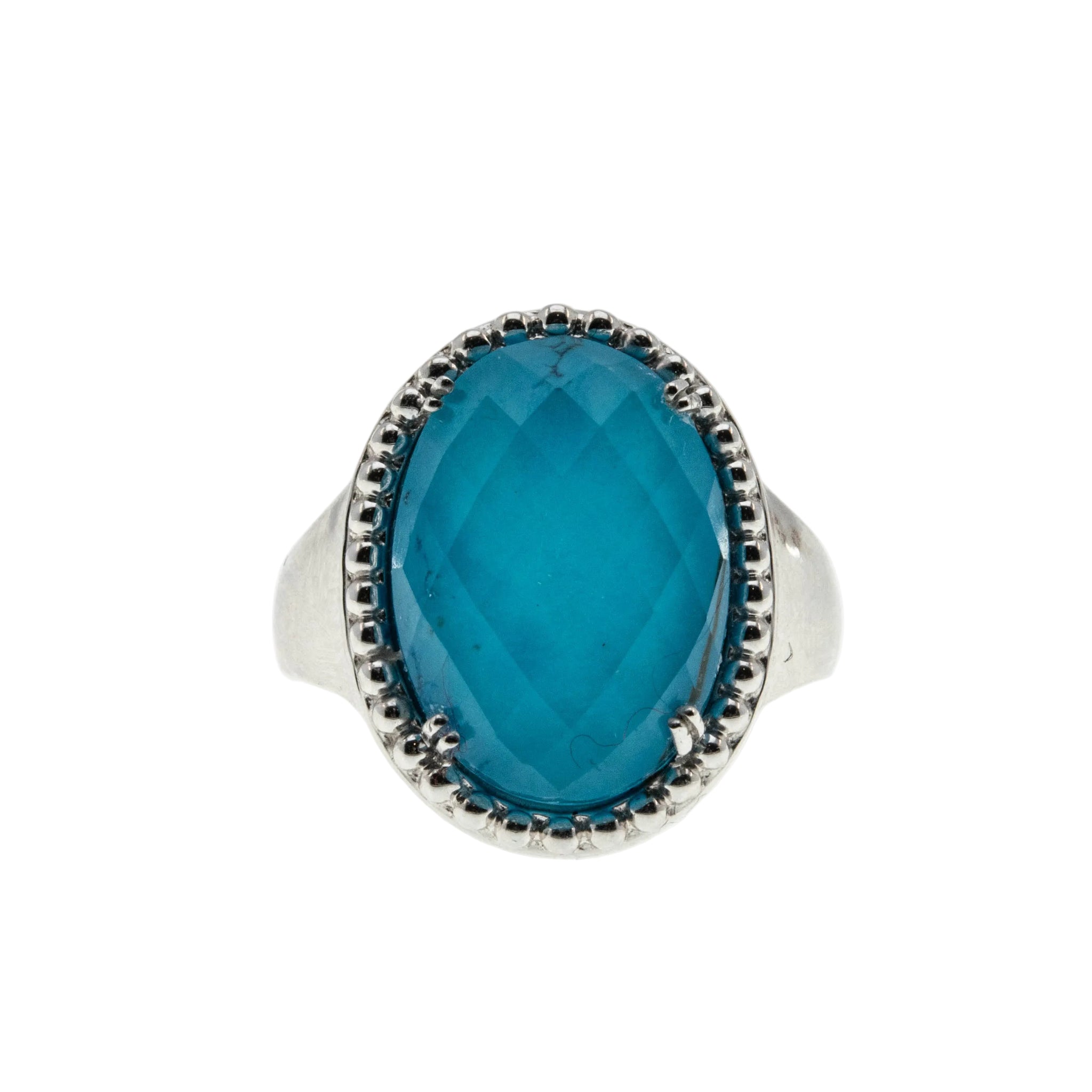 Turquoise Blue - Vintage Sterling Silver Natural Quartz Solitaire Ring.  This gorgeous ring is crafted from sterling silver, hallmarked 925 for sterling silver. The ring features one oval cut faceted natural quartz gemstone, vintage modernistic styling, and quality craftsmanship. This wonderful ring is expertly double claw-set with a beautiful turquoise coloured quartz, which is surrounded by a decorative bezel. The ring has tapered shoulders, which lead down to a polished and smooth shank. This allows for a comfortable fit, and easy sizing. This vintage era ring would is in remarkable condition, and looks stunning when worn.