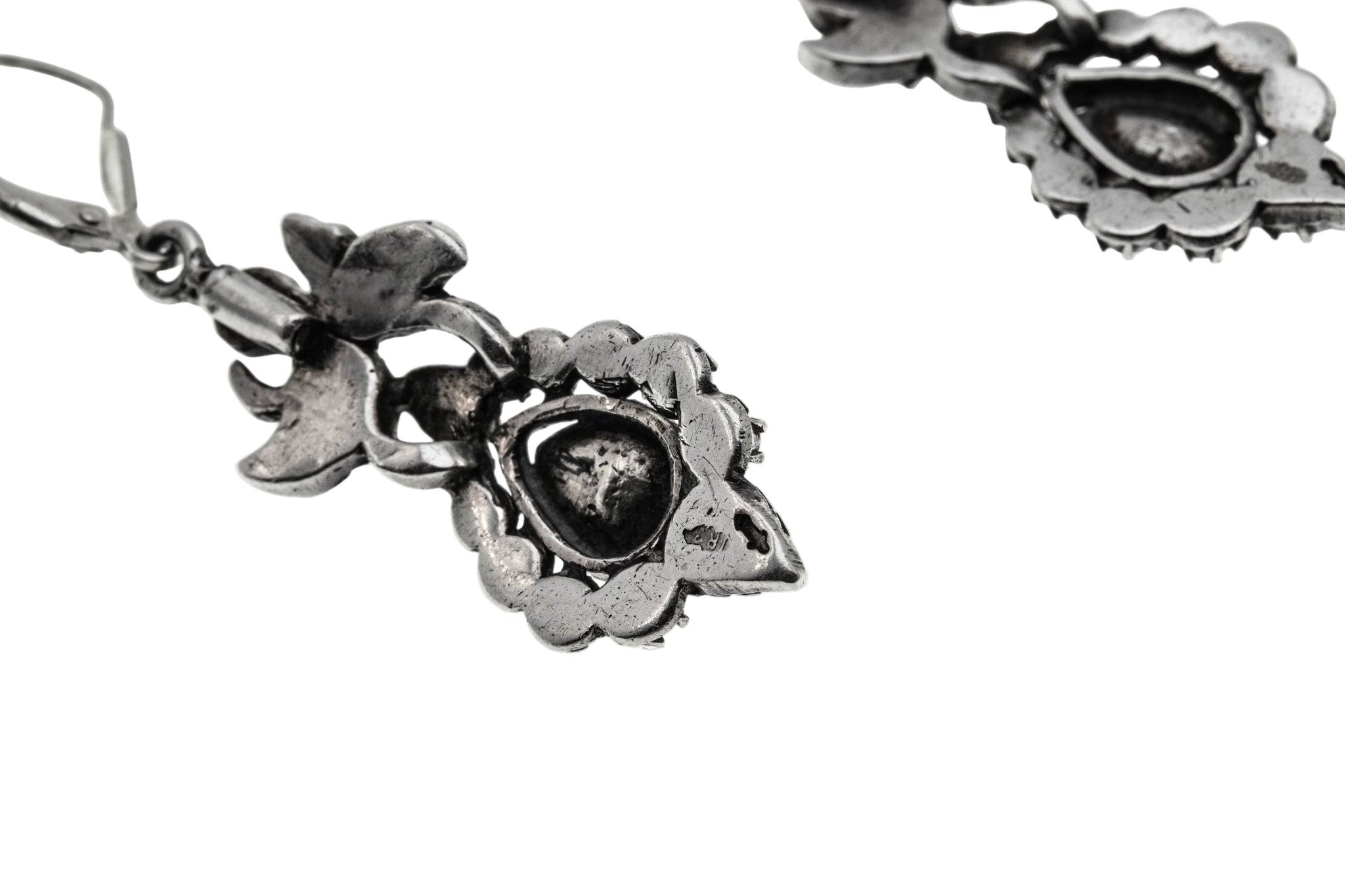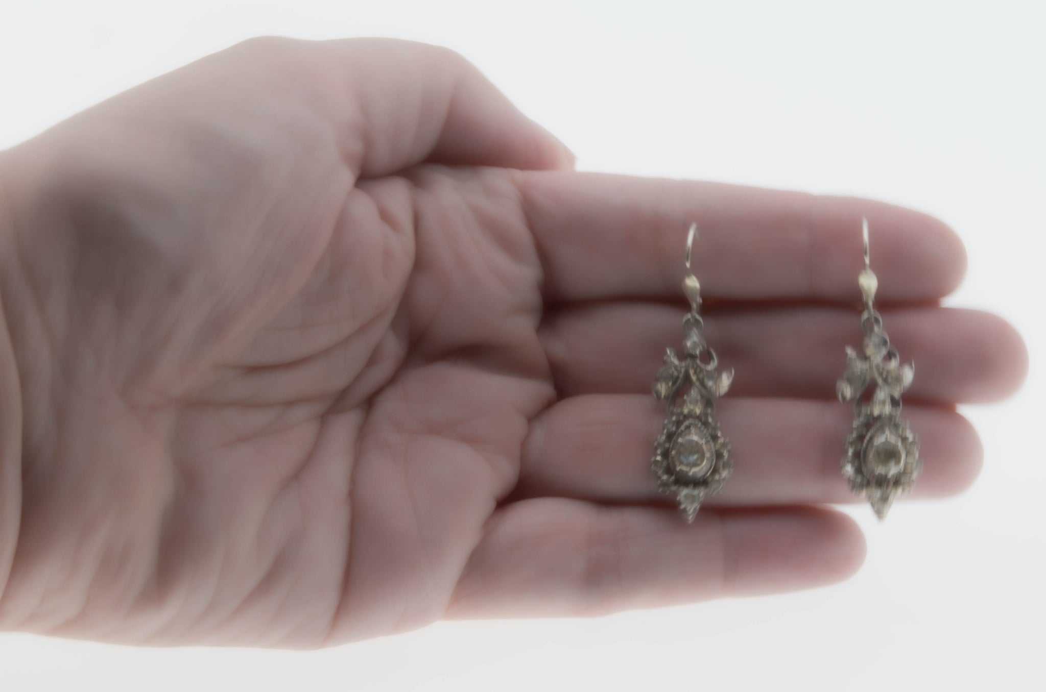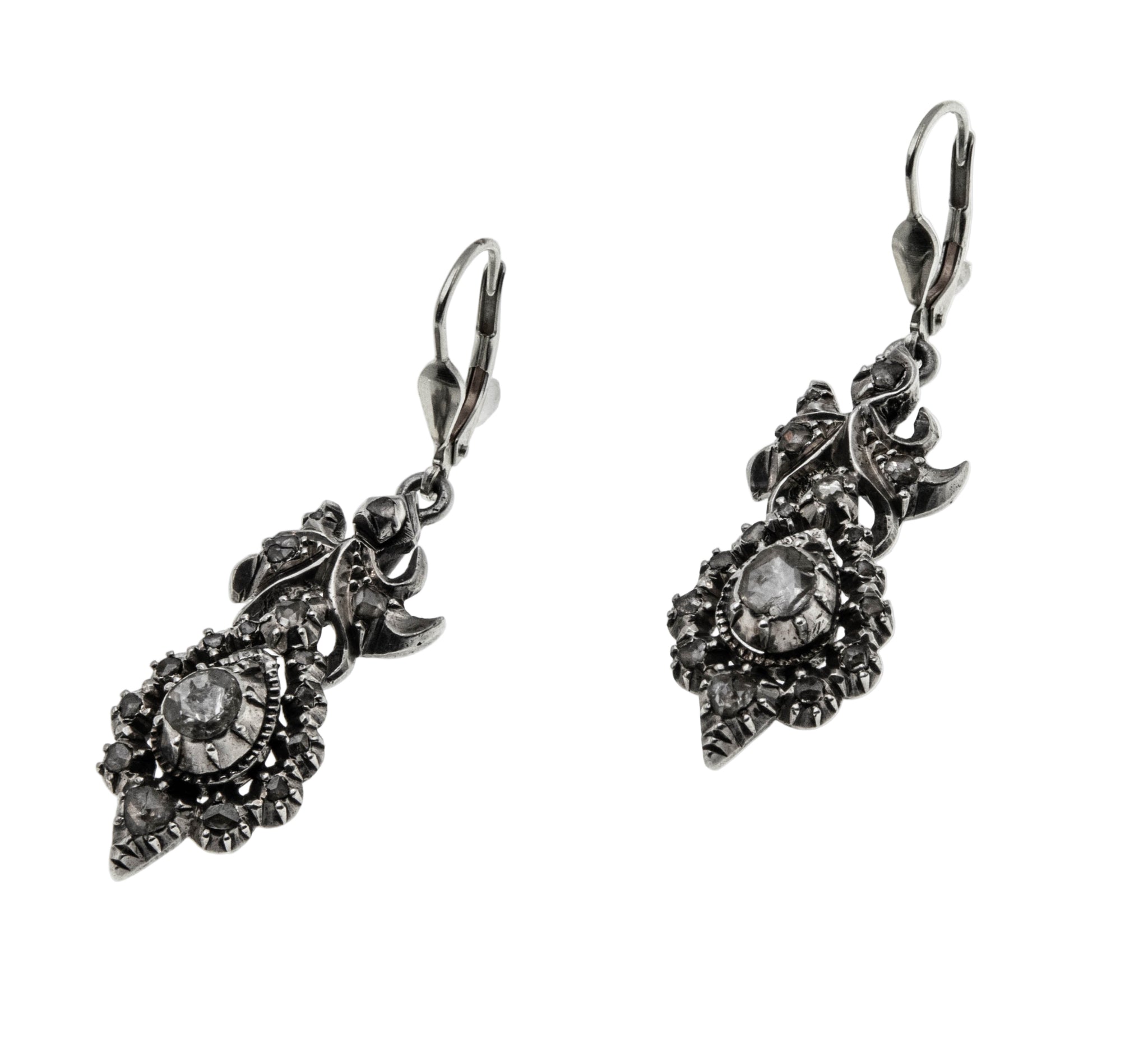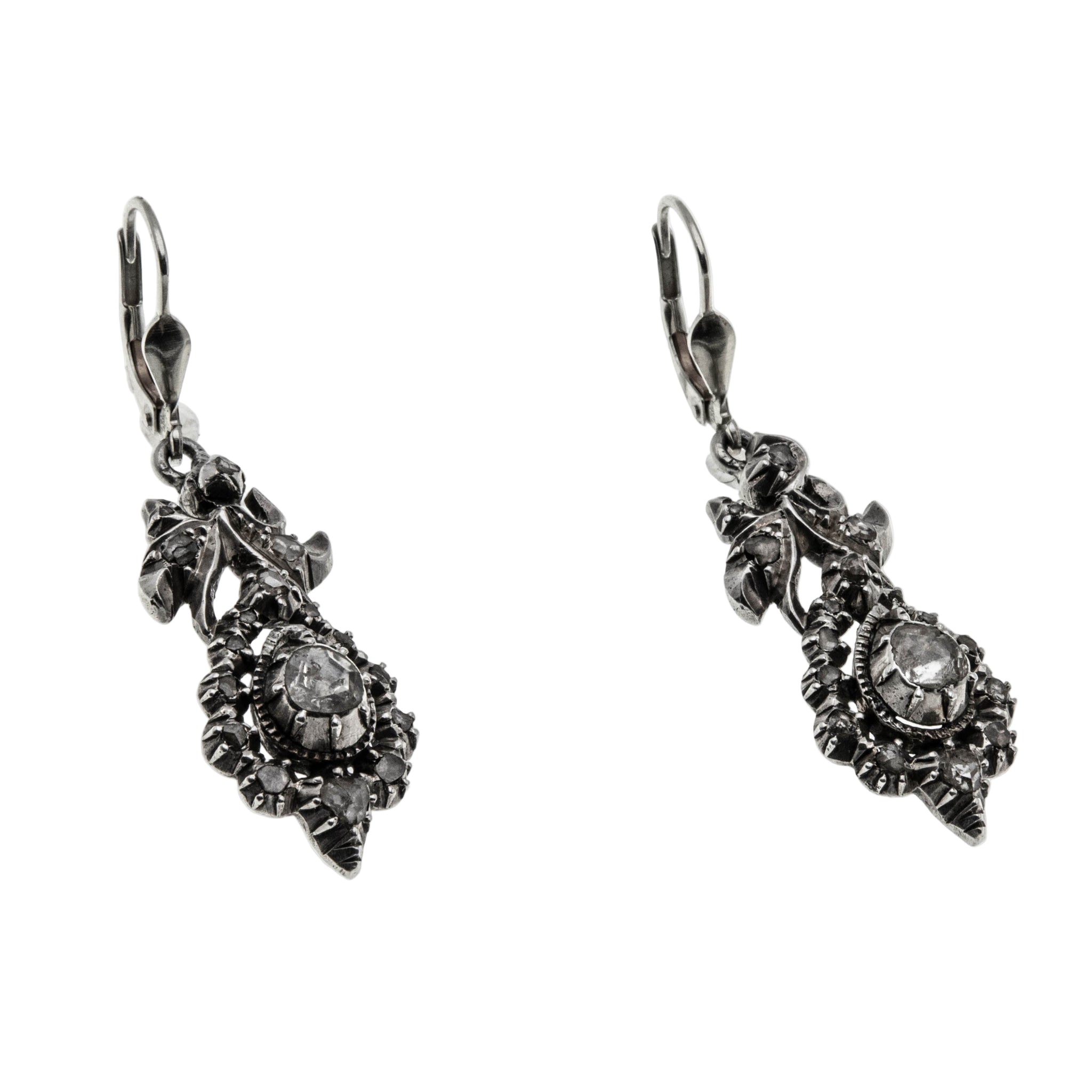 Age Of Elegance - Georgian 18th/19th Sterling Silver Natural Rose Cut Diamond Dangly Earrings. These exquisite earrings are hand-crafted from sterling silver, tested and a makers mark. Featuring 18 natural rose cut diamonds, Georgian era styling and high quality craftsmanship. These earrings are completely handmade, and are articulated beautifully. The earrings simulate a floral motif, and are adorned by glowing rose-cut diamonds. The surmounts are secure French lever-backs, for pierced ears, which are in perfect working order. These Georgian era beauties are in exception condition, and look stunning when worn. Truly antique beauties to be cherished for many years to come.