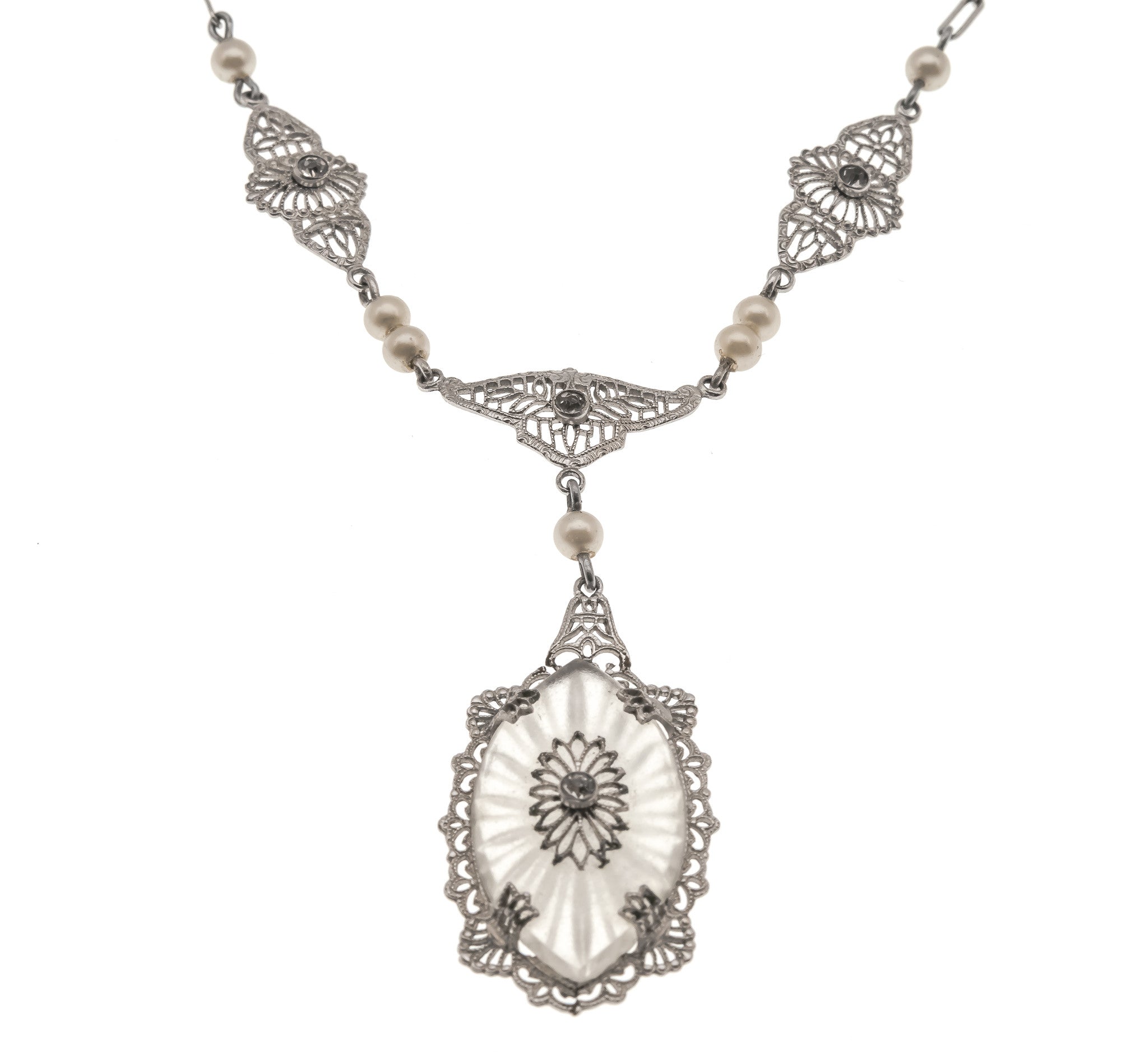 Art Deco silver camphor glass necklace. This beautiful necklace is crafted from silver metal , rhodium plate , pearl and paste gems. Featuring exquisite filigree silver-work, beautiful etched camphor glass with expertly bezel set clear paste stones. The pearls are creamy white with amazing lustre. Simulated pearls of this era are very high quality as compared with the pearls of today. The chain has a fancy link, and the clasp is decorative , and in perfect working order, both are original to the necklace. This Art Deco treasure is delicate and feminine, truly an heirloom piece for any bride that can be worn the special day off and enjoyed for many years to come.
