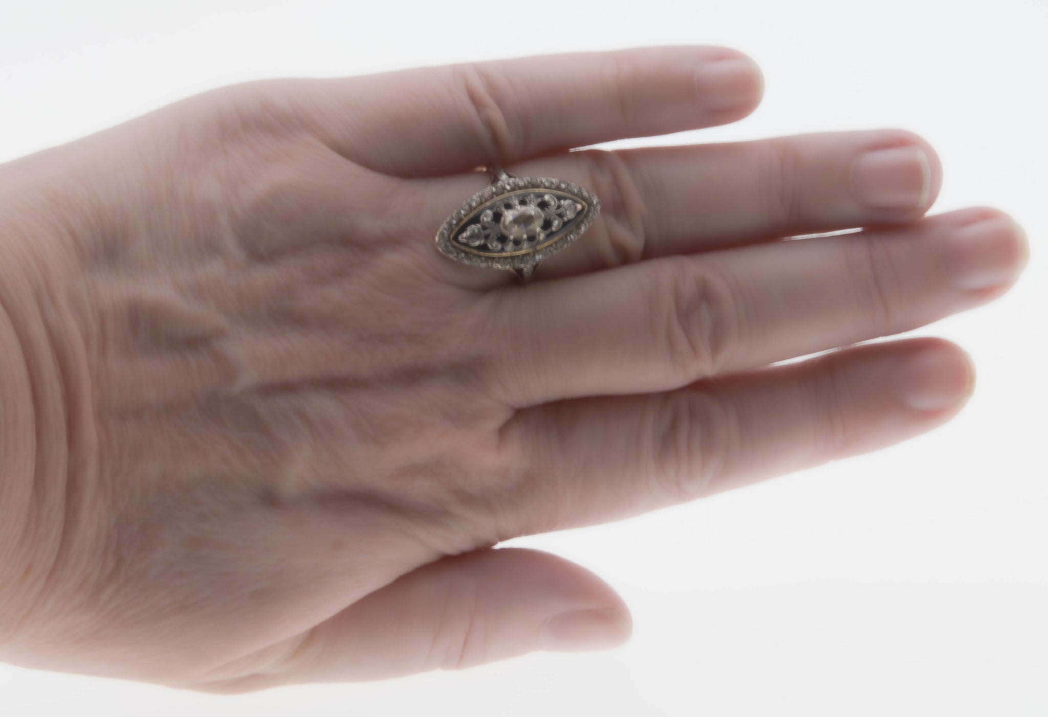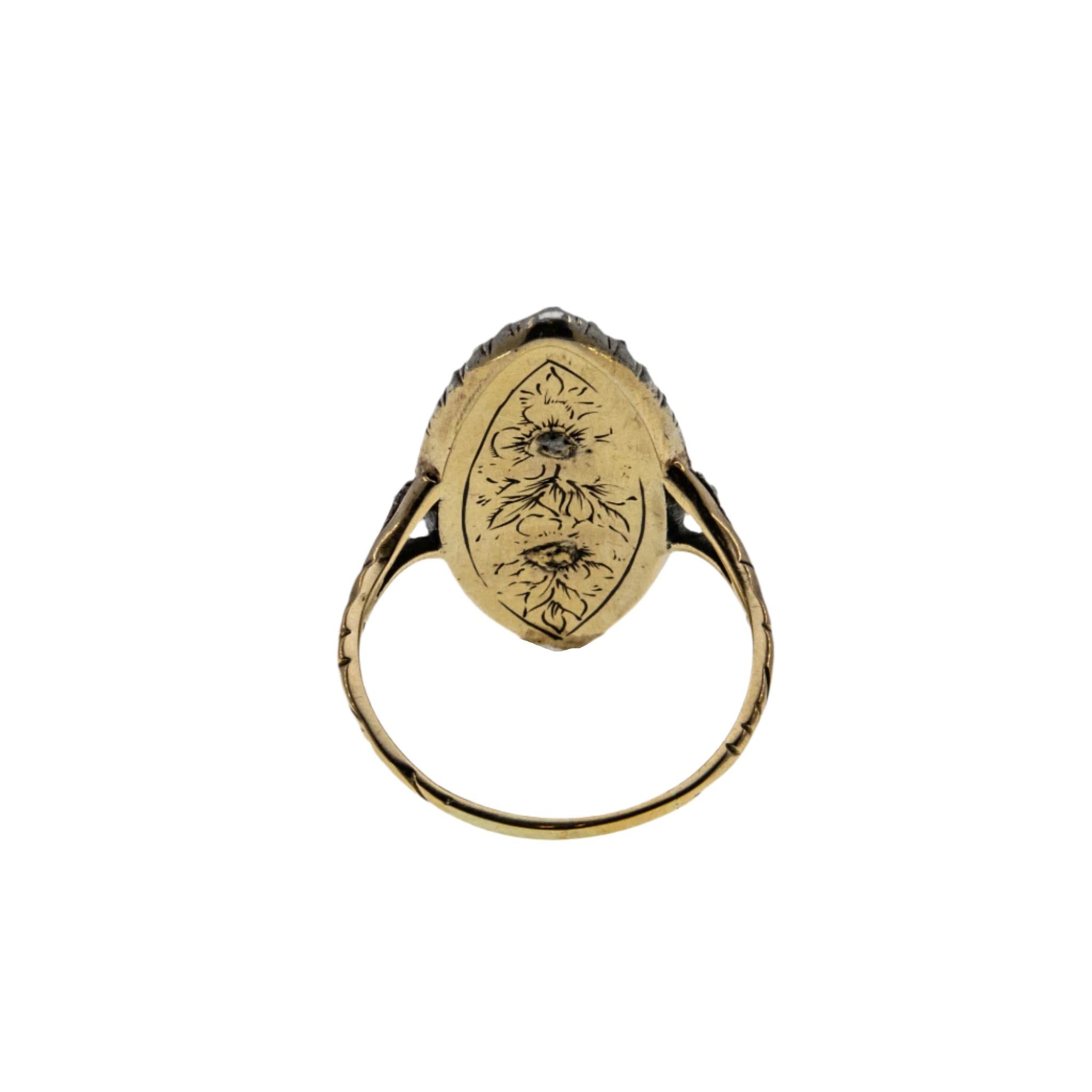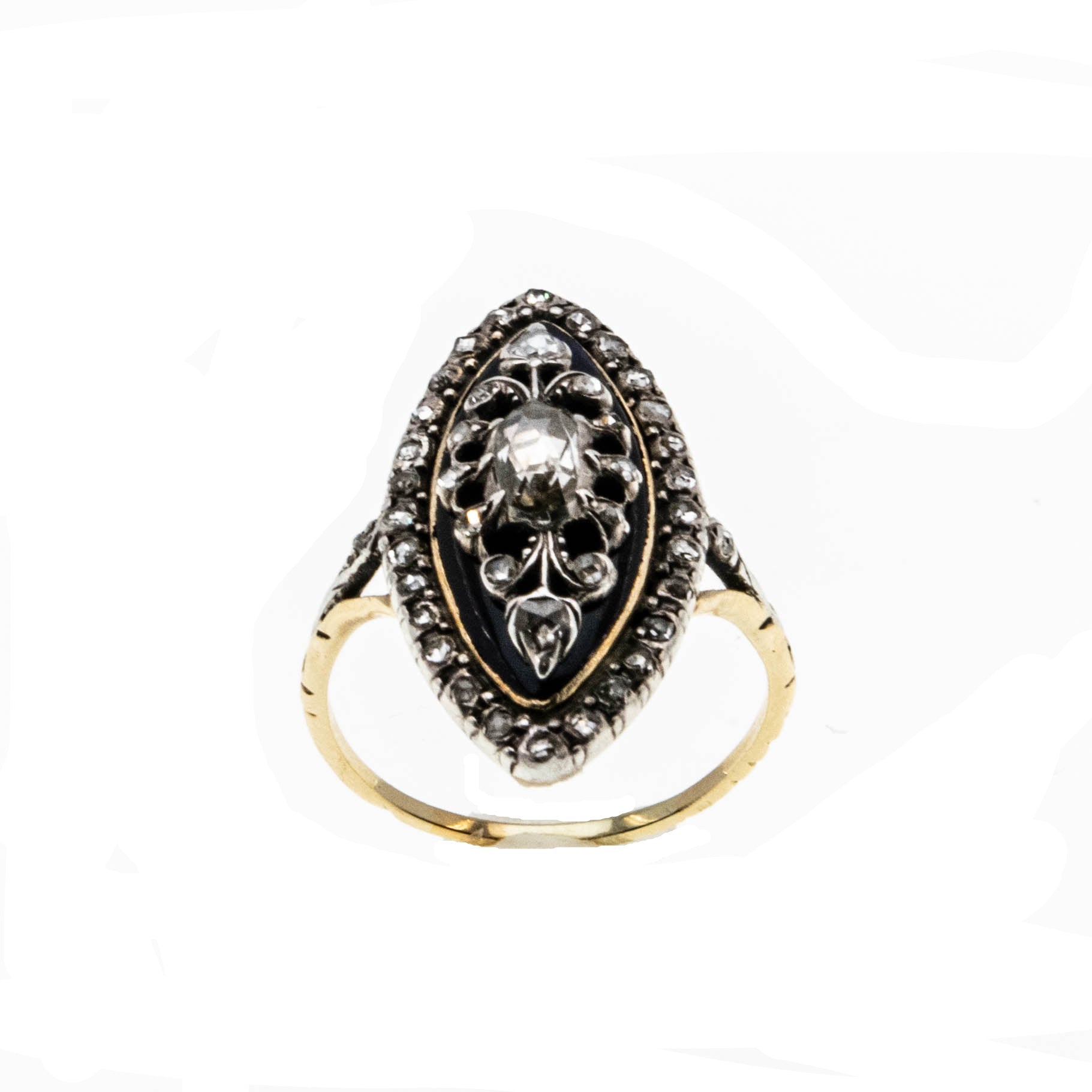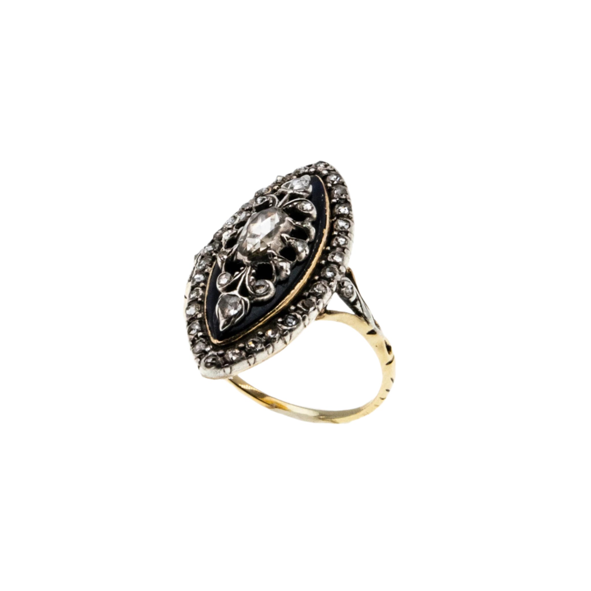 Bague Au Firmament - Georgian French 14K Gold & Sterling Silver Rose Cut Diamond Cobalt Blue Enamel 'Night Sky' Navette Ring. This exquisite ring is crafted from 14K gold, and sterling silver, tested. The ring features one natural oval rose cut diamond, 40 natural round rose cut diamonds, Georgian era detail, and high quality craftsmanship. This stunning ring is created in the form of a 'navette' or 'marquise' shape, which is inlayed by cobalt blue enamel (glass) , and adorned by glowing antique cut diamonds designed in a floral motif. The reverse side to the gallery is engraved by exquisite floral engravings. The shoulders of the ring exhibit a split-design, which is beautifully carved midway, and leads down to a smooth and polished shank. This allows for a comfortable fit, and easy sizing. This precious rare Georgian era ring would make an amazing addition to any fine antique jewelry collection.