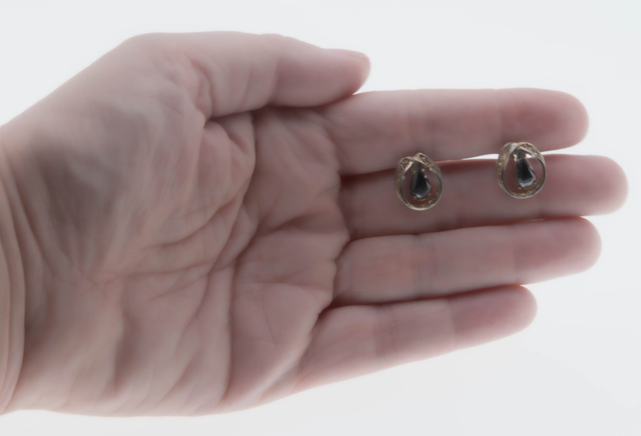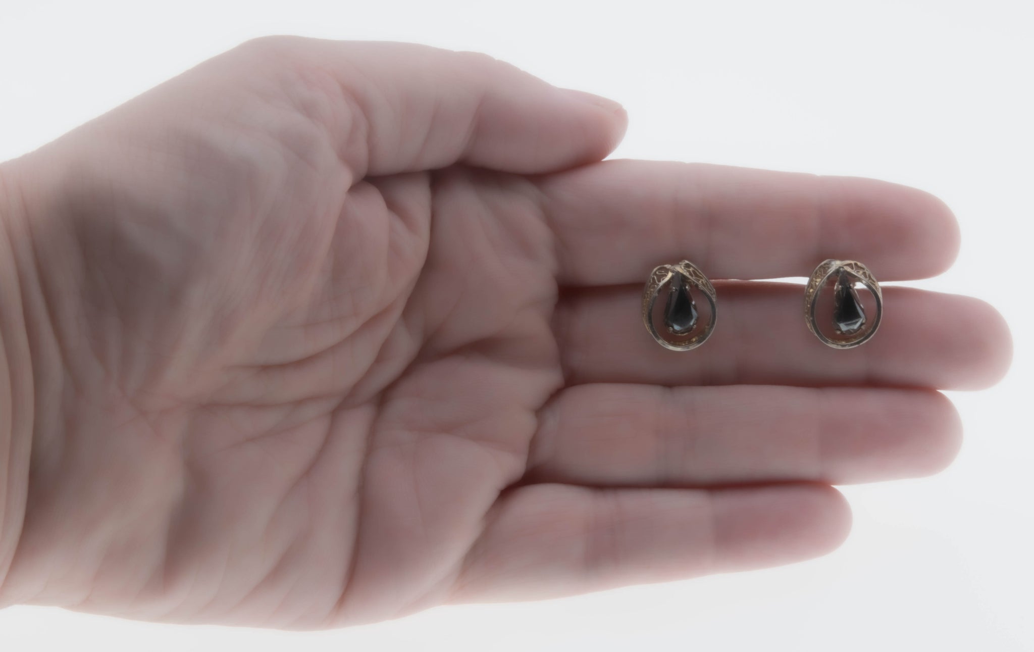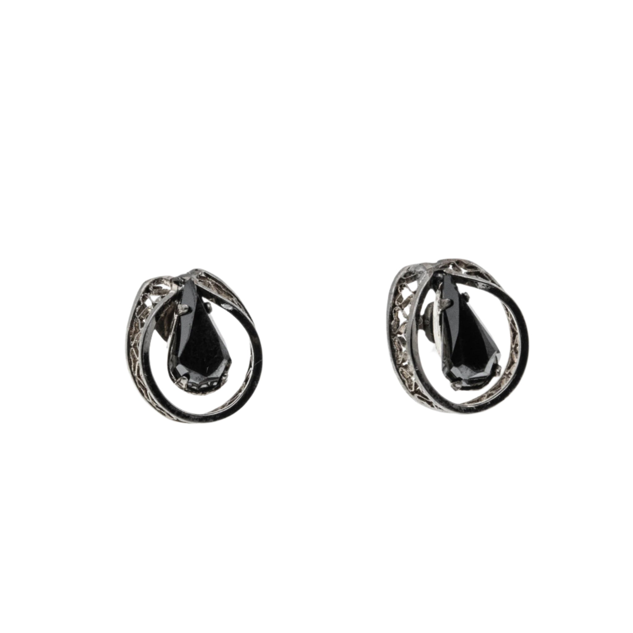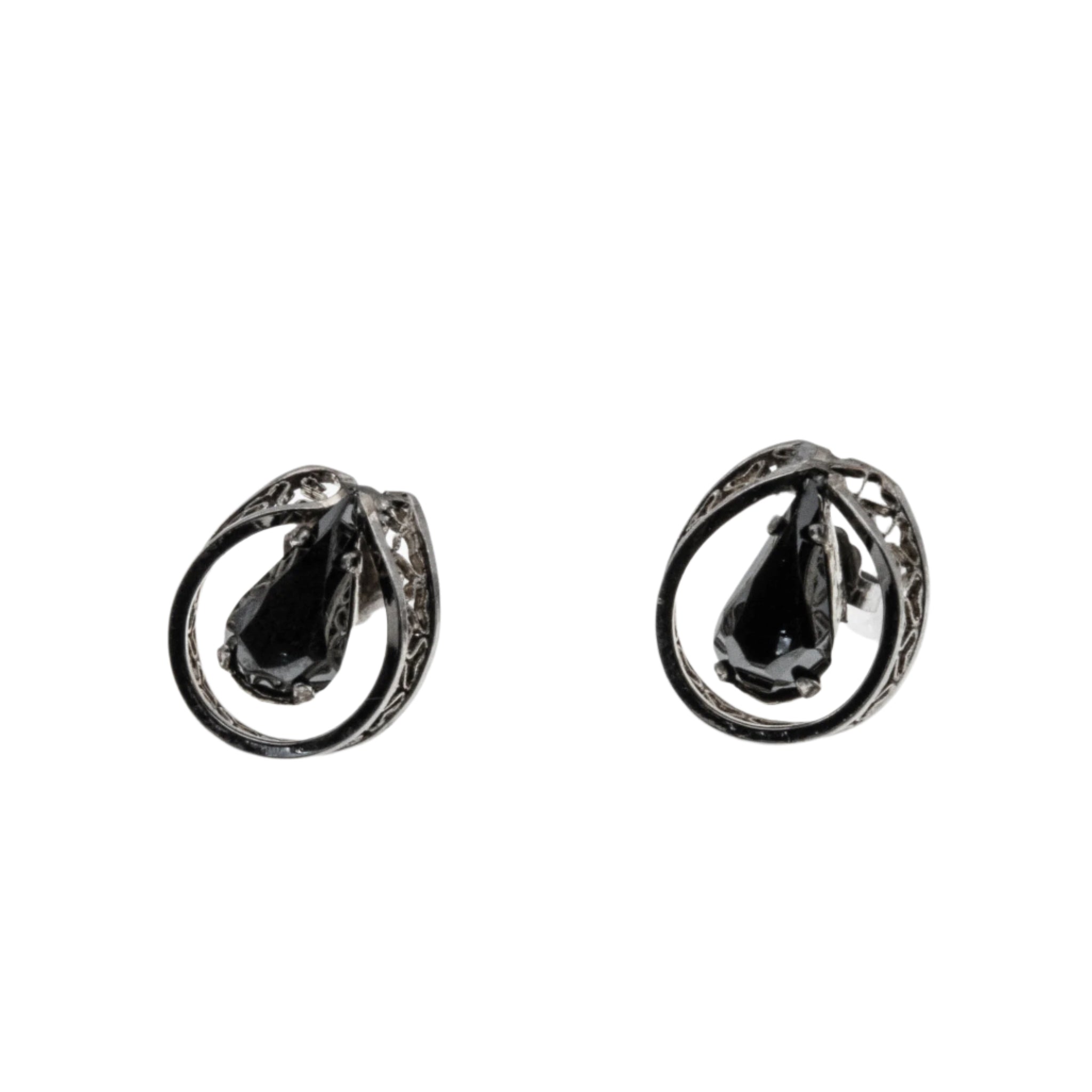 Diamonds & Lace - Vintage 'Titan' Sterling Silver Natural Black Alaskan Diamond Earrings. These pretty earrings are crafted from sterling silver, tested, and made by the company Titan. The earrings feature two natural tear drop shaped black Alaskan gemstones (Hematite), vintage styling, and quality craftsmanship. The galleries on these earrings showcase genuine charcoal grey Black Alaskan Diamond gemstones, which are expertly claw-set amongst a sea of filigree in the form of a tear drop. The earrings are for pierced ears, featuring posts, and secure butterfly backs. These vintage earrings are a wonderful versatile piece for daily wear.