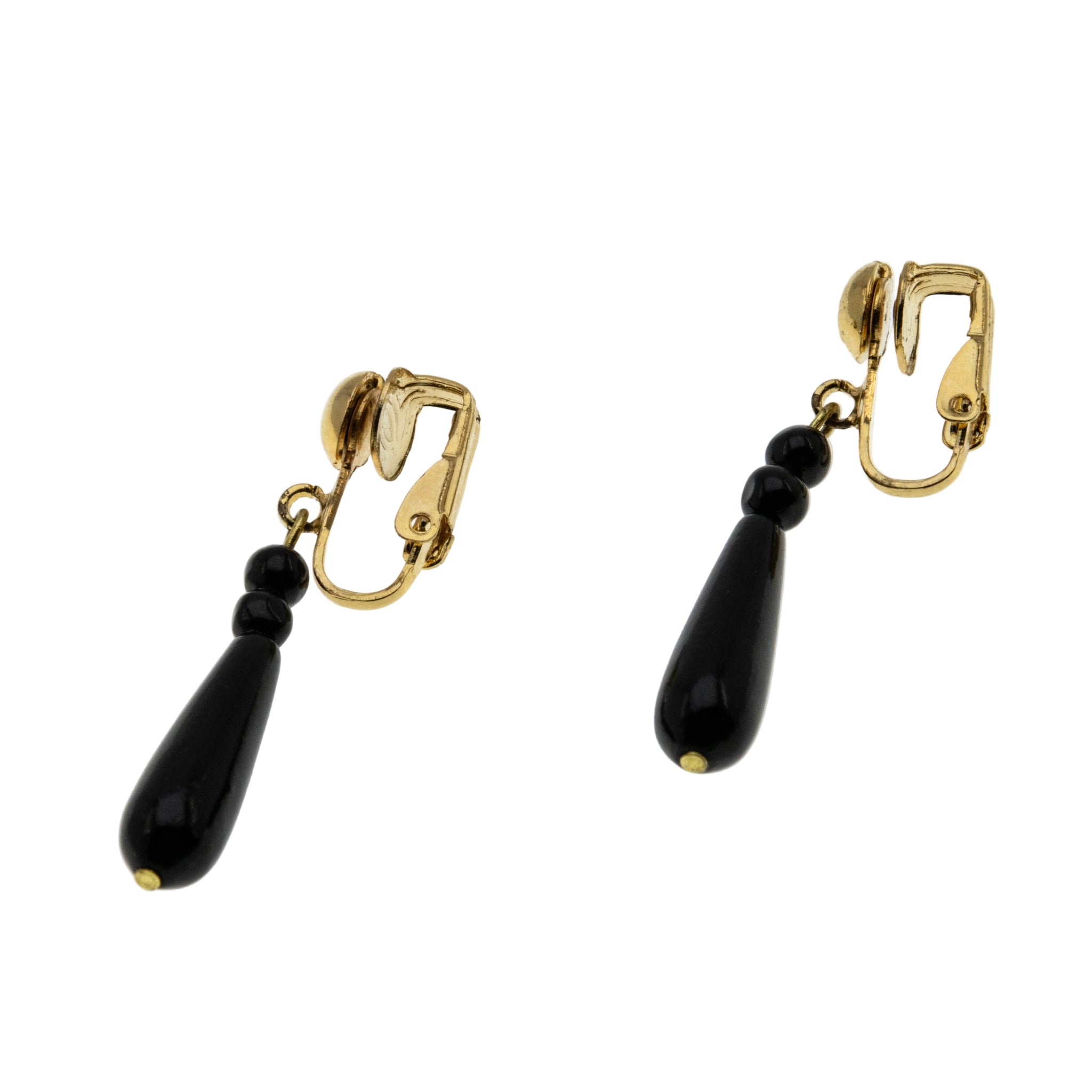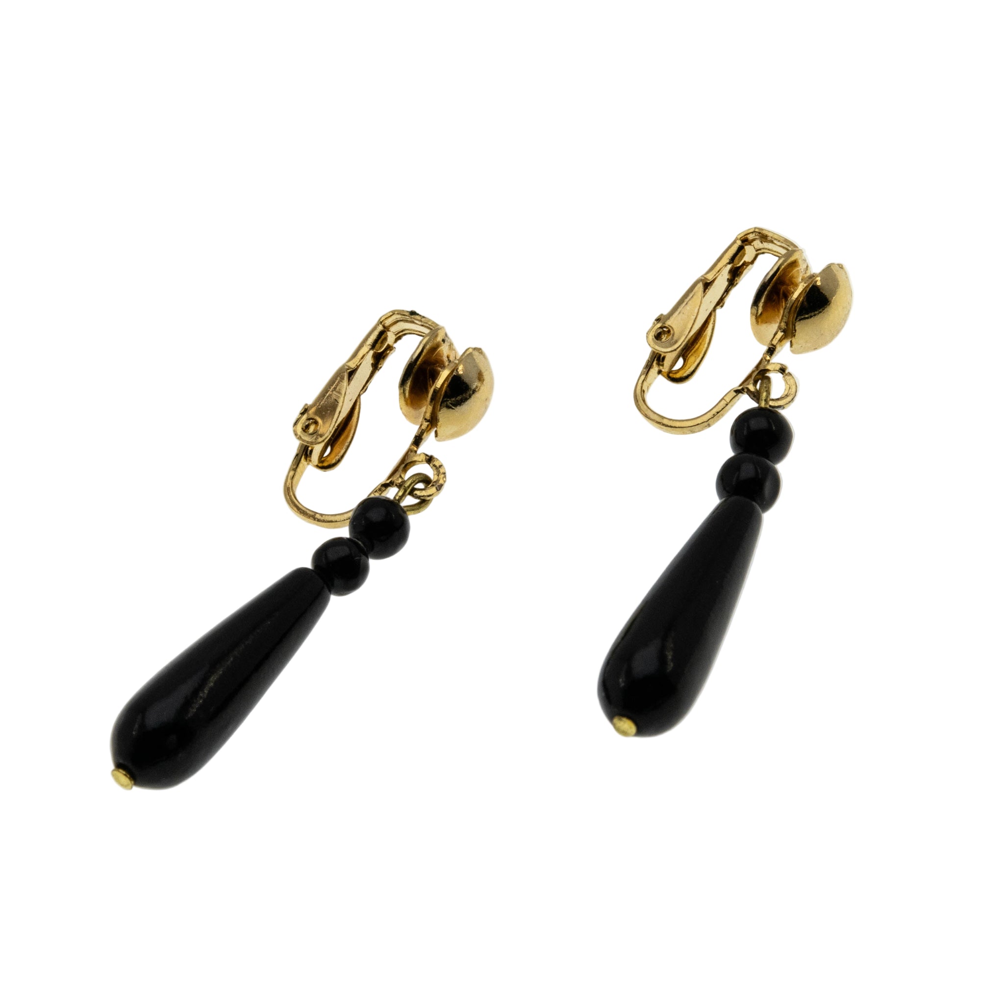 Black & Gold - Vintage Victorian Revival Gold Plated Black Glass Dangly Earrings. These elegant earrings are crafted from gold plate over metal. They feature 2 Torpedo shaped glass gems, 4 sphere shaped glass gems, Vintage Victorian Revival styling, and quality craftsmanship. These gorgeous earrings are comprised of gold coloured ball surmounts, which feature vintage clip-on backings, in perfect working order. Connected to the surmounts are black round beads, and a beautiful black elongated tear-drop (torpedo shaped) dangle. The earrings are articulated beautifully, which allows for nice movement and swing. These vintage earrings are in the Victorian style, and look elegant and classy when worn.
