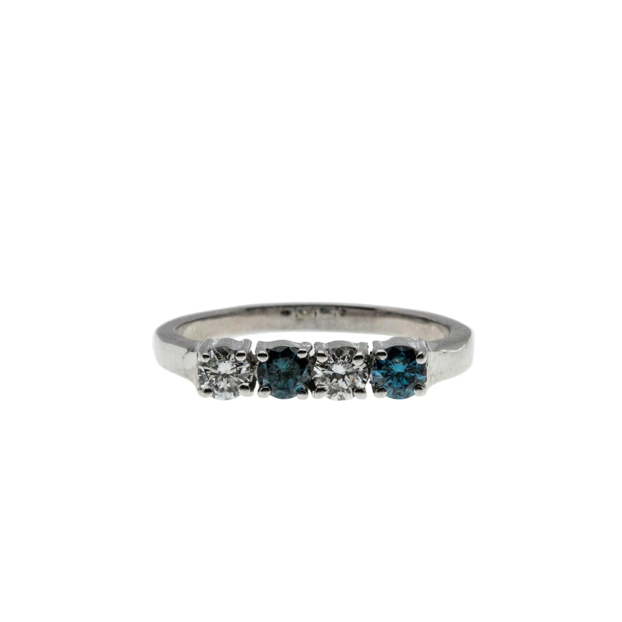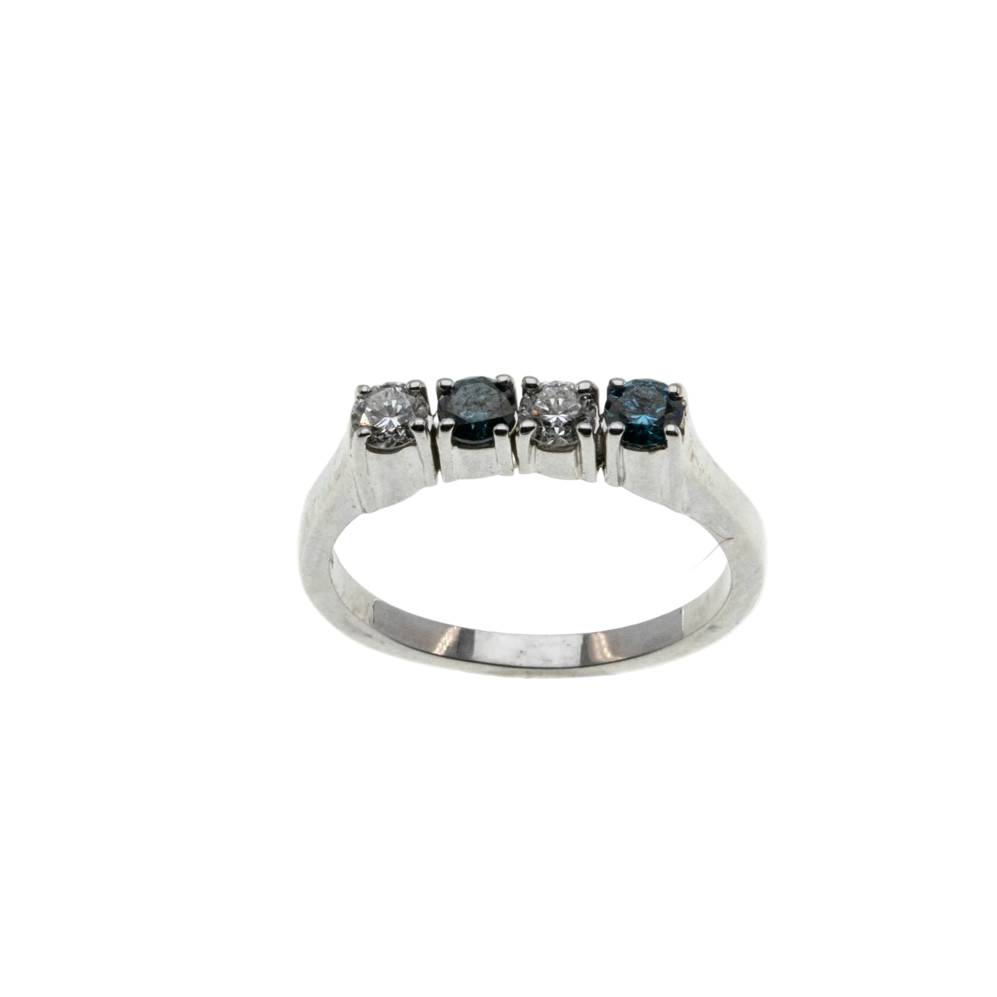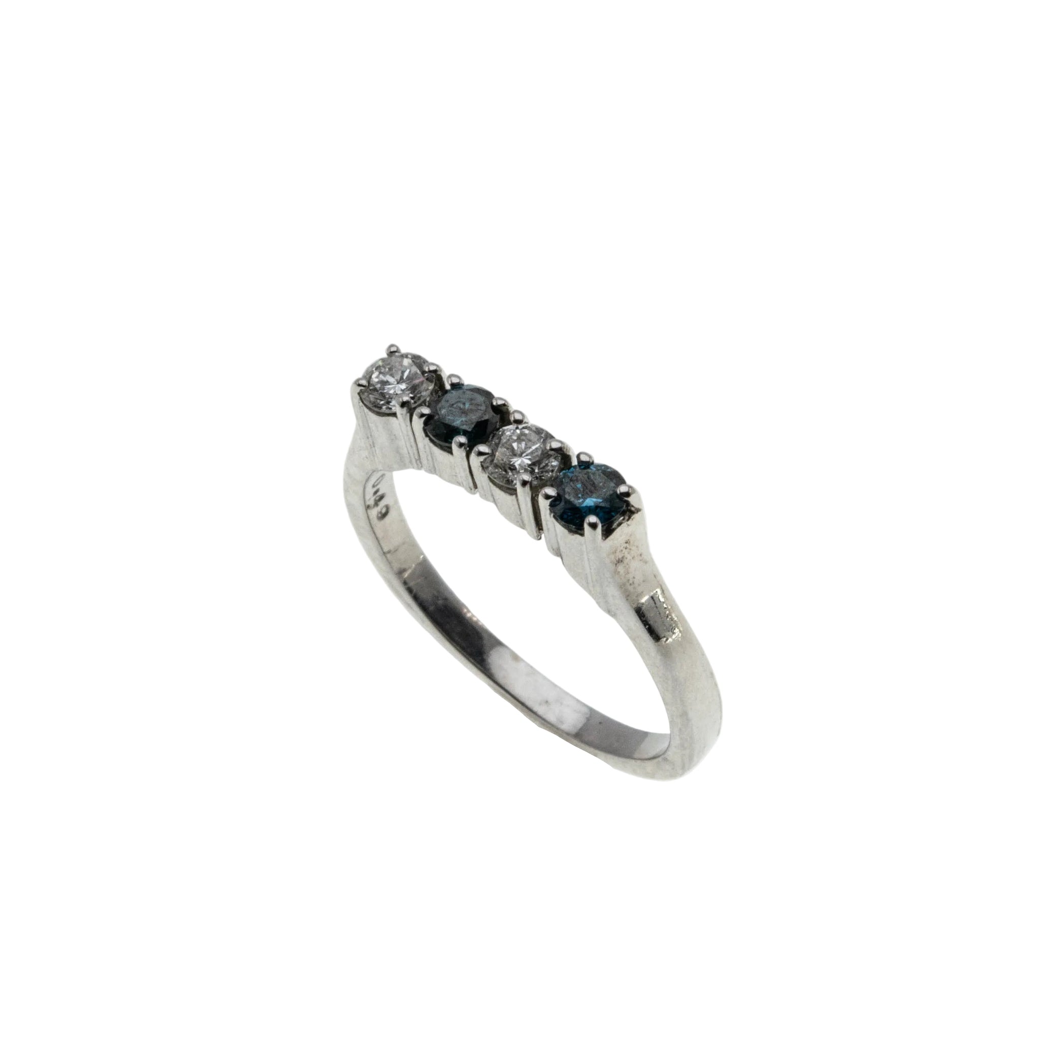 Blue & White Sparkler - Vintage 14K White Gold Natural Blue & White Diamond Ring. This gorgeous ring is crafted from 14K white gold, hallmarked 14K. The ring features two natural round brilliant cut diamonds, two natural blue diamonds (treated), classic vintage styling, and quality craftsmanship. This ring is comprised of expertly claw-set alternating blue and white diamonds. The clear diamonds are white, whilst the blue diamonds display a beautiful teal/blue colour. All the precious diamonds sparkle beautifully, and the combination of the blue and white add contrast, and beauty to the ring. The gallery on this ring is solid white gold, as oppose to open baskets, however the settings at the Botton are open for easy cleaning. The band of the ring has a slight taper. It is smooth , and polished, which allows for easy sizing, and a comfortable fit. This vintage ring looks amazing on its own, matched up to another ring, or as a stacker.