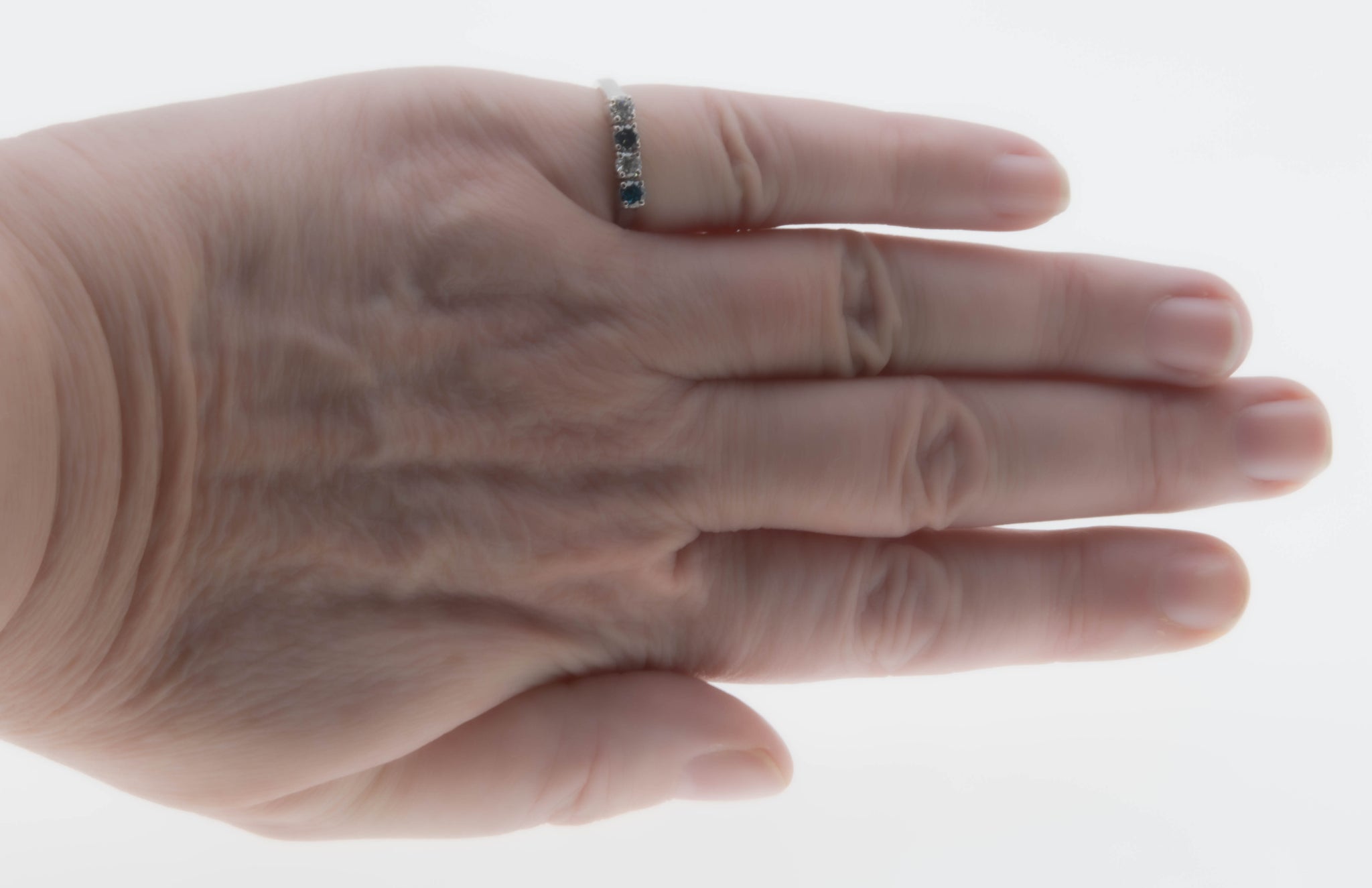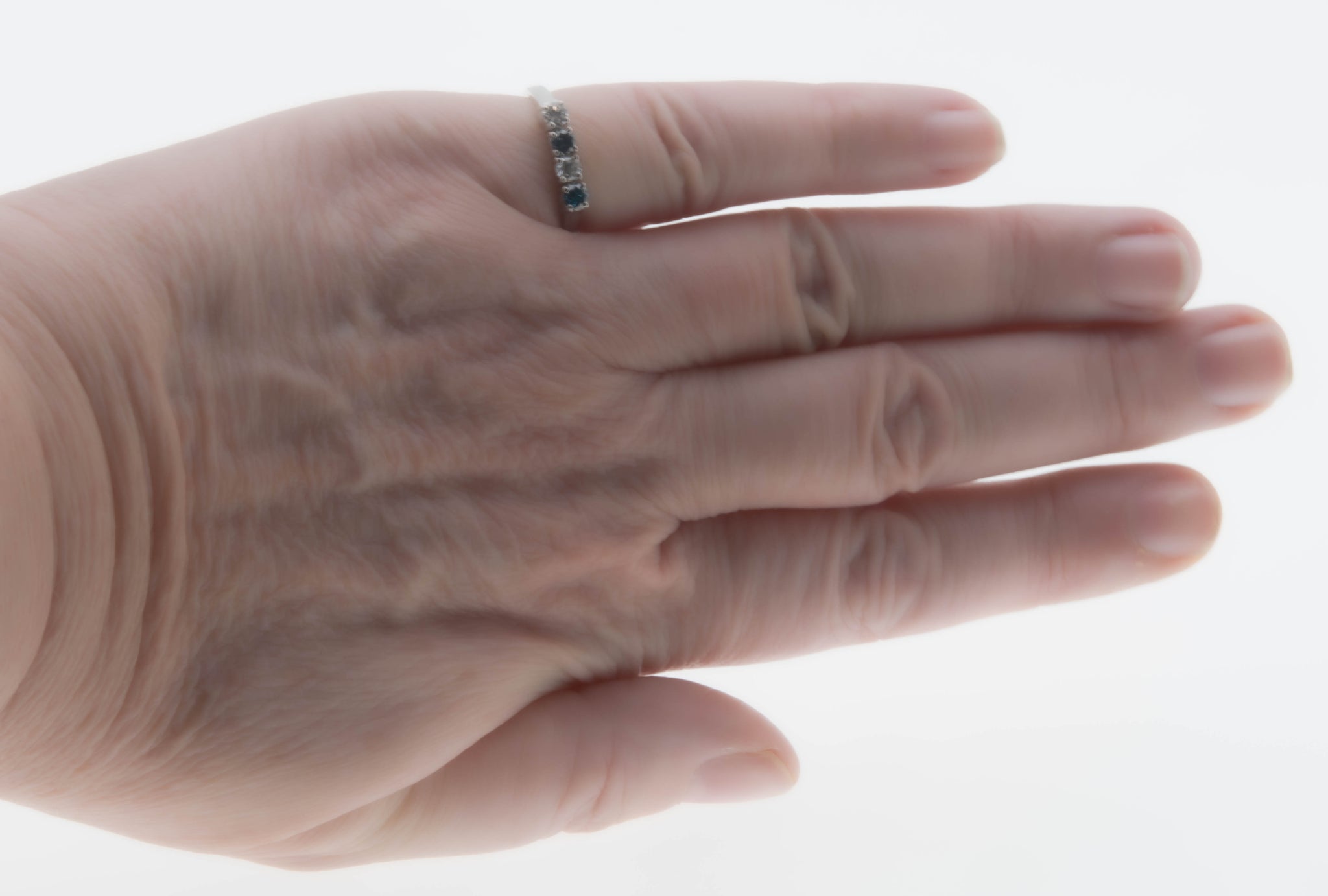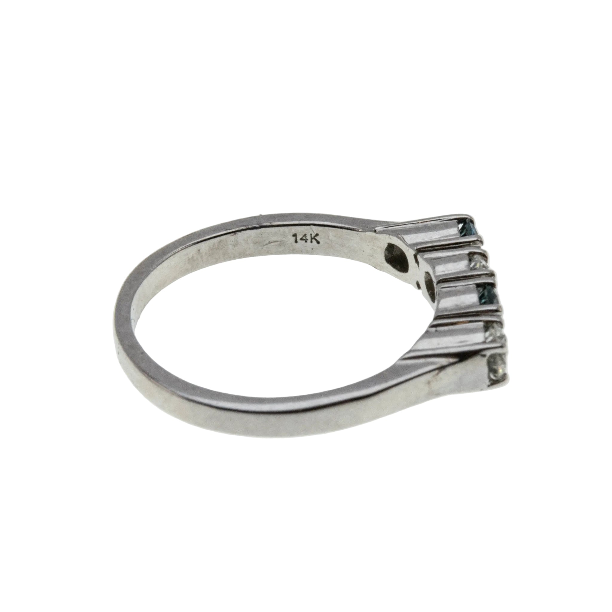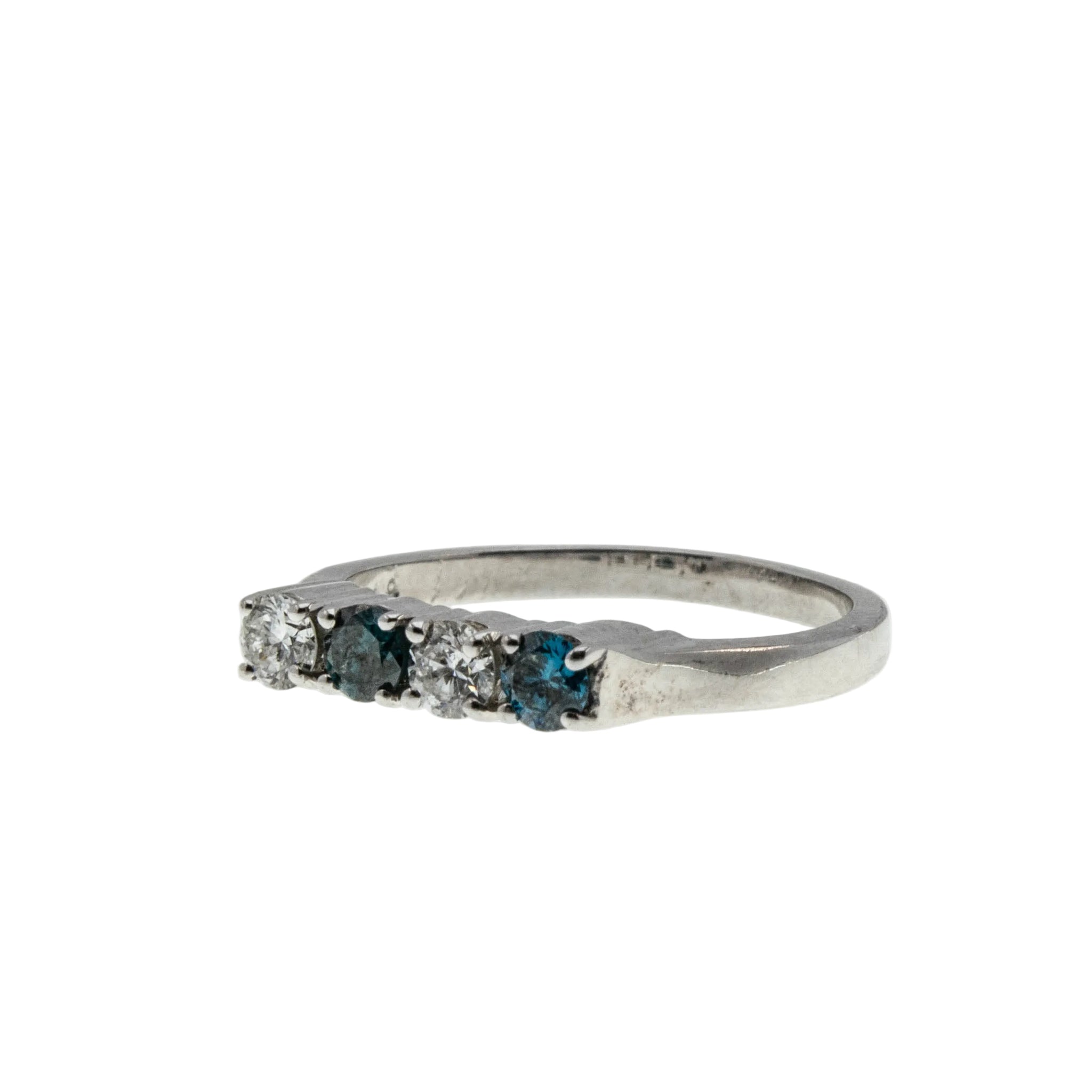 Blue & White Sparkler - Vintage 14K White Gold Natural Blue & White Diamond Ring. This gorgeous ring is crafted from 14K white gold, hallmarked 14K. The ring features two natural round brilliant cut diamonds, two natural blue diamonds (treated), classic vintage styling, and quality craftsmanship. This ring is comprised of expertly claw-set alternating blue and white diamonds. The clear diamonds are white, whilst the blue diamonds display a beautiful teal/blue colour. All the precious diamonds sparkle beautifully, and the combination of the blue and white add contrast, and beauty to the ring. The gallery on this ring is solid white gold, as oppose to open baskets, however the settings at the Botton are open for easy cleaning. The band of the ring has a slight taper. It is smooth , and polished, which allows for easy sizing, and a comfortable fit. This vintage ring looks amazing on its own, matched up to another ring, or as a stacker.