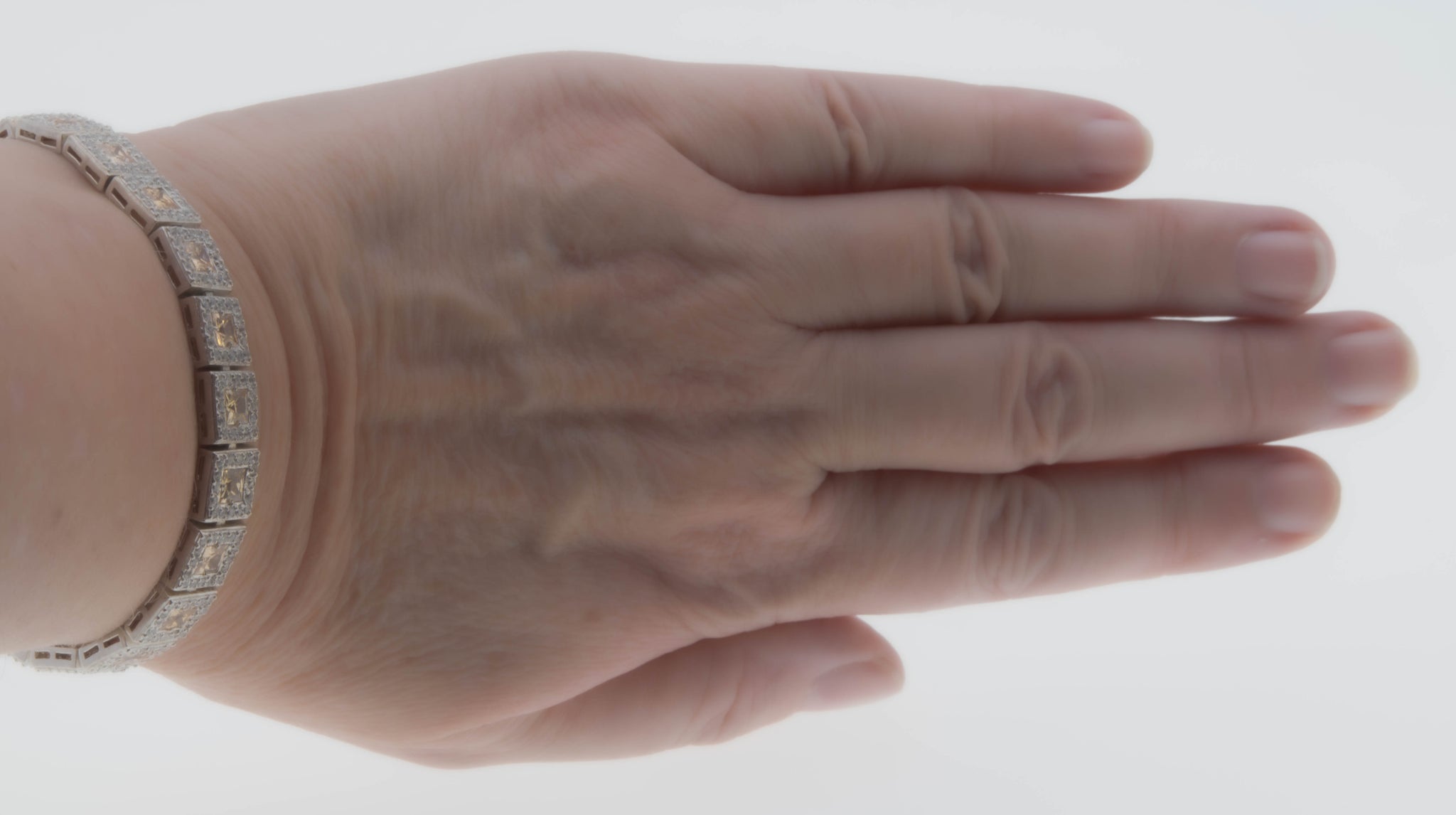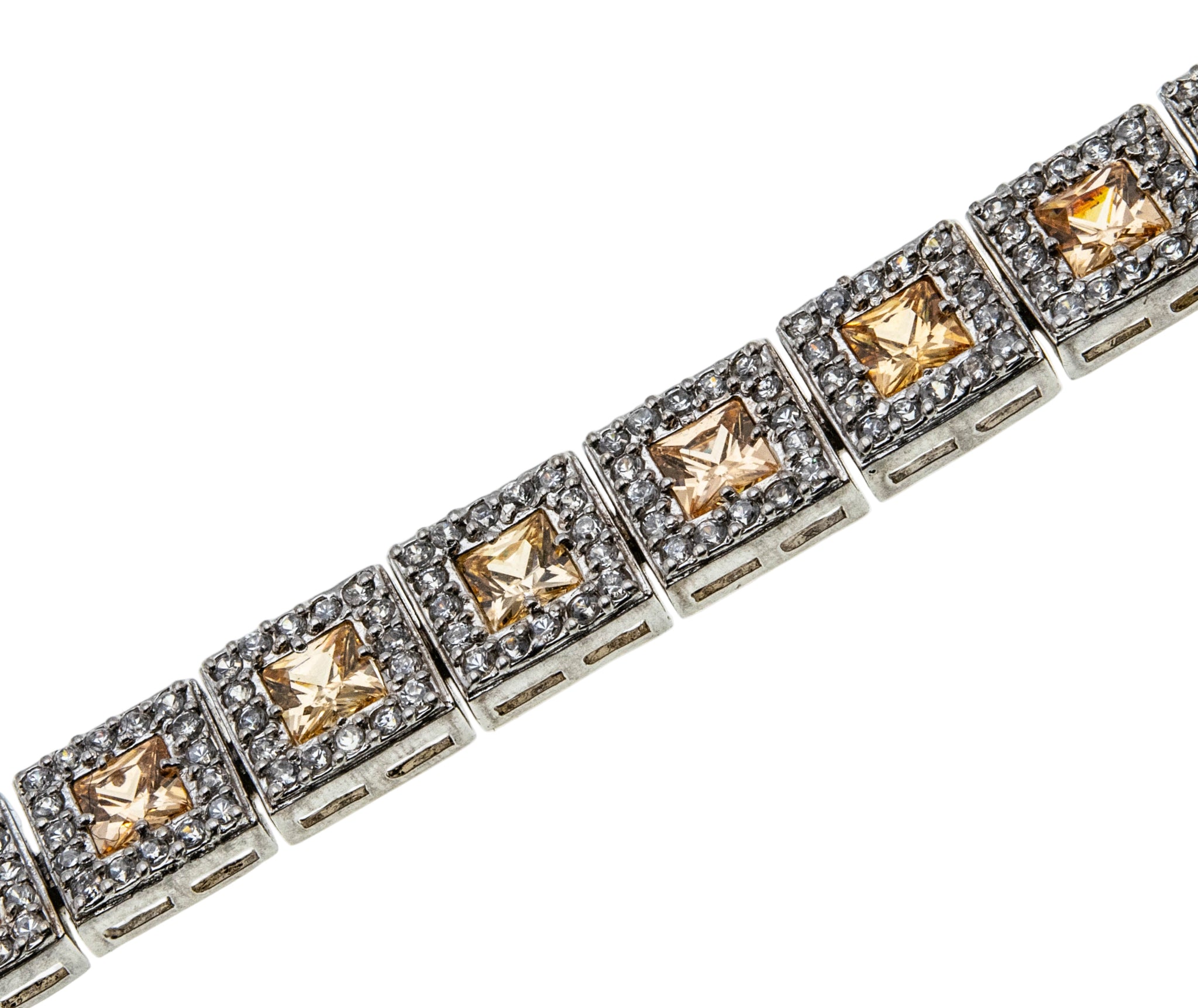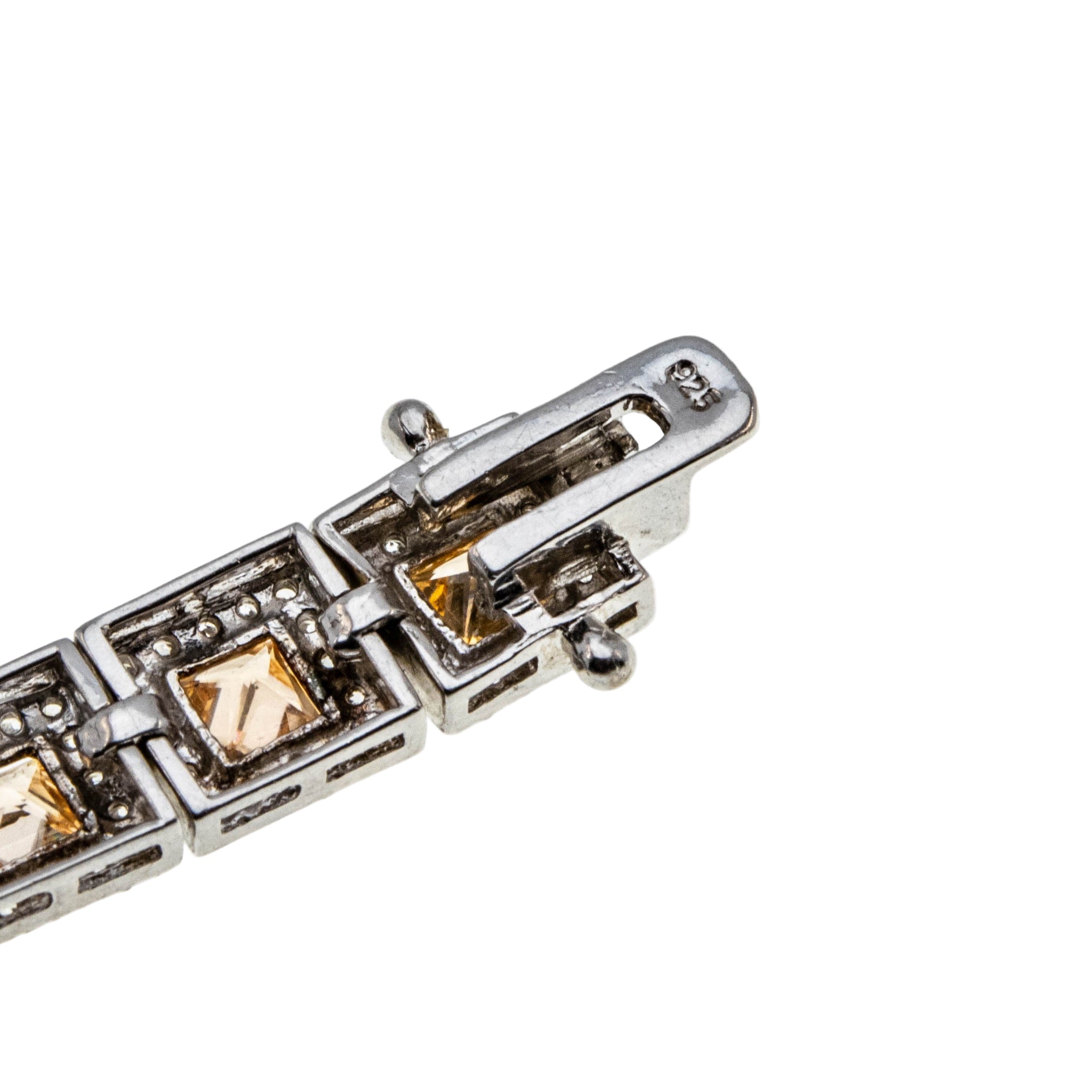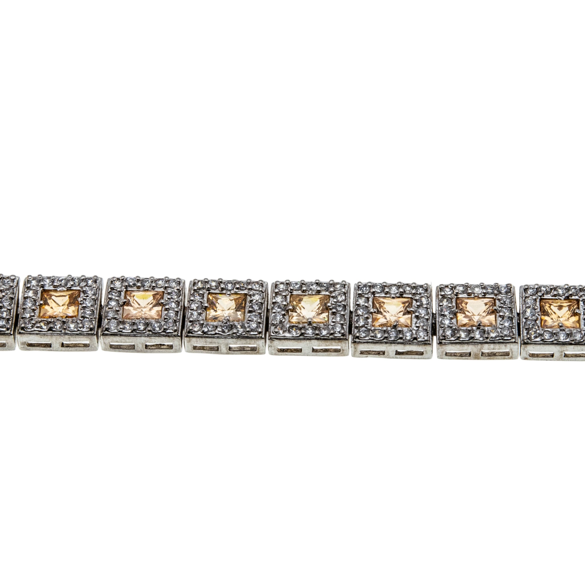 Canary Yellow Adornment - Vintage Sterling Silver Radiant Cut Cubic Zirconia Tennis Bracelet. This gorgeous tennis bracelet is crafted from sterling silver, hallmarked 925. The bracelet features 20 radiant cut cubic zirconias, numerous round cut cubic zirconias, classic styling, and quality craftsmanship. This stunning bracelet is created with square silver segments, which are adorned with sparkling canary yellow and clear cubic zirconia gemstones. The bracelet segments are connected to pins, which allows the bracelet to be flexible, and comfortable to wear. The bracelet features a sliding lock, and two safety hook locks, for additional security. This vintage bracelet is well made, and in fact can be mistaken for natural diamonds, since the gemstones are full of life and sparkle. Truly a wonderful piece for any jewelry collection.