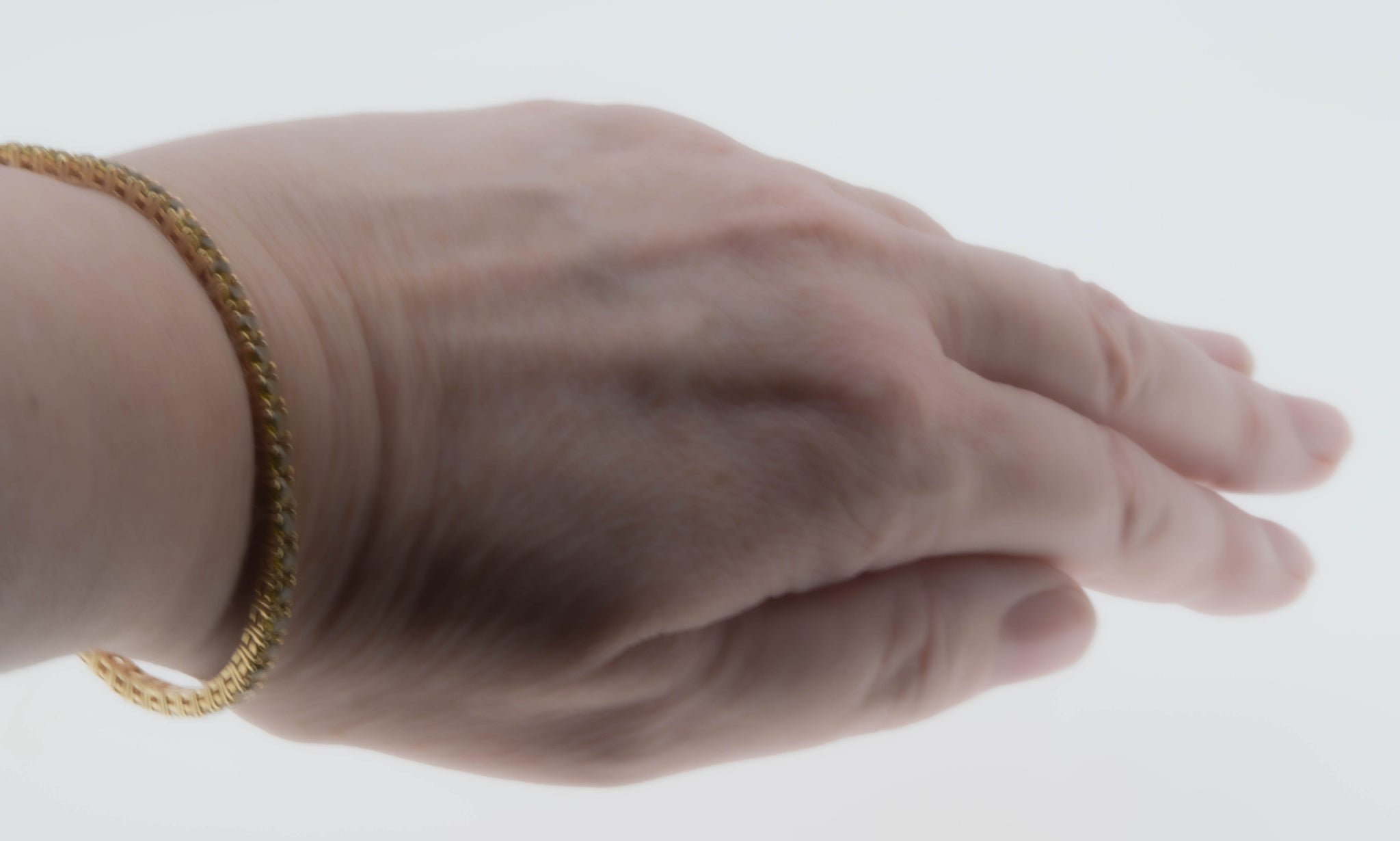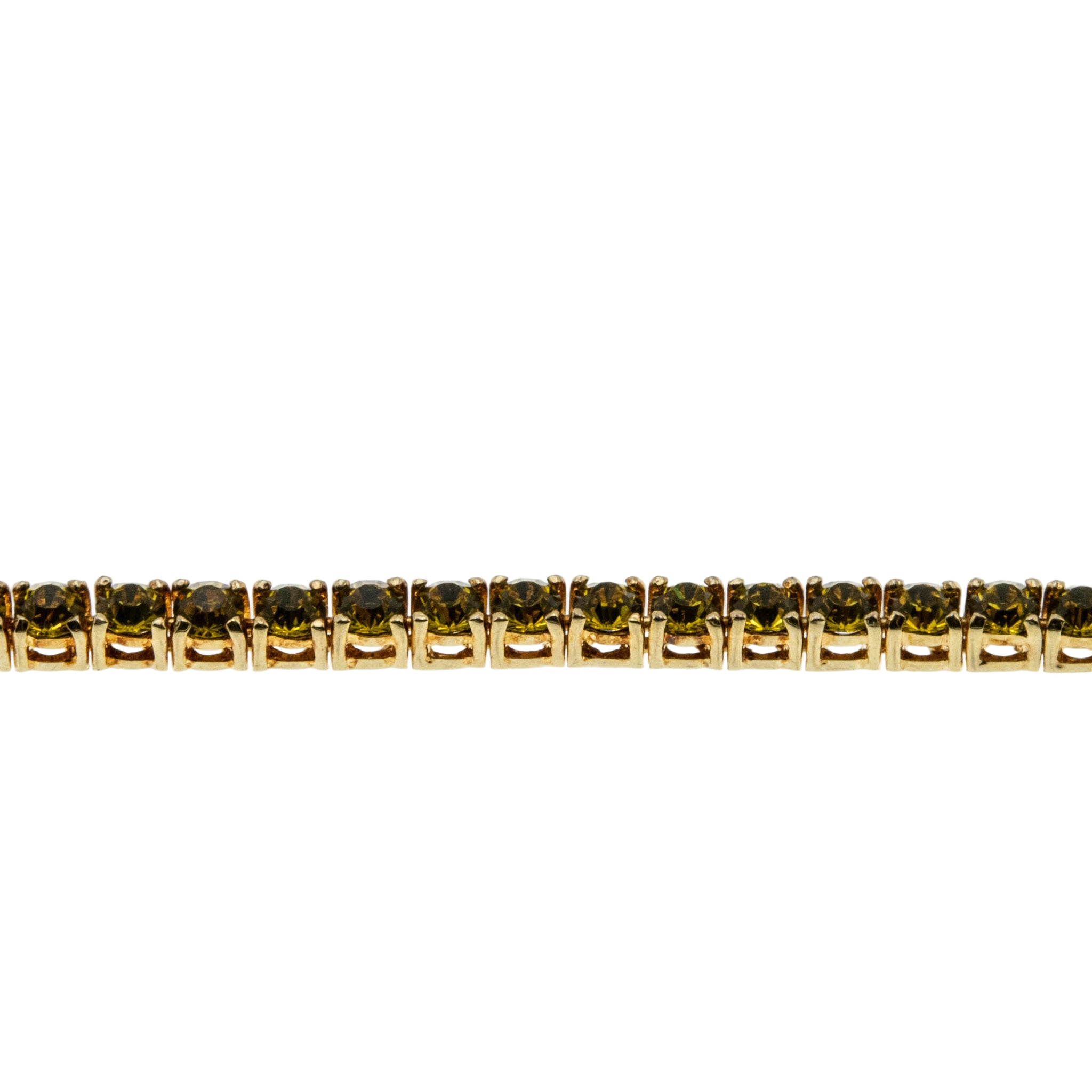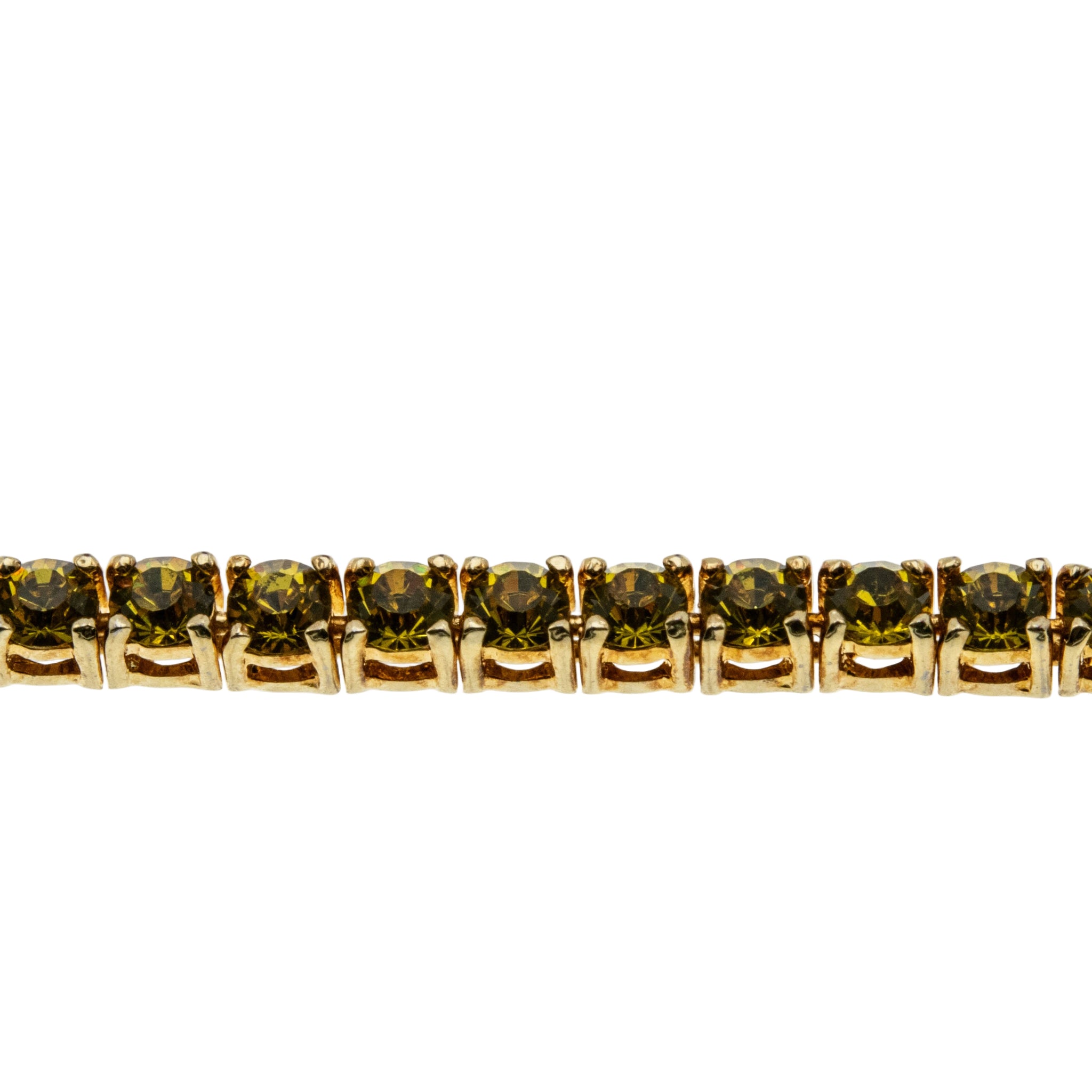Canary Yellow - Vintage Signed 'Joan Rivers' Gold Plated Crystal Tennis Bracelet. This pretty bracelet is crafted from gold plate over metal. The bracelet features numerous round cut crystals, classic vintage styling, and quality craftsmanship. This bracelet is comprised of expertly claw-set vibrant canary yellow crystals, which are set completely around the entire bracelet. The bracelet has a slide-type lock, and two hook-type locks for additional security. This vintage bracelet looks great on its own or stacked with other bracelets.